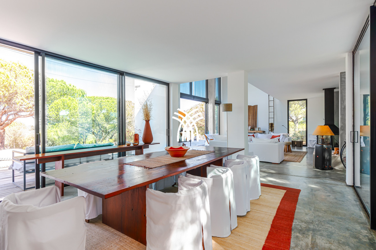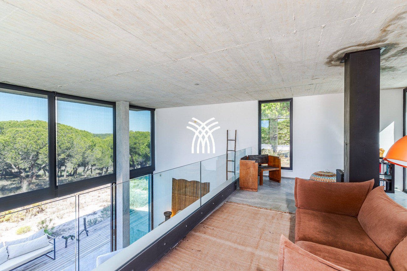 At the heart of the home, the open-plan living area brings together the living room, dining space, and fully equipped kitchen in a fluid composition designed for shared moments and relaxed elegance. This space extends naturally onto a generous 90-square-meter deck, partially shaded for al fresco dining, which leads to the inviting swimming pool and a distinctive 500-square-meter sand garden. Together, they form an idyllic indoor-outdoor environment where days unfold at an unhurried pace under the Comporta sun.