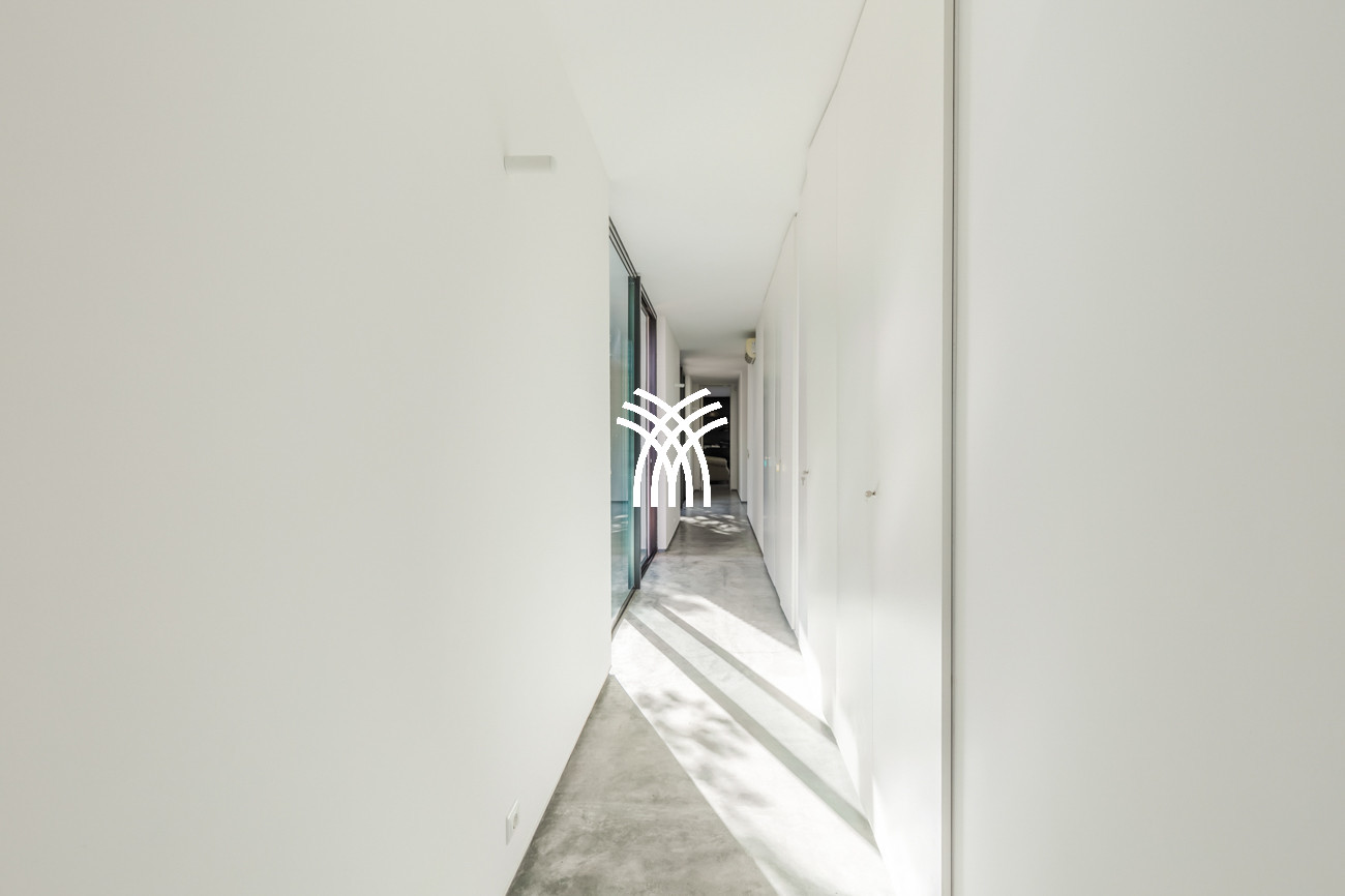 Inside, the villa reveals luminous interiors shaped by generous windows that bathe crisp white walls and ceilings in natural light. Subtle bursts of colour introduced through artwork, textiles, and decorative details enrich the minimalist palette, while white wood elements and natural parquet floors add warmth and texture, resulting in a sophisticated yet inviting aesthetic. This harmonious design extends into the bedrooms, where serene white wood finishes are enhanced by richly coloured drapes and curated art pieces, offering an atmosphere of calm elegance and effortless comfort.