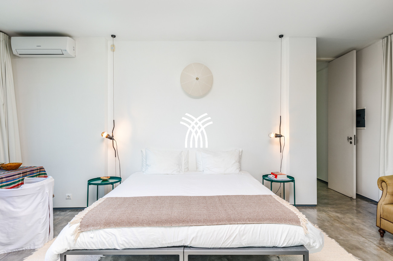 The outdoor spaces provide a serene retreat, centred around a private swimming pool and comfortable day beds that invite relaxation under the warm Portuguese sun. Surrounded by the open horizons of the rice fields, the villa offers an immersive connection to nature, where silence, light, and landscape come together in perfect harmony.