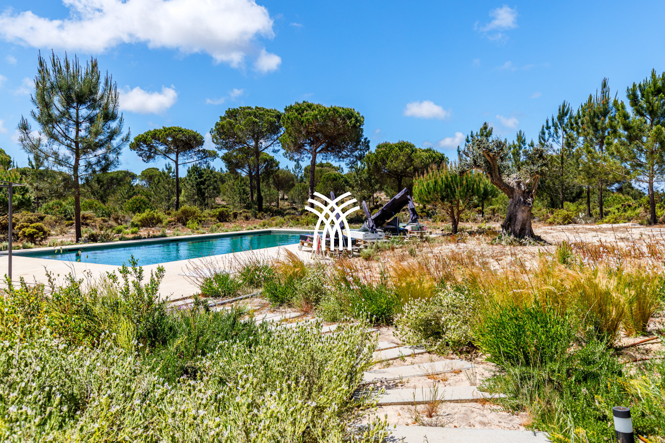 Outdoors, the villa reveals its true magic. Sunbeds surrounding the infinity pool offer an idyllic setting for slow, sunlit afternoons, while the shaded sunset area becomes a natural gathering point for long alfresco dinners and memorable evenings shared with loved ones. Nature trails winding through the landscape lead toward the sea, offering opportunities for peaceful walks and quiet exploration, where the spirit of Comporta reveals itself in its most authentic form.