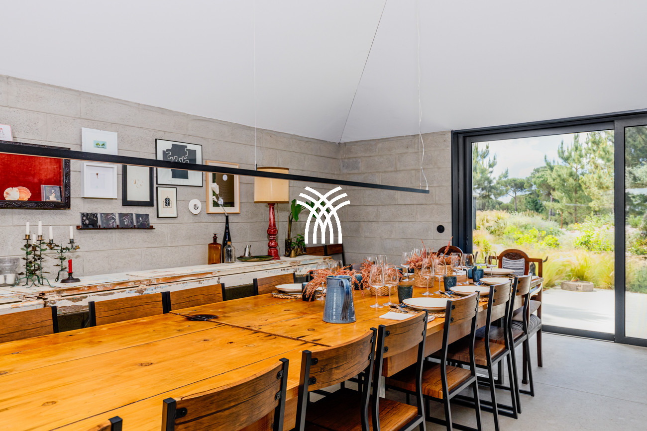 Barefoot mornings unfold across cool concrete floors, while subtle touches of vibrant color introduce warmth and artistic expression throughout the interiors. The spacious living and dining area flows effortlessly into a fully equipped open kitchen, forming a central space designed for connection, relaxation, and shared moments. From the living room, uninterrupted views extend across the garden and swimming pool toward the pine forest beyond, immersing guests in the tranquil rhythm of Comporta’s natural environment.