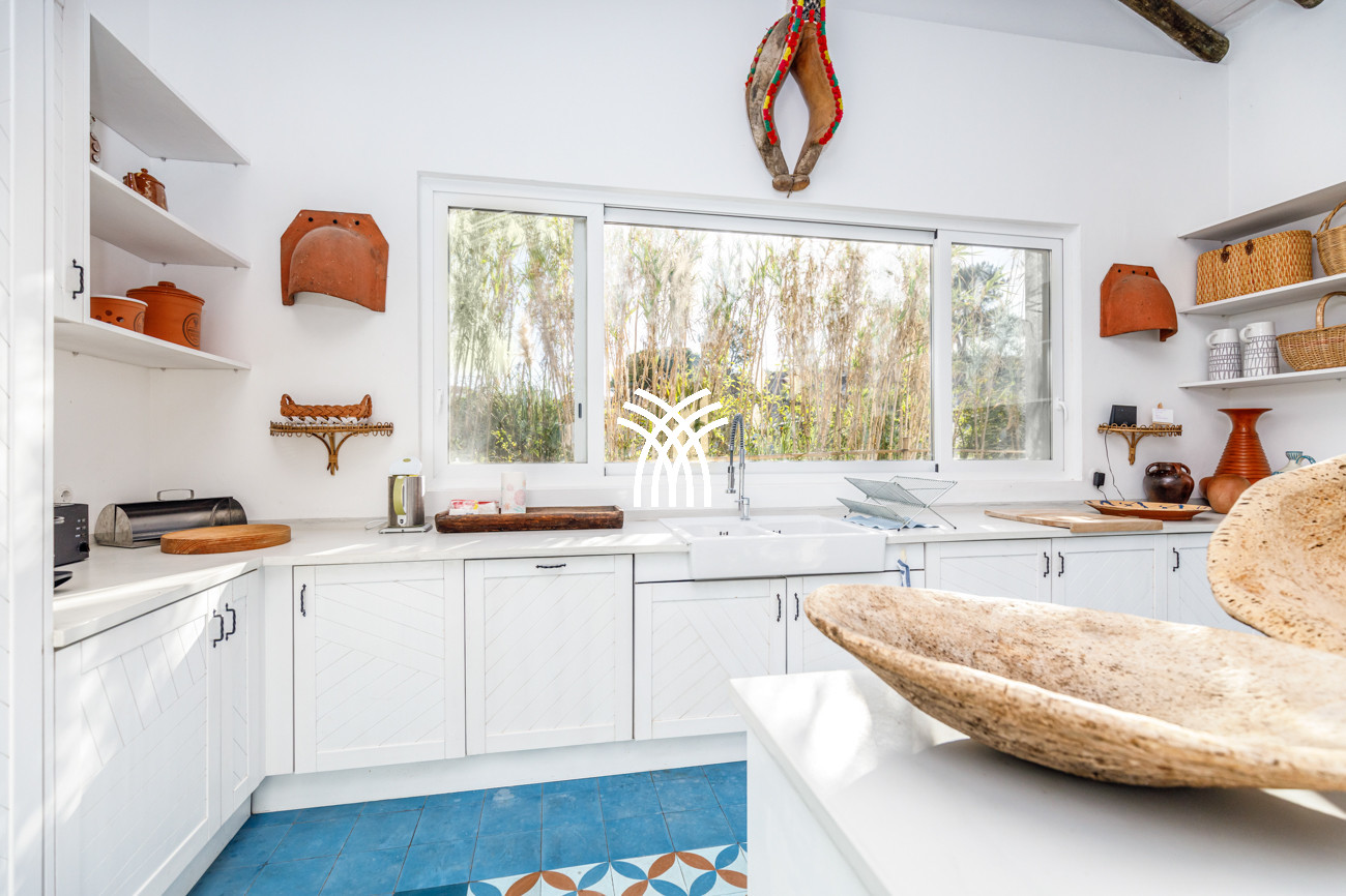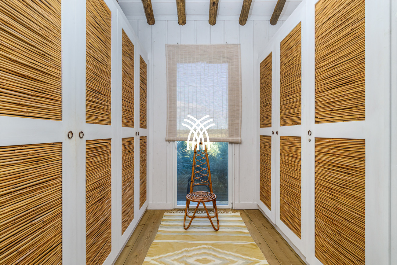 From the moment you step inside, a sense of calm and harmony unfolds. The central gallery hallway, crowned by a thatched ceiling, leads gracefully into the open-concept living spaces, where contemporary comfort blends seamlessly with artisanal charm. The fully equipped modern kitchen invites creative culinary moments, while the expansive dining table and elegant sofas create an inviting setting for shared evenings and relaxed conversations. Wooden floors and furnishings, straw accents, rattan lighting, and bamboo details evoke the golden hues of sand and sunlight, infusing the interiors with warmth and character.