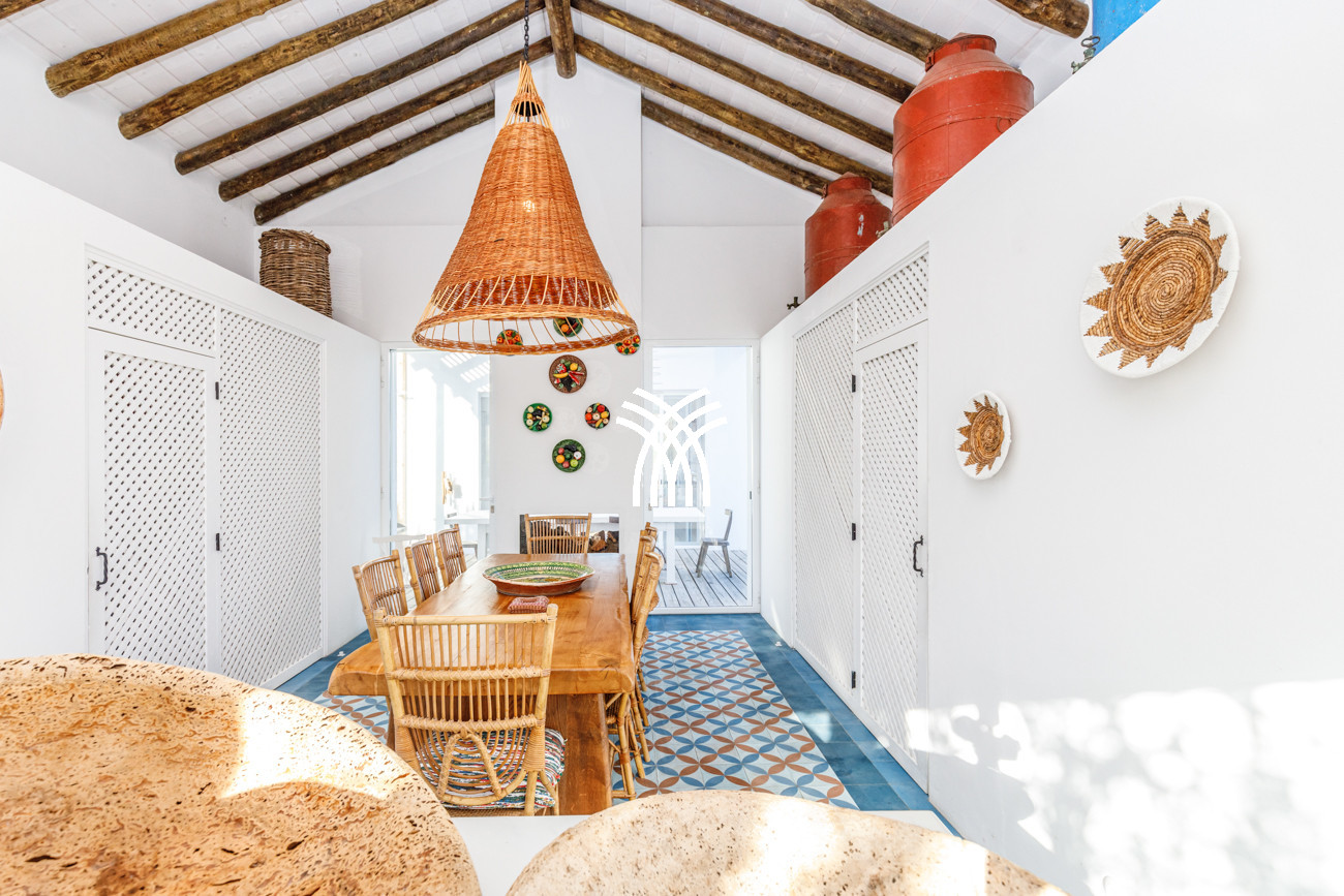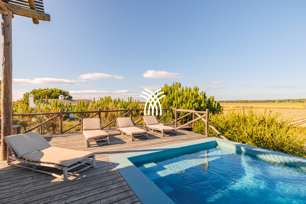 Outside, a lush garden framed by mature trees opens onto picturesque views of the rice fields, creating a poetic backdrop that defines the essence of Comporta. The private swimming pool invites leisurely days under the sun, while shaded terraces offer the perfect setting for reading, cocktails, and intimate gatherings. As night falls, starlit evenings on the terrace become unforgettable moments of quiet beauty and connection.