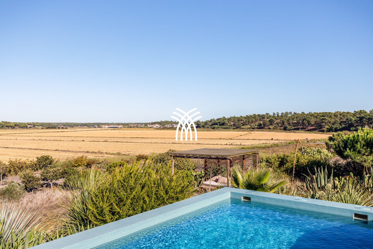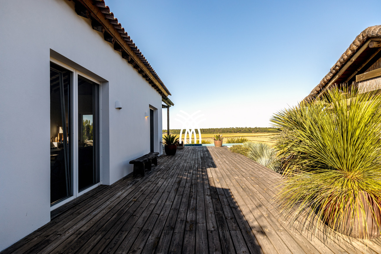 Set within lush greenery across an expansive 23-hectare estate, Villa Kimchi is a striking contemporary residence where architectural precision and natural beauty come together in perfect harmony. Defined by clean lines and elegant wooden shutters, this architect-designed home embodies understated modern charm while offering access to an infinity swimming pool shared with two other villas on the same vast property, creating an atmosphere of refined exclusivity that captures the spirit of a luxury villa rental Portugal and an authentic luxury villa rental Comporta.