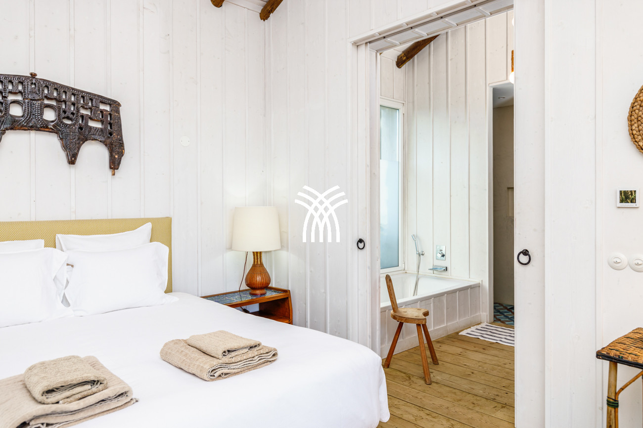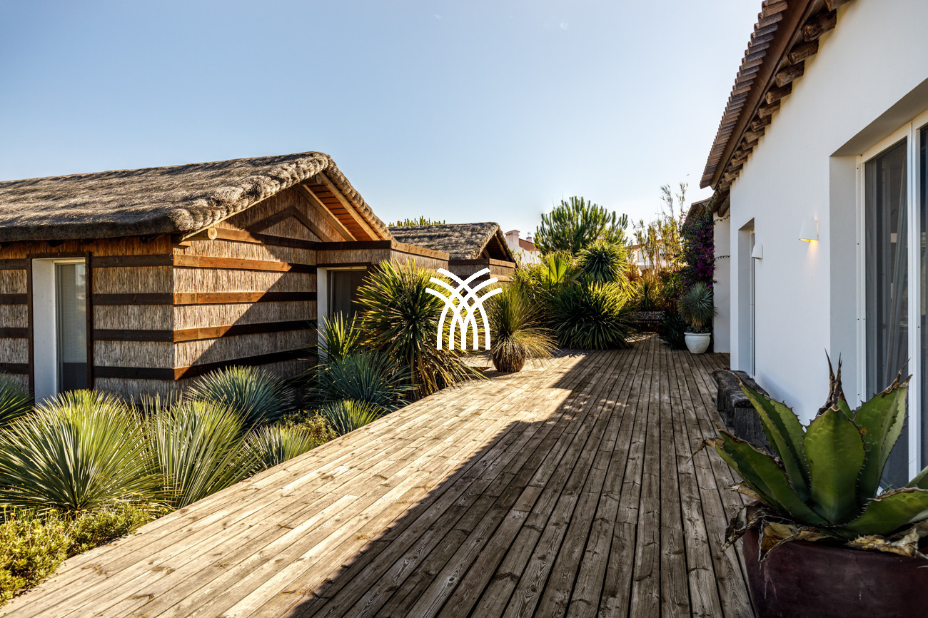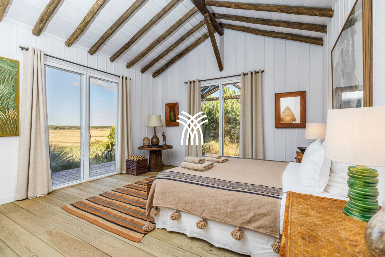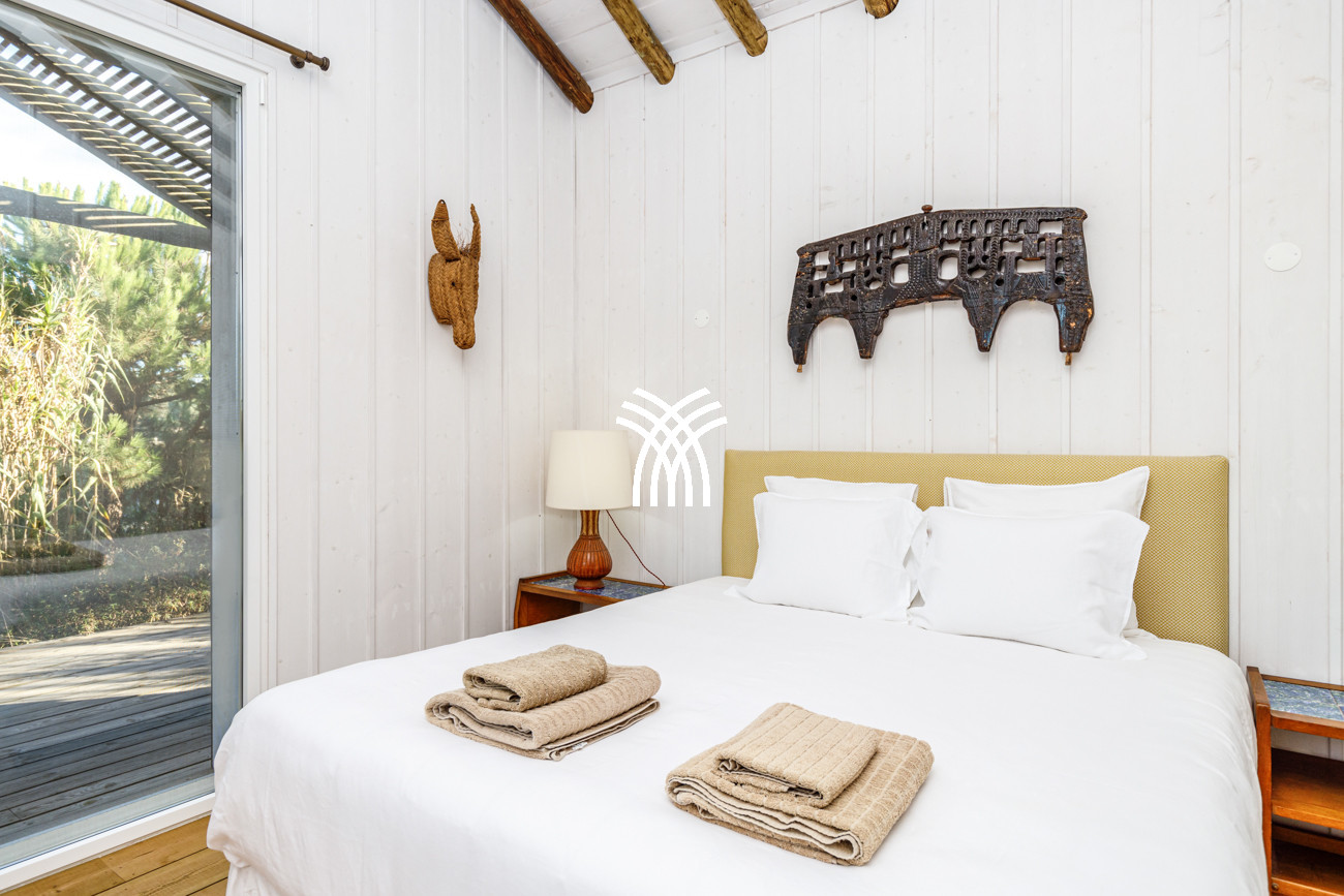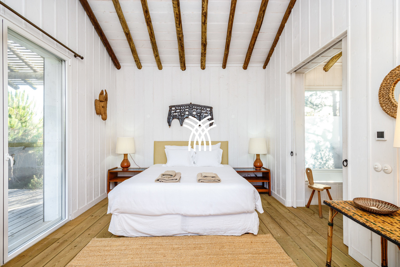 At the heart of the home, the open-plan living area brings together the living room, dining space, and fully equipped kitchen in a fluid composition designed for shared moments and relaxed elegance. This space extends naturally onto a generous 90-square-meter deck, partially shaded for al fresco dining, which leads to the inviting swimming pool and a distinctive 500-square-meter sand garden. Together, they form an idyllic indoor-outdoor environment where days unfold at an unhurried pace under the Comporta sun.