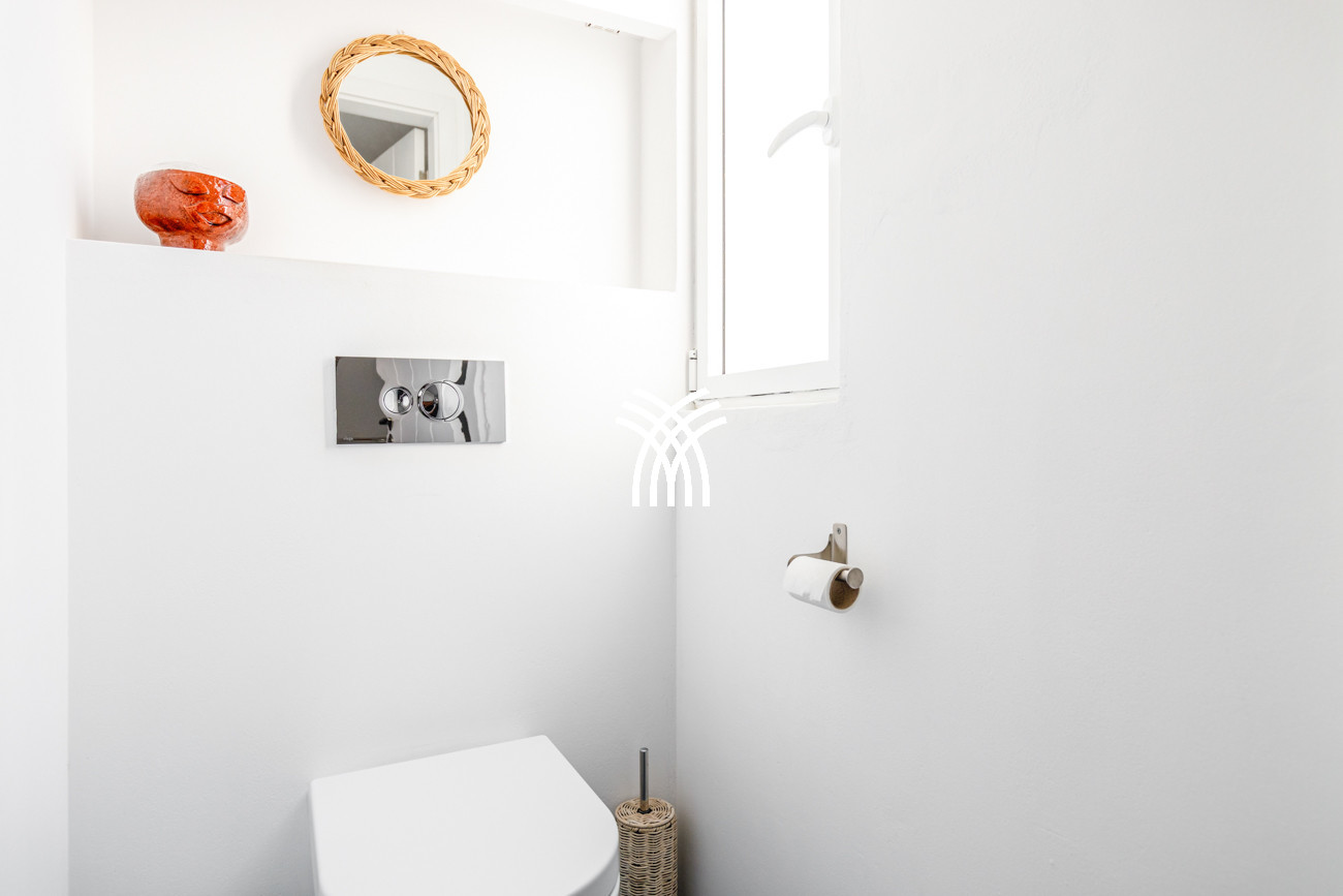 Inside, the villa reveals luminous interiors shaped by generous windows that bathe crisp white walls and ceilings in natural light. Subtle bursts of colour introduced through artwork, textiles, and decorative details enrich the minimalist palette, while white wood elements and natural parquet floors add warmth and texture, resulting in a sophisticated yet inviting aesthetic. This harmonious design extends into the bedrooms, where serene white wood finishes are enhanced by richly coloured drapes and curated art pieces, offering an atmosphere of calm elegance and effortless comfort.