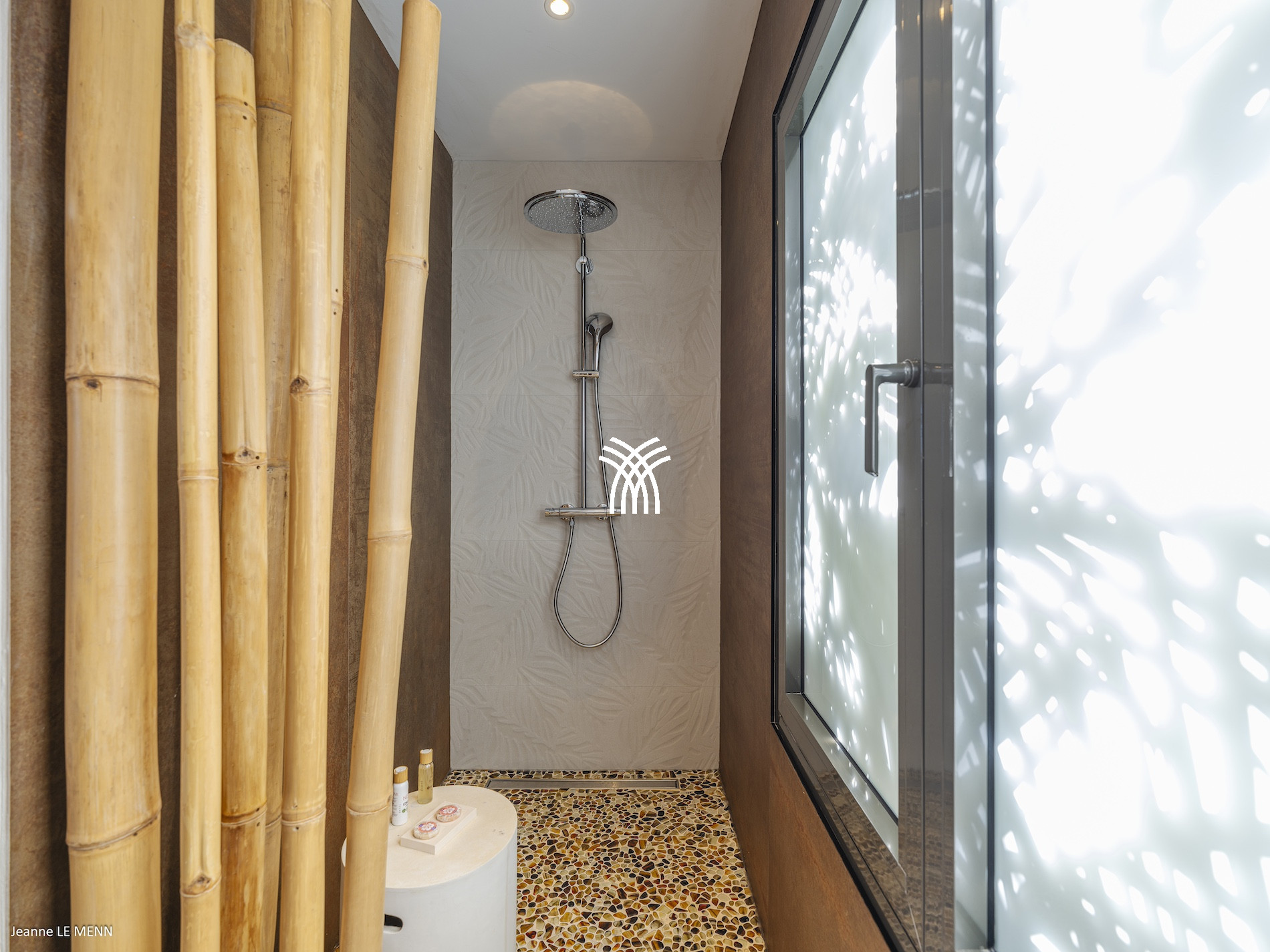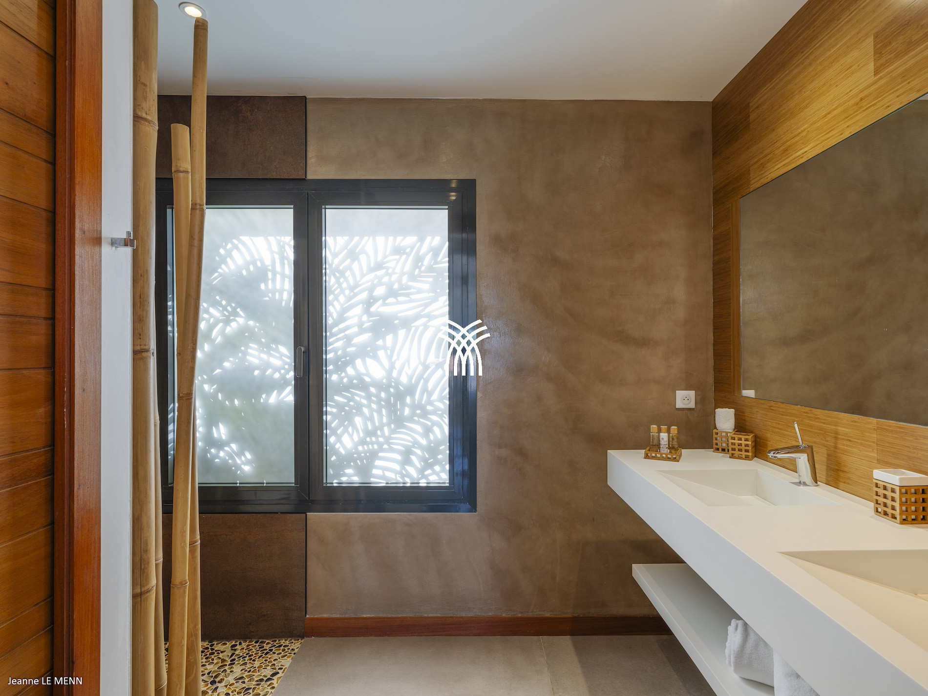 The exteriors of this prestigious villa are designed for relaxation and conviviality. A large wooden terrace, a heated infinity pool with sea view, a lounge area, and an outdoor dining space allow you to fully experience the rhythm of the Caribbean, facing the ocean.