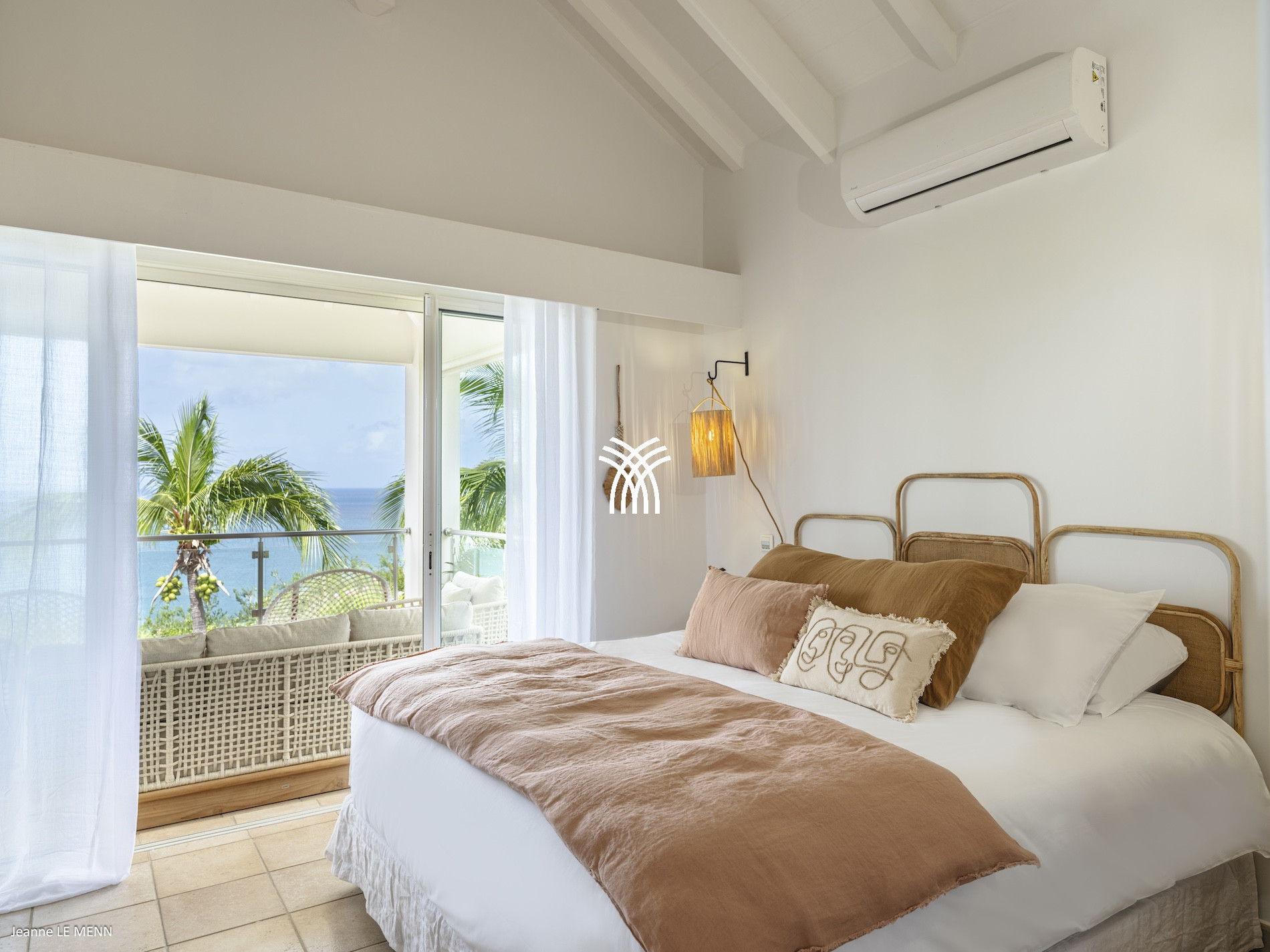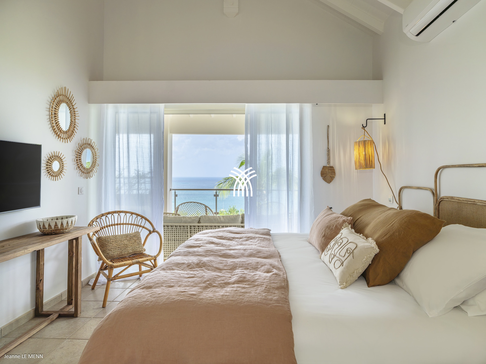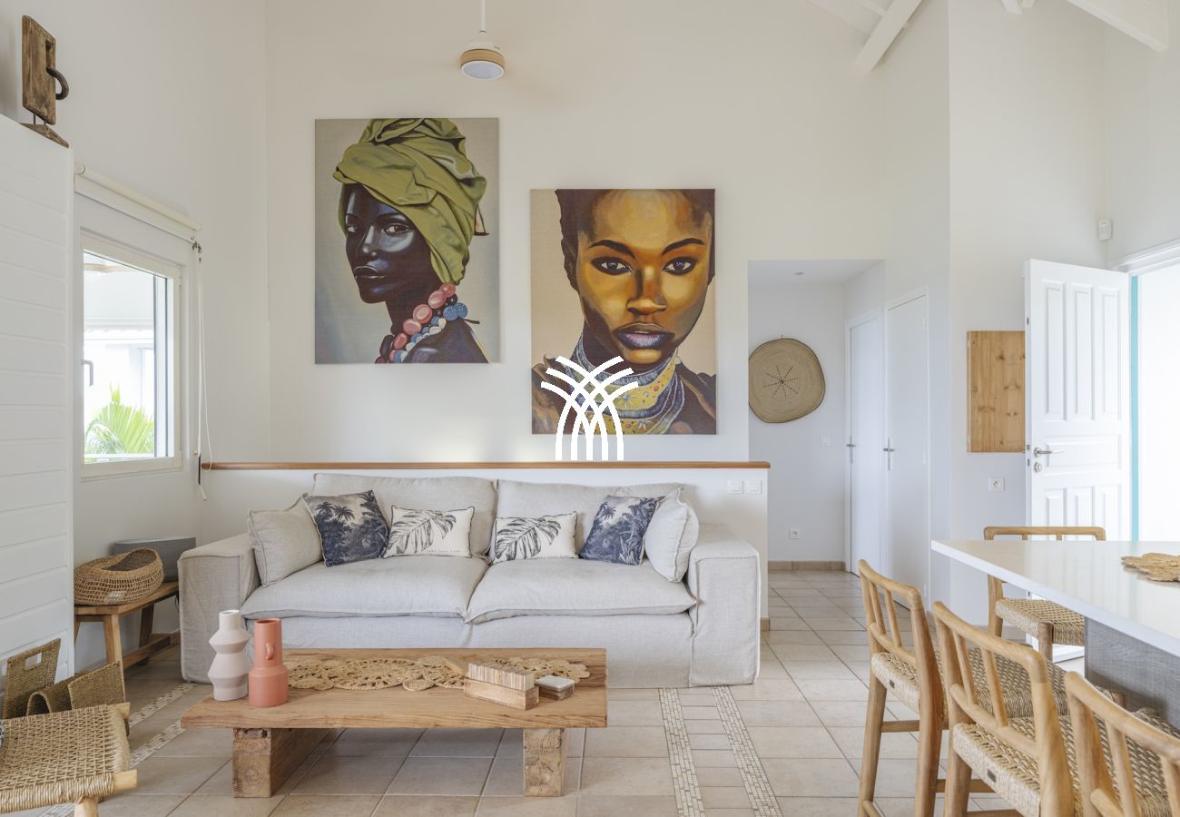 Built on two levels, the Villa Be Happy captivates with its modern design, luminous spaces, and high-end amenities. The main level features a vast living space bathed in light, opening onto a large terrace with a spectacular sea view. A first bedroom, elegant and comfortable, is located on this same level for practical access and optimal comfort.