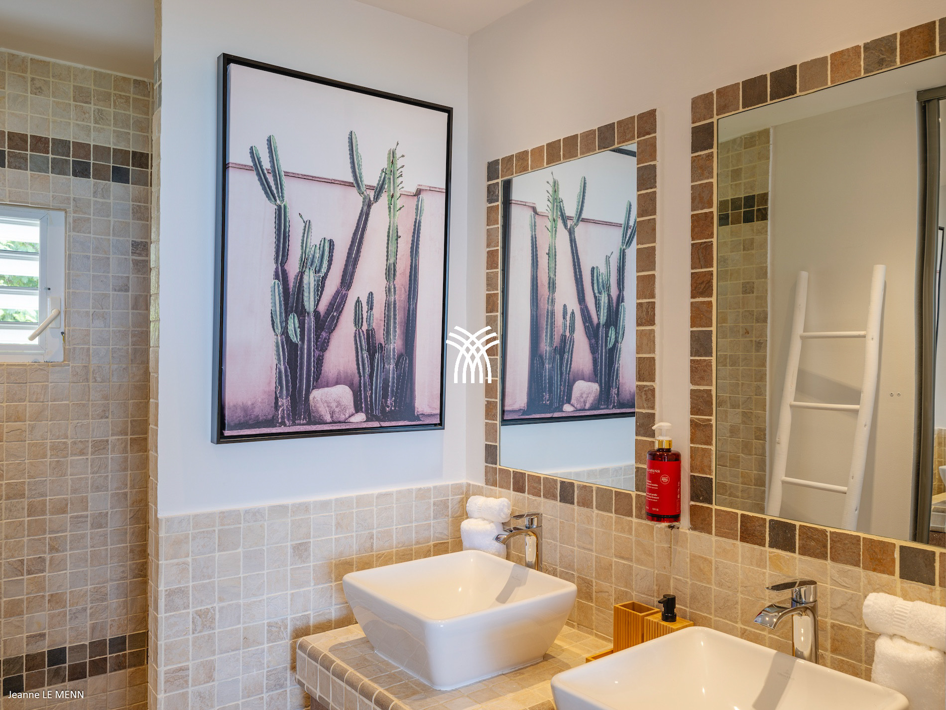 At the lower level, two other rooms, decorated with refinement, open directly onto the villa's private pool. This intimate space is ideal for relaxing by the water, admiring the surrounding landscapes, or refreshing oneself at any time of the day. Each room has its own private bathroom to ensure comfort and privacy for all guests.