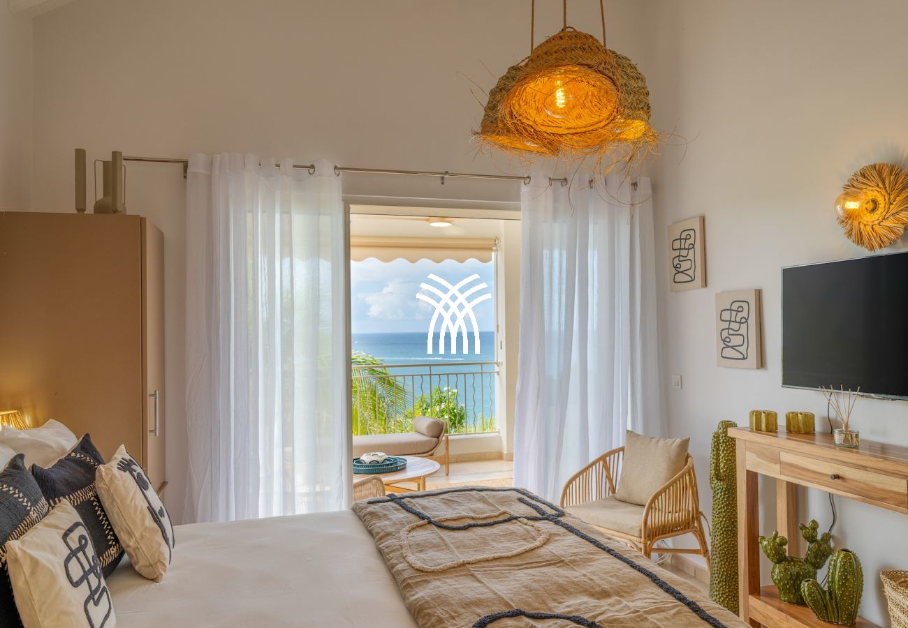 Built on two levels, the Villa Be Happy captivates with its modern design, luminous spaces, and high-end amenities. The main level features a vast living space bathed in light, opening onto a large terrace with a spectacular sea view. A first bedroom, elegant and comfortable, is located on this same level for practical access and optimal comfort.