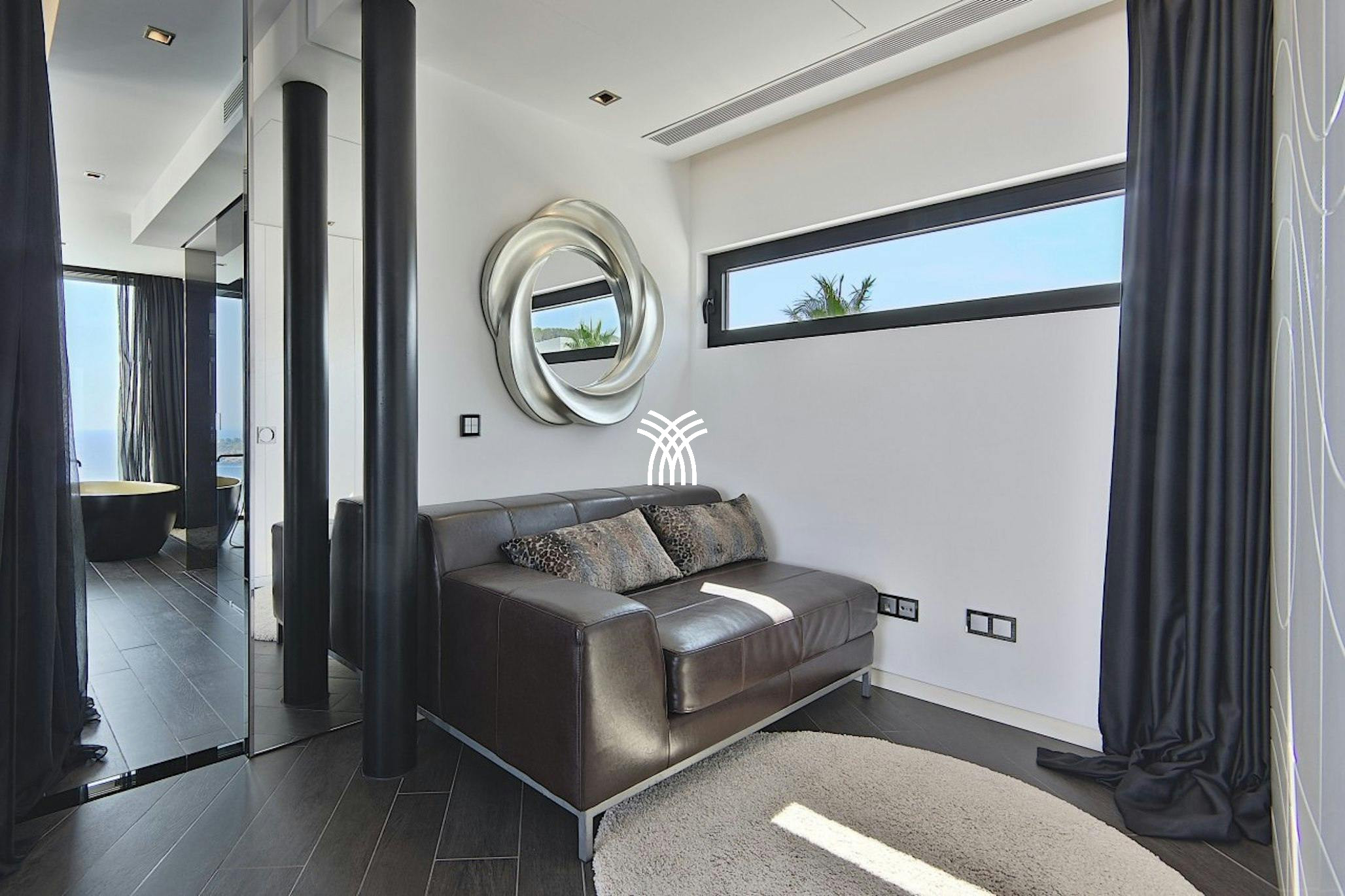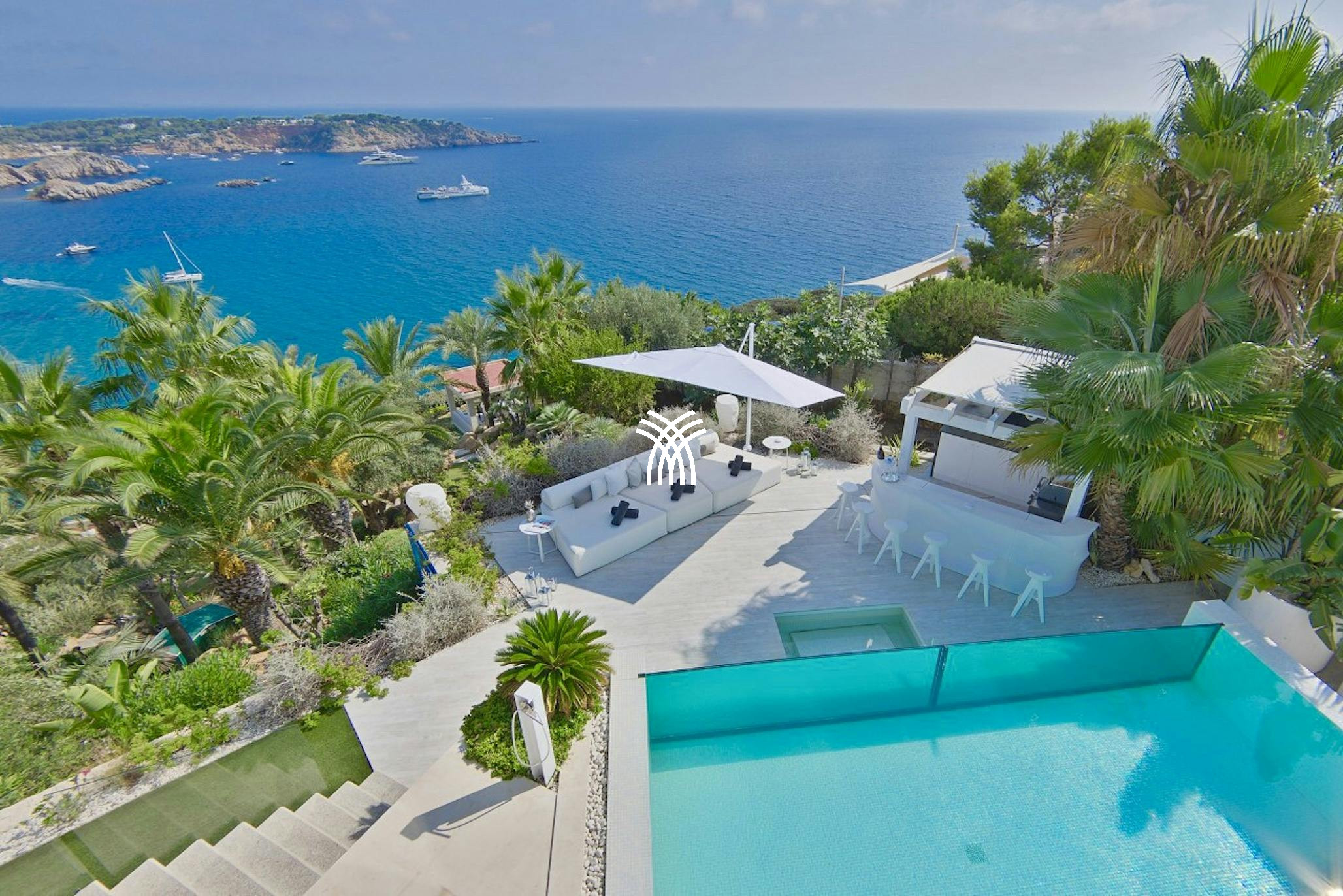 Perched above the sea, the villa’s terraced gardens and expansive outdoor living areas are designed to capture the essence of Ibiza’s laid-back luxury. A shaded dining area for ten overlooks the horizon, while the heated infinity pool seamlessly blends into the landscape, bordered by a glass wall and leading to a lower sun terrace with a stylish al-fresco bar. This vibrant bar space includes a barbecue, dining for six, and a Sonos sound system—perfect for entertaining under the sun or stars.