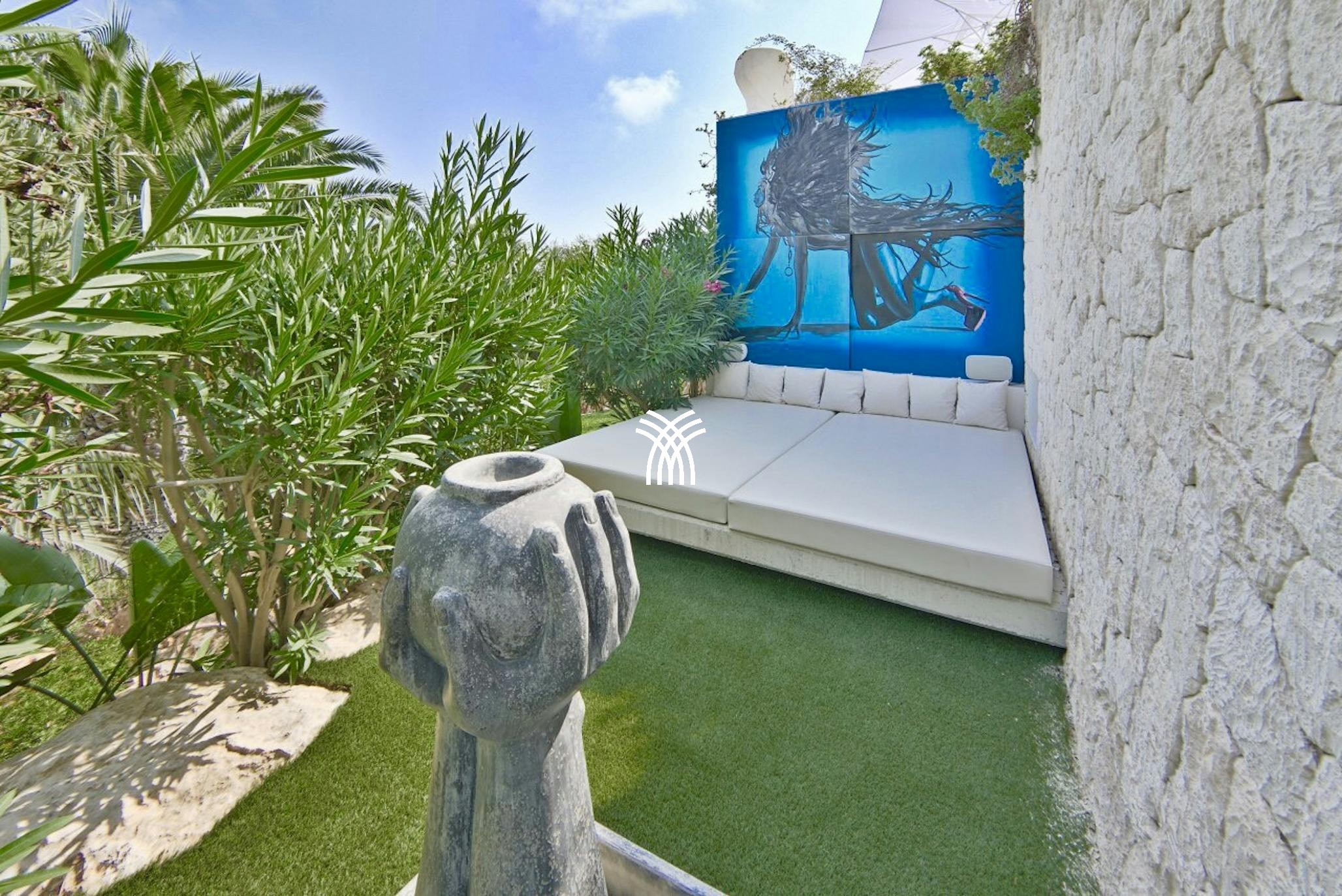 Tucked within the garden is a Bali-style pavilion, offering a shaded retreat with a daybed, dining area, swing bench and comfortable lounge seating — an ideal setting for lazy afternoons or sunset dinners. A second terrace offers additional outdoor space to relax and soak in the Ibizan sunshine.