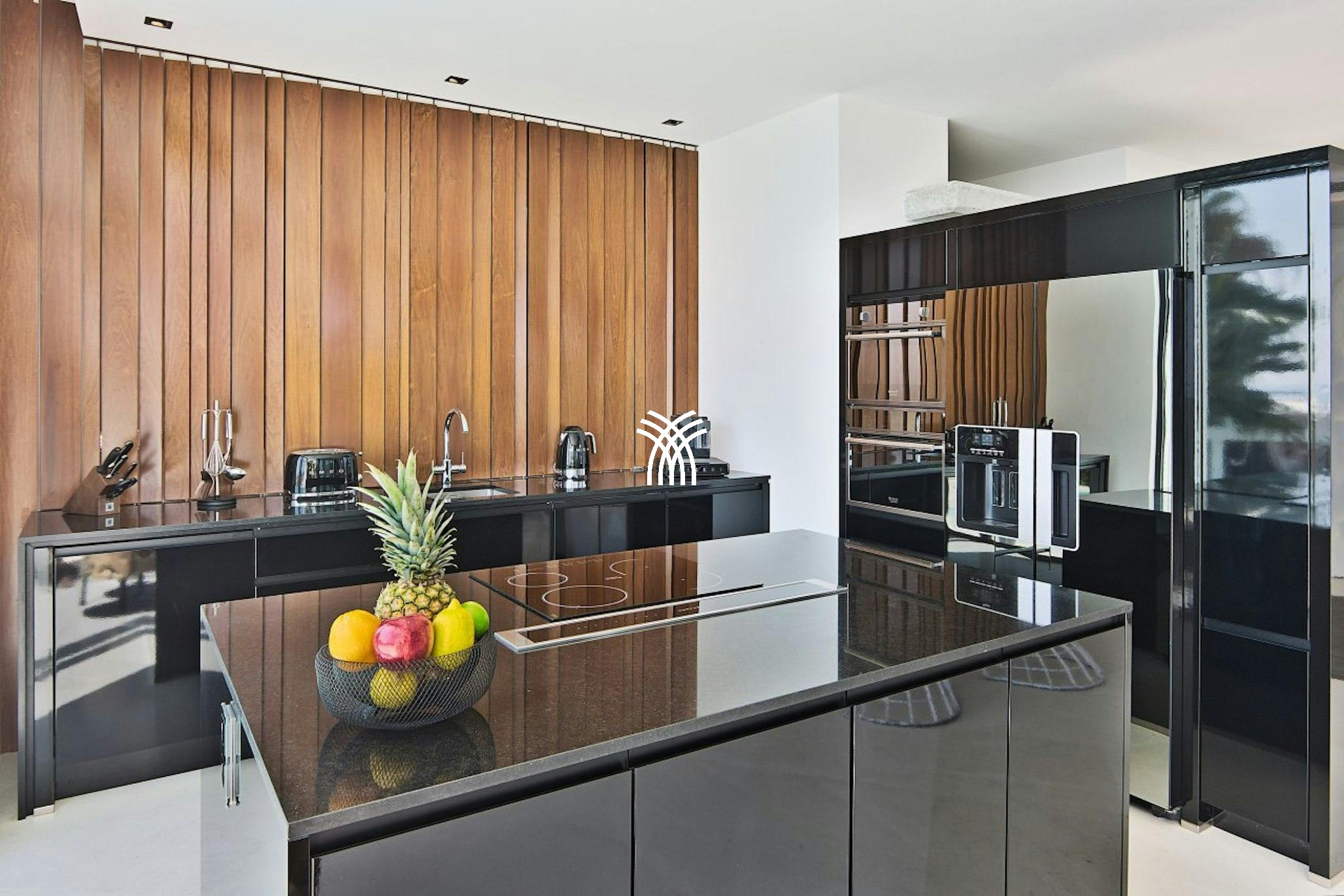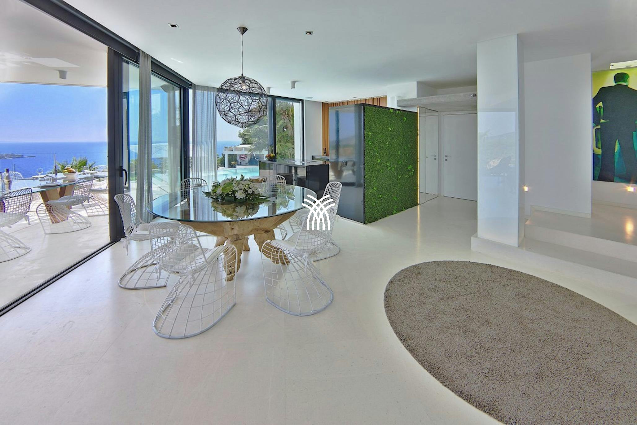 Inside, sleek contemporary interiors echo the villa’s minimalist elegance. The fully equipped kitchen opens directly onto the pool terrace and frames spectacular sea views, while glass walls fill the open-plan living and dining areas with light and beauty from morning to sunset.
