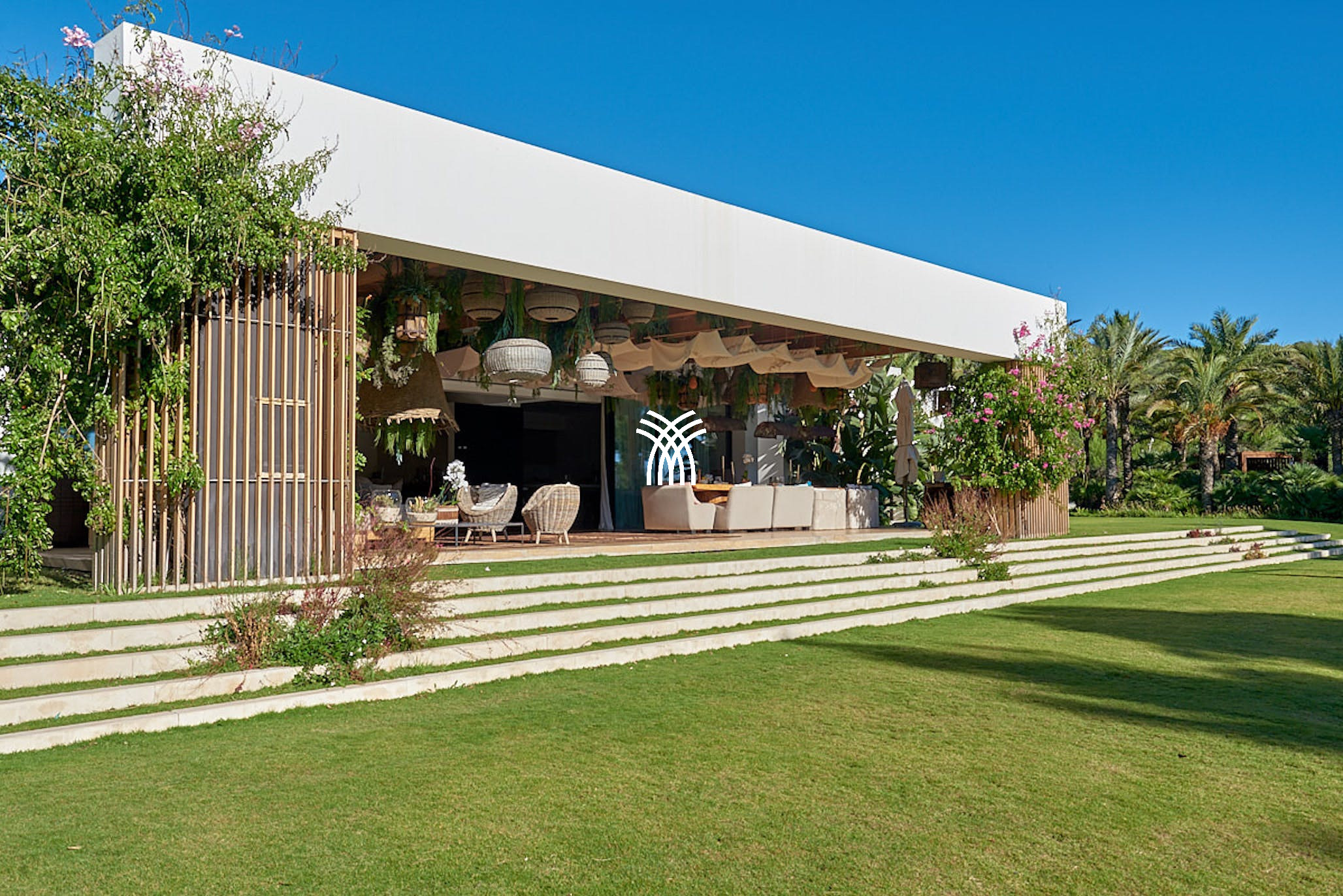 The expansive grounds are a sanctuary of curated art, lush lawns, and exclusive amenities. A luxurious outdoor jacuzzi for ten sits under a canopy of palms, while a pétanque court and a private open-air cinema provide entertainment with a touch of elegance. An al-fresco terrace overlooks the pool, where guests can unwind in shaded lounge areas or dine at a long, elegant table with views over a private white sand beach lounge complete with a professional bar and seating for thirty.