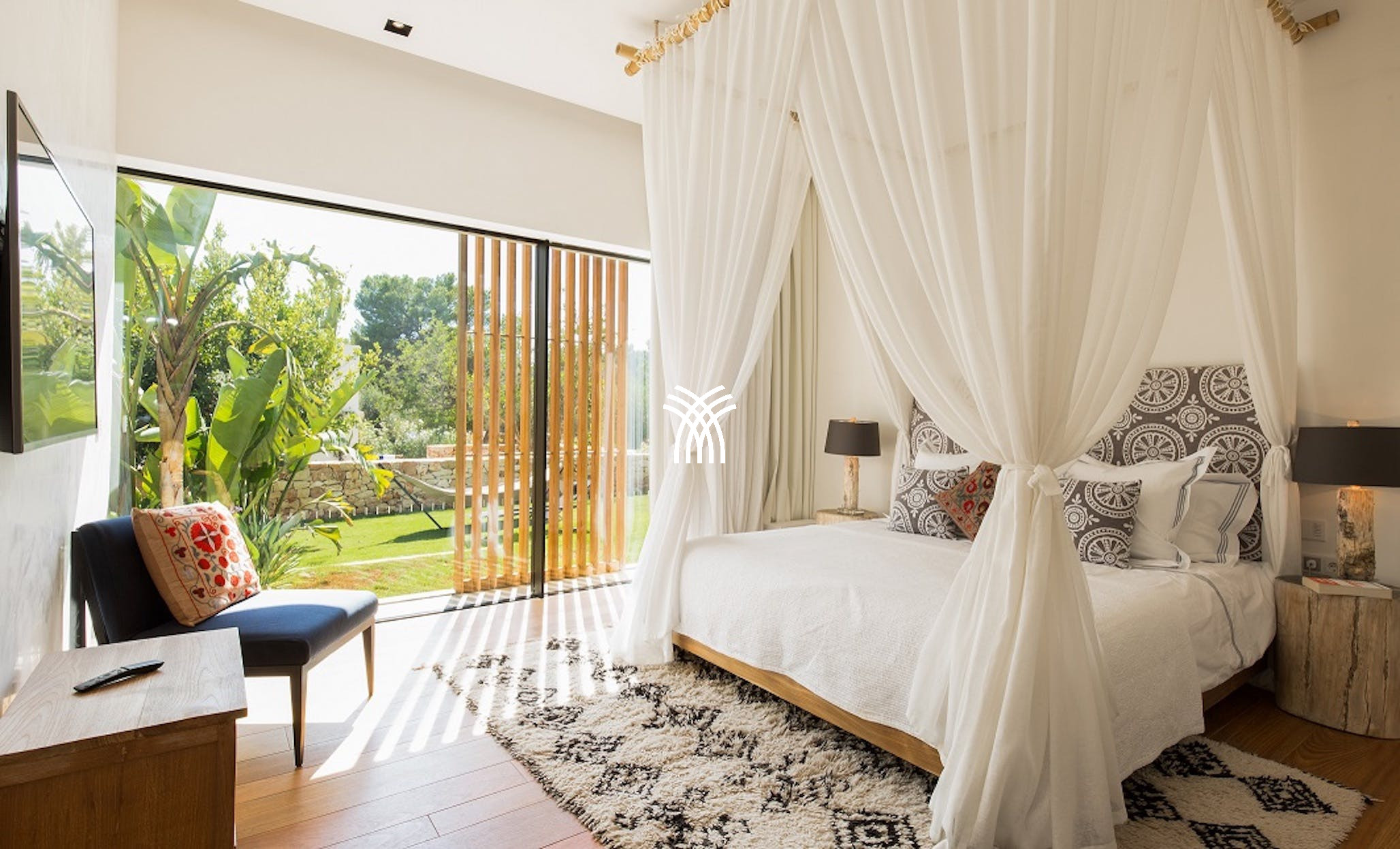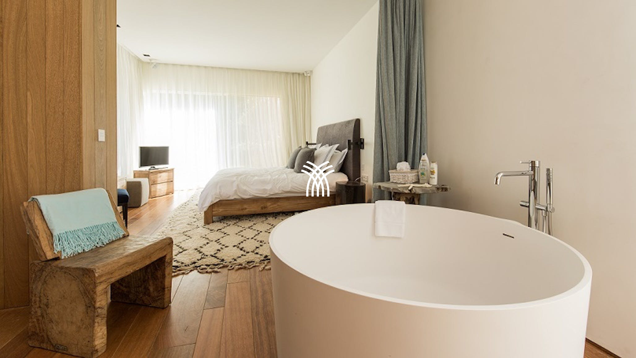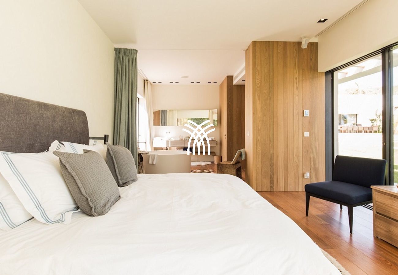 Inside, the villa blends bold contemporary styling with warm natural finishes. Polished wood floors and bespoke furnishings add charm to the spacious, light-filled interiors. Each bedroom offers supreme comfort and privacy, featuring en-suite bathrooms crafted with natural stone, sleek fixtures, and artistic touches. The master suite is a sanctuary of its own, complete with private access to the jacuzzi, a personal chill-out zone, and a spa-style bathroom with a hammam, shower, and freestanding tub.