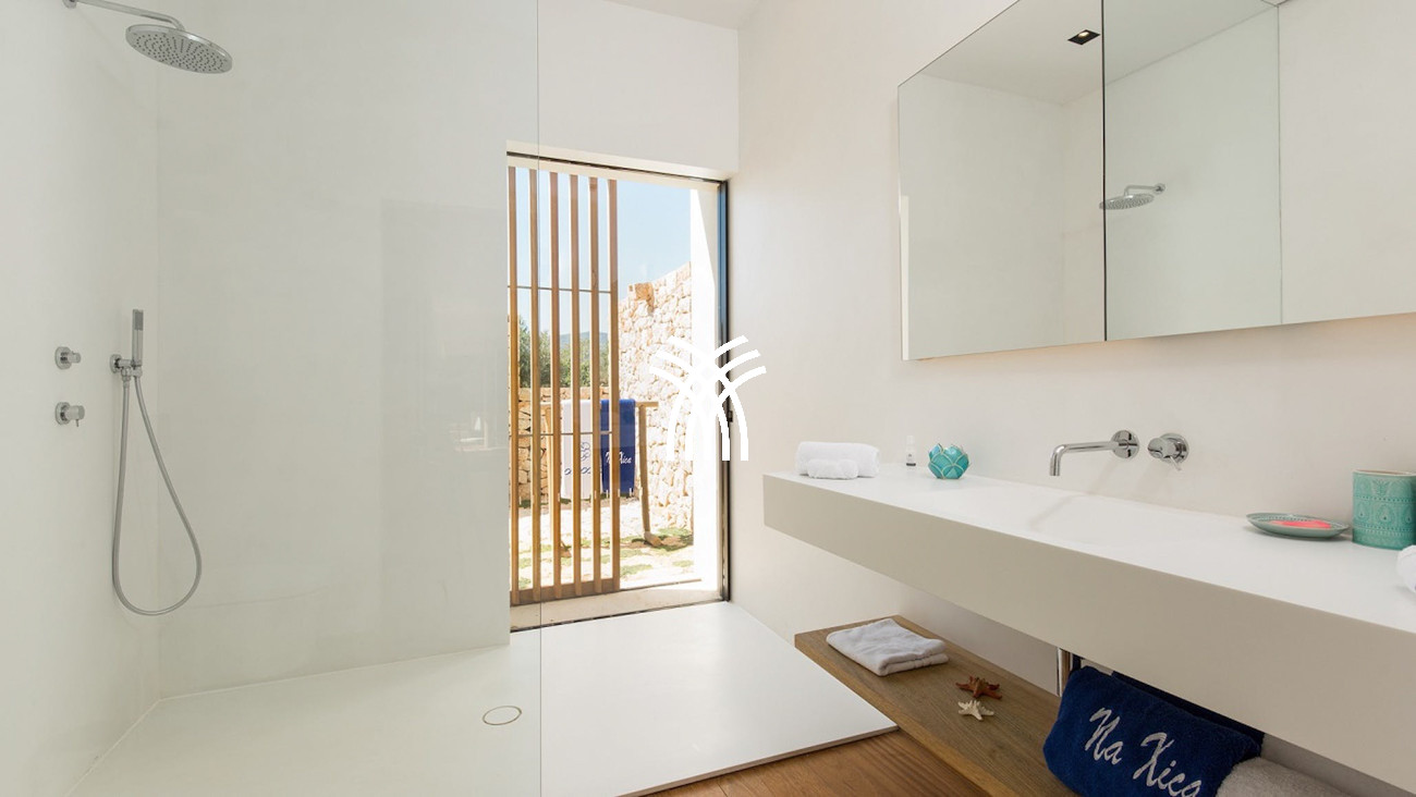Villa Viviana hosts three stunning double bedrooms with en-suite bathrooms. Two are located in the main house, each with panoramic sea views, air conditioning, and underfloor heating. The top floor suite offers added privacy, a large terrace, and commanding views of Es Vedra and the surrounding coastline.