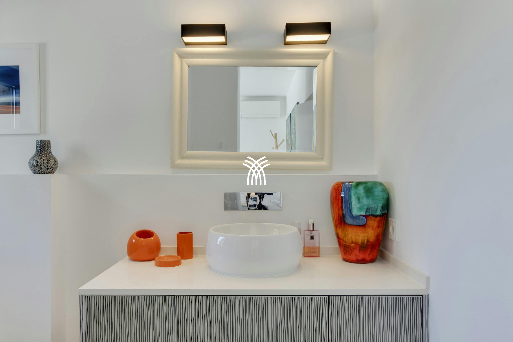 Designed for those who value beauty, comfort, and peace, this elegant villa boasts a spacious open-plan layout with a fully equipped modern kitchen featuring a sleek 4-meter island and dining for ten. The expansive living area flows seamlessly through sliding glass doors onto the sun-drenched terraces and pool deck, all framing uninterrupted views of the Mediterranean Sea.