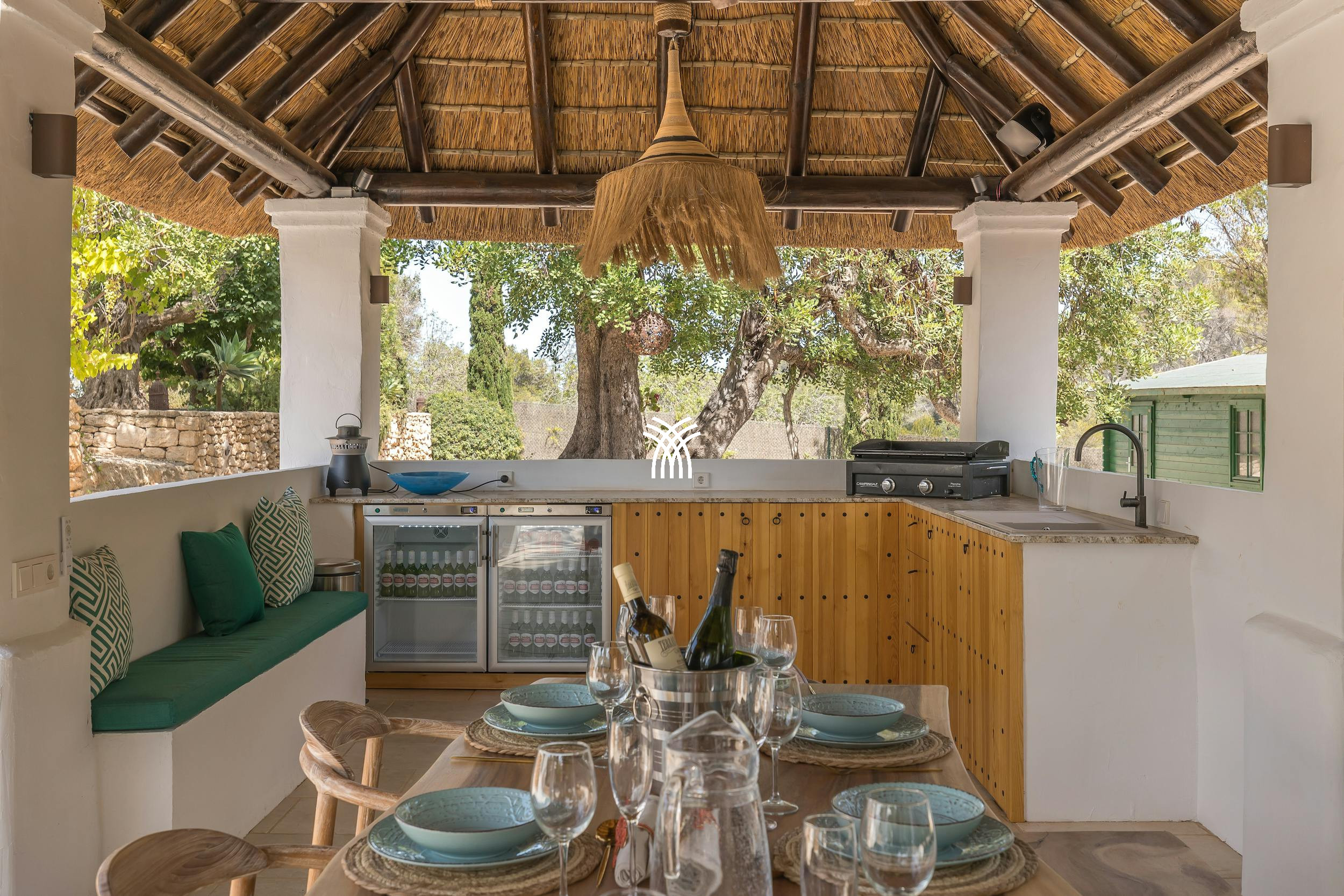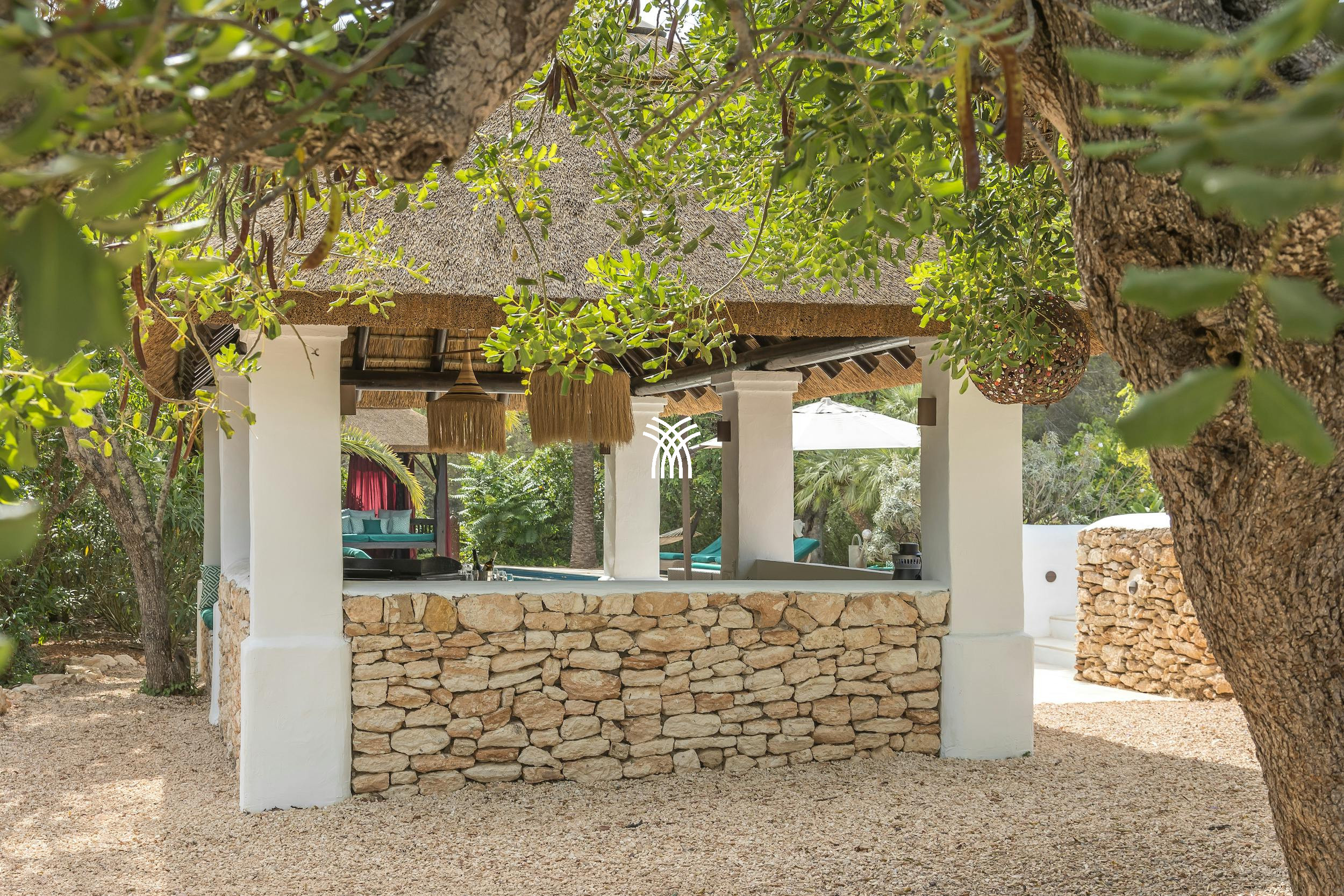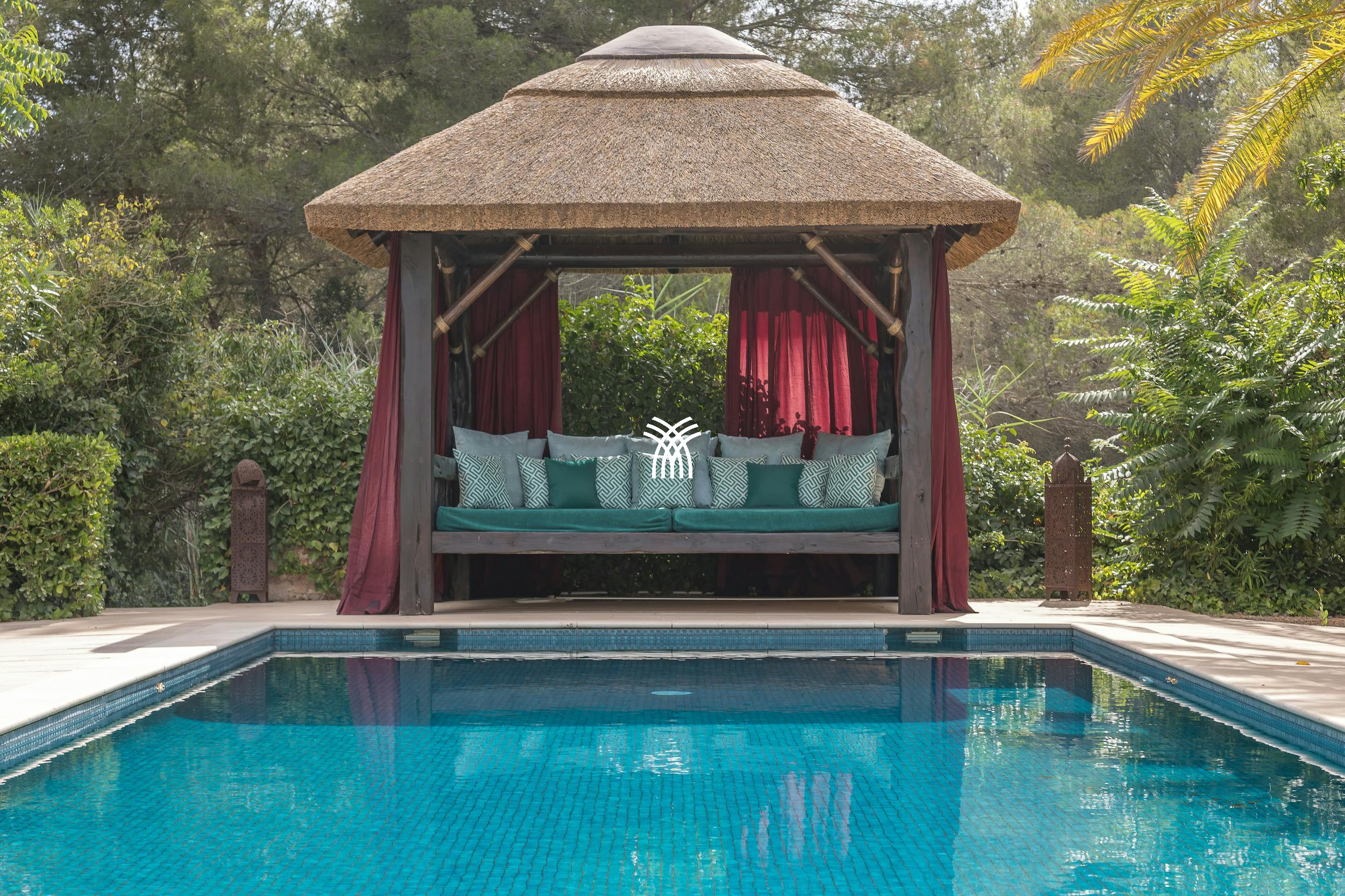 Tucked within the garden is a Bali-style pavilion, offering a shaded retreat with a daybed, dining area, swing bench and comfortable lounge seating — an ideal setting for lazy afternoons or sunset dinners. A second terrace offers additional outdoor space to relax and soak in the Ibizan sunshine.