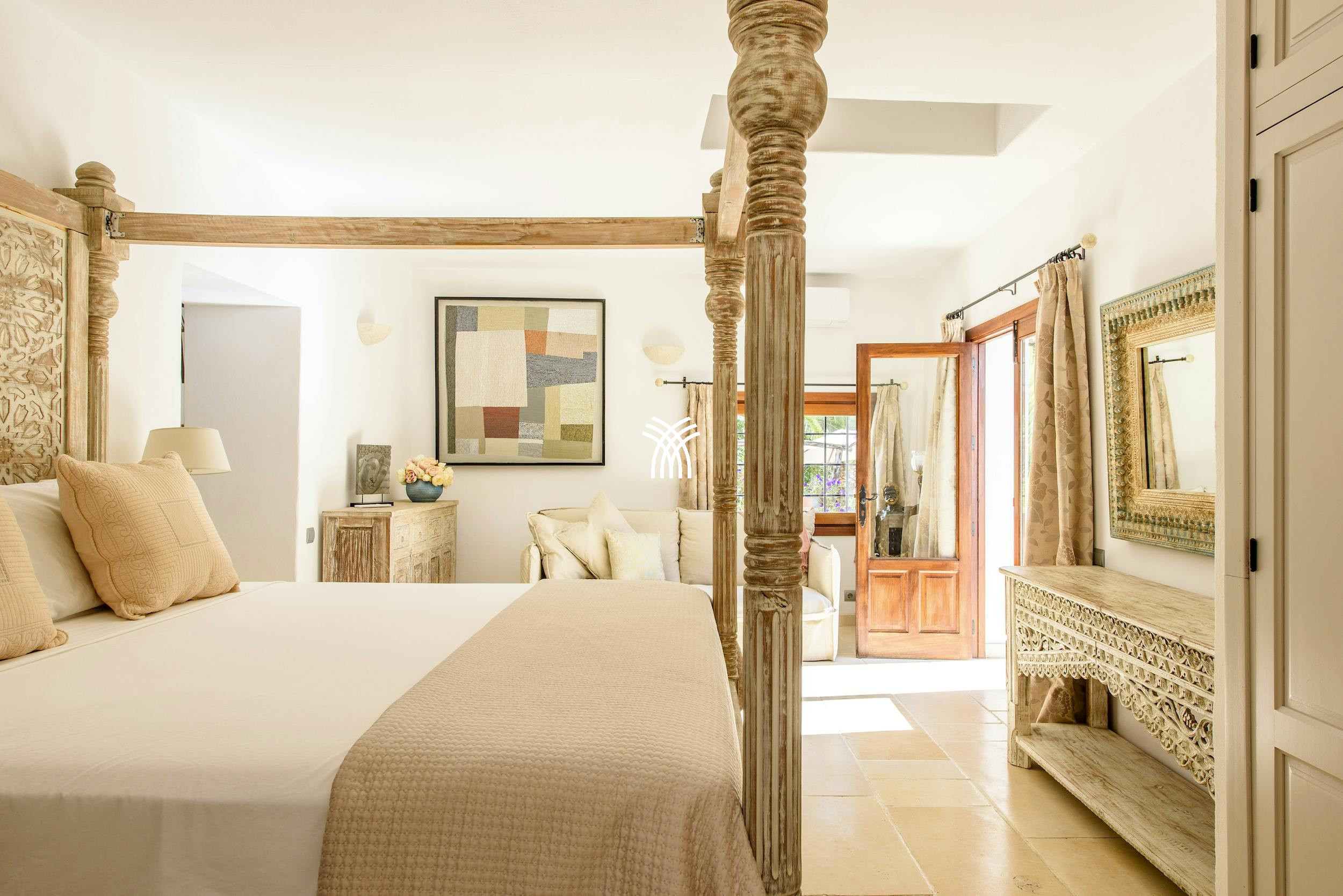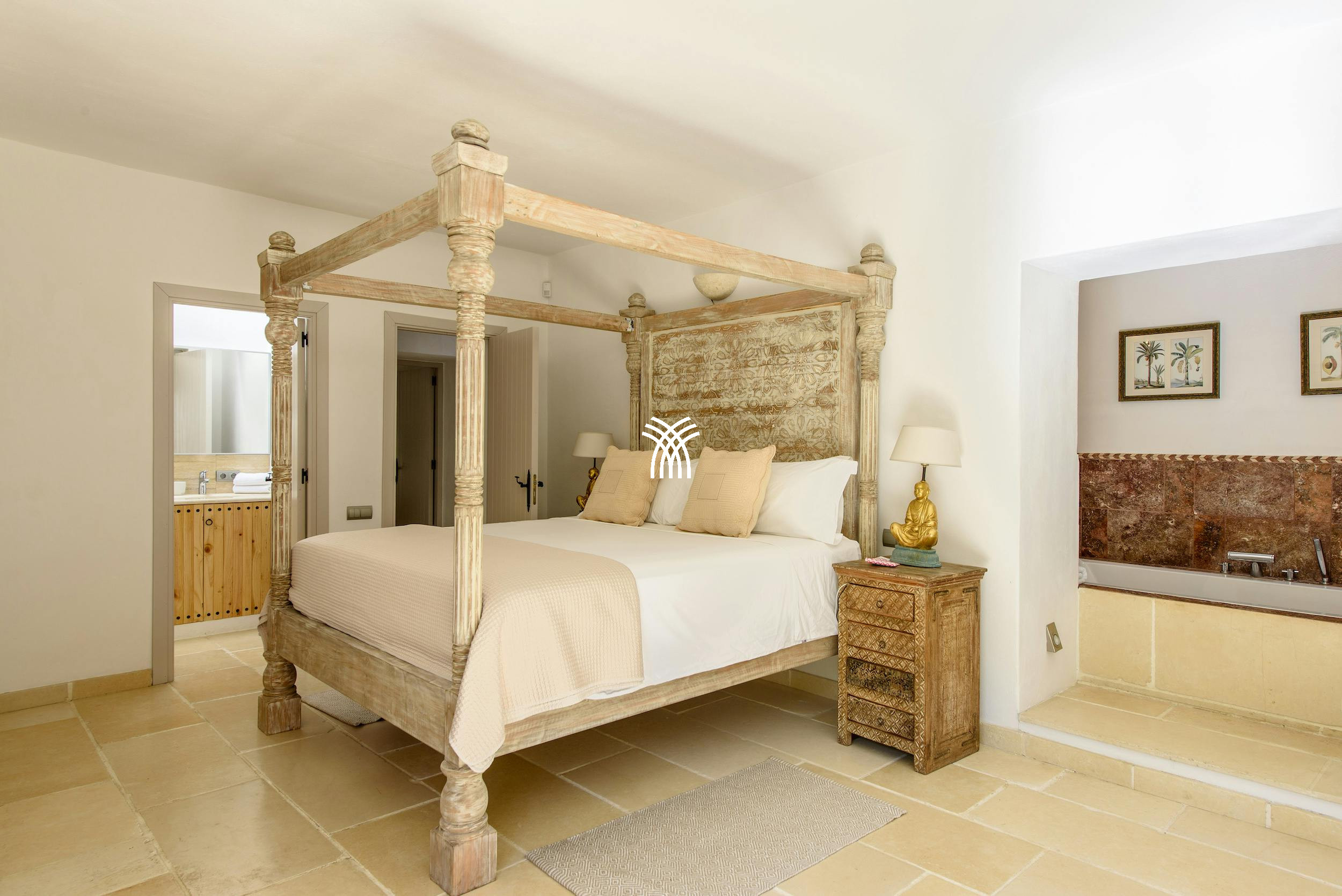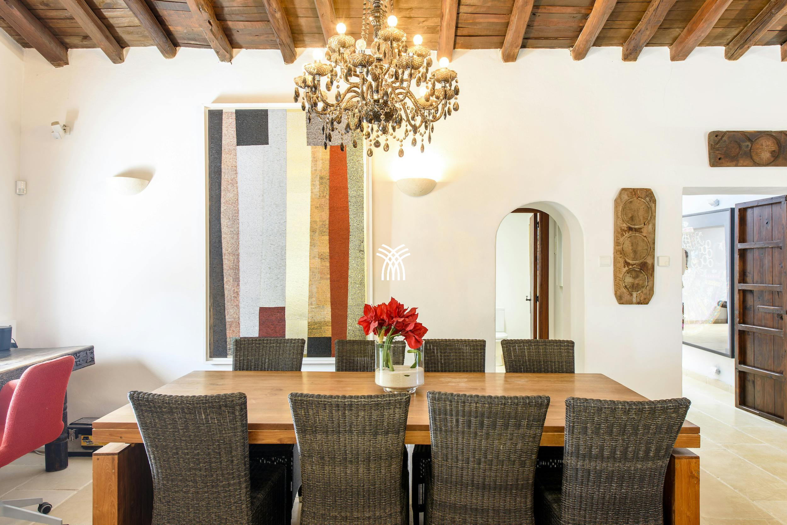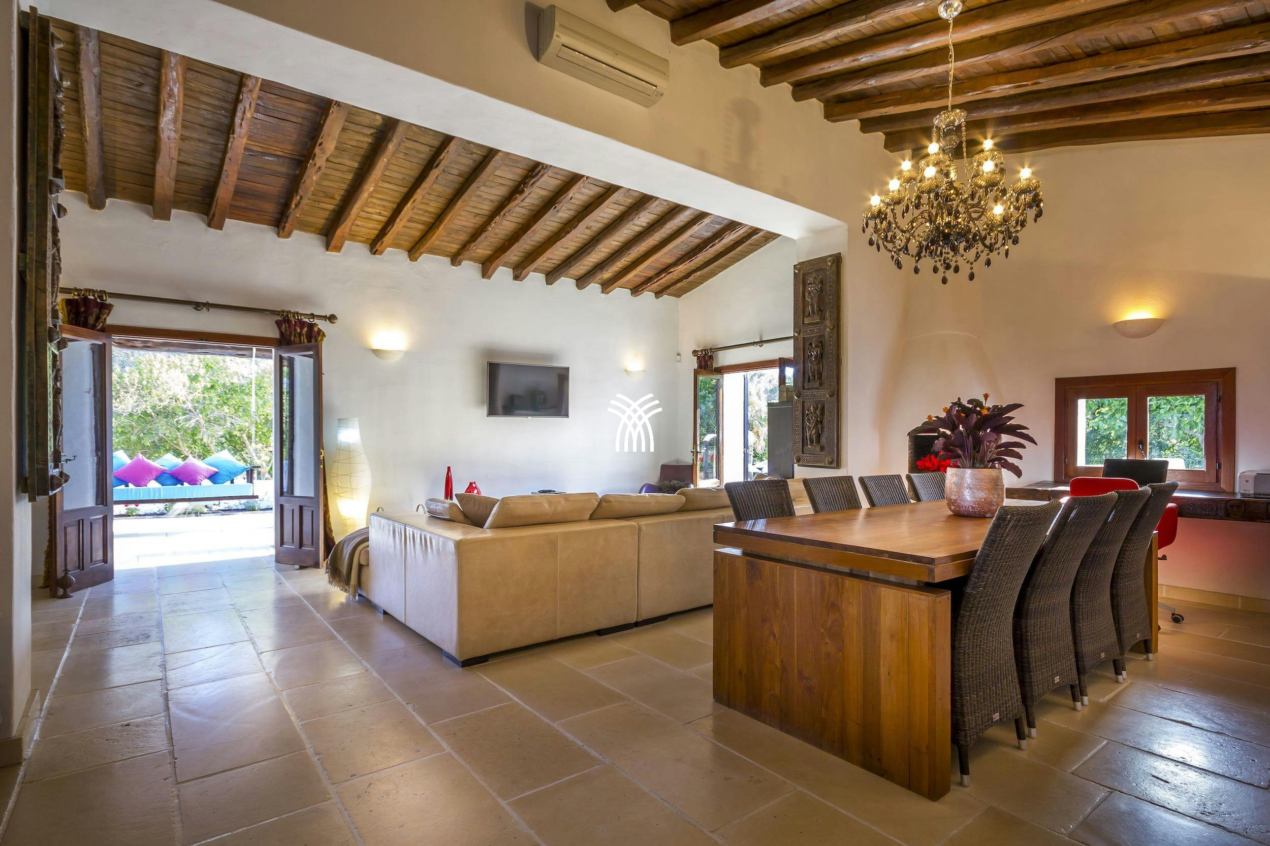 This character-rich villa seamlessly fuses authentic Ibizan architecture with contemporary comfort. Original features like juniper wood beams, slatted ceilings and rustic tiled floors create a warm, earthy atmosphere, while modern upgrades ensure a stylish and luxurious stay. The expansive open-plan interior offers a welcoming lounge, elegant dining area and a fully equipped modern kitchen designed for convenience and entertaining.