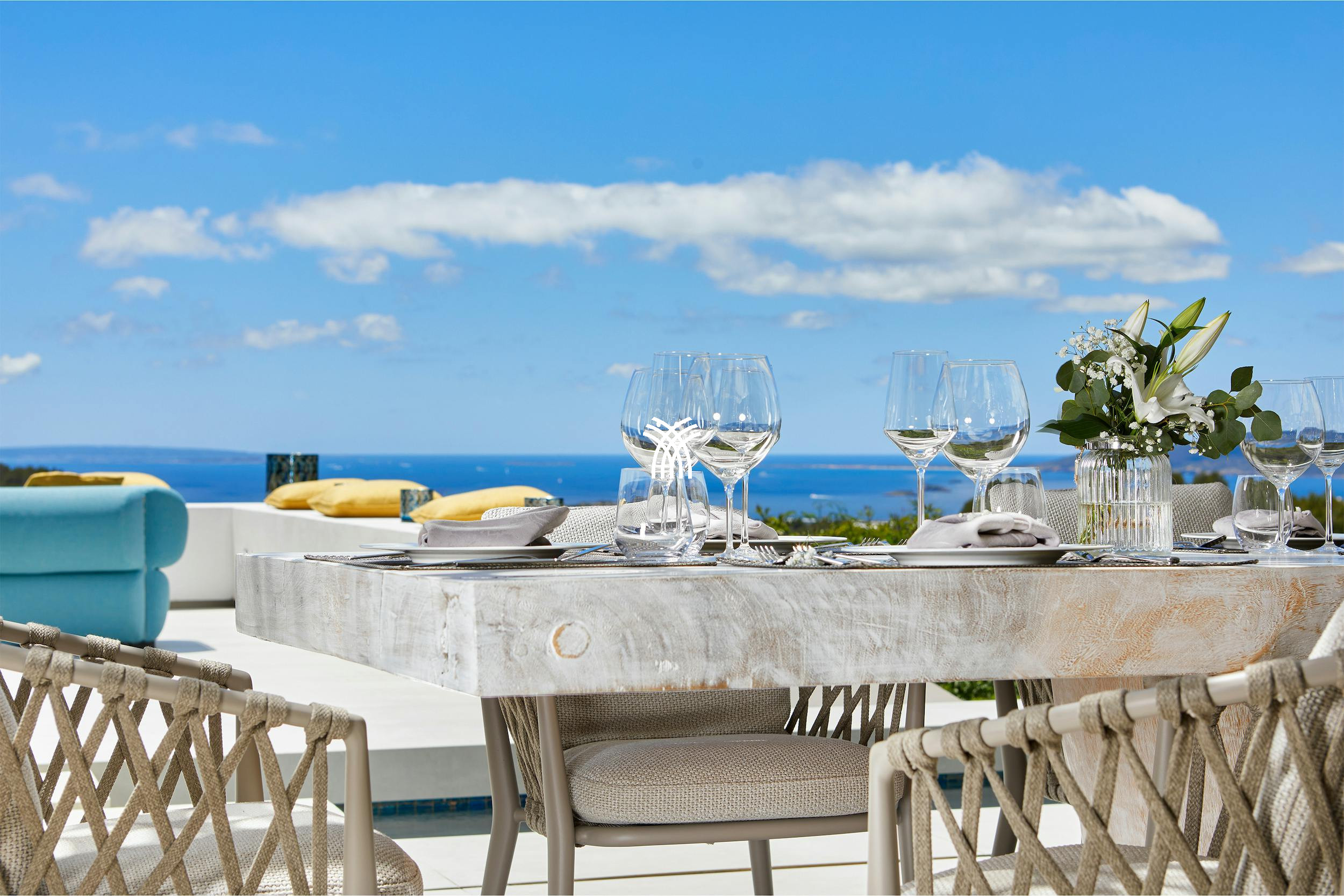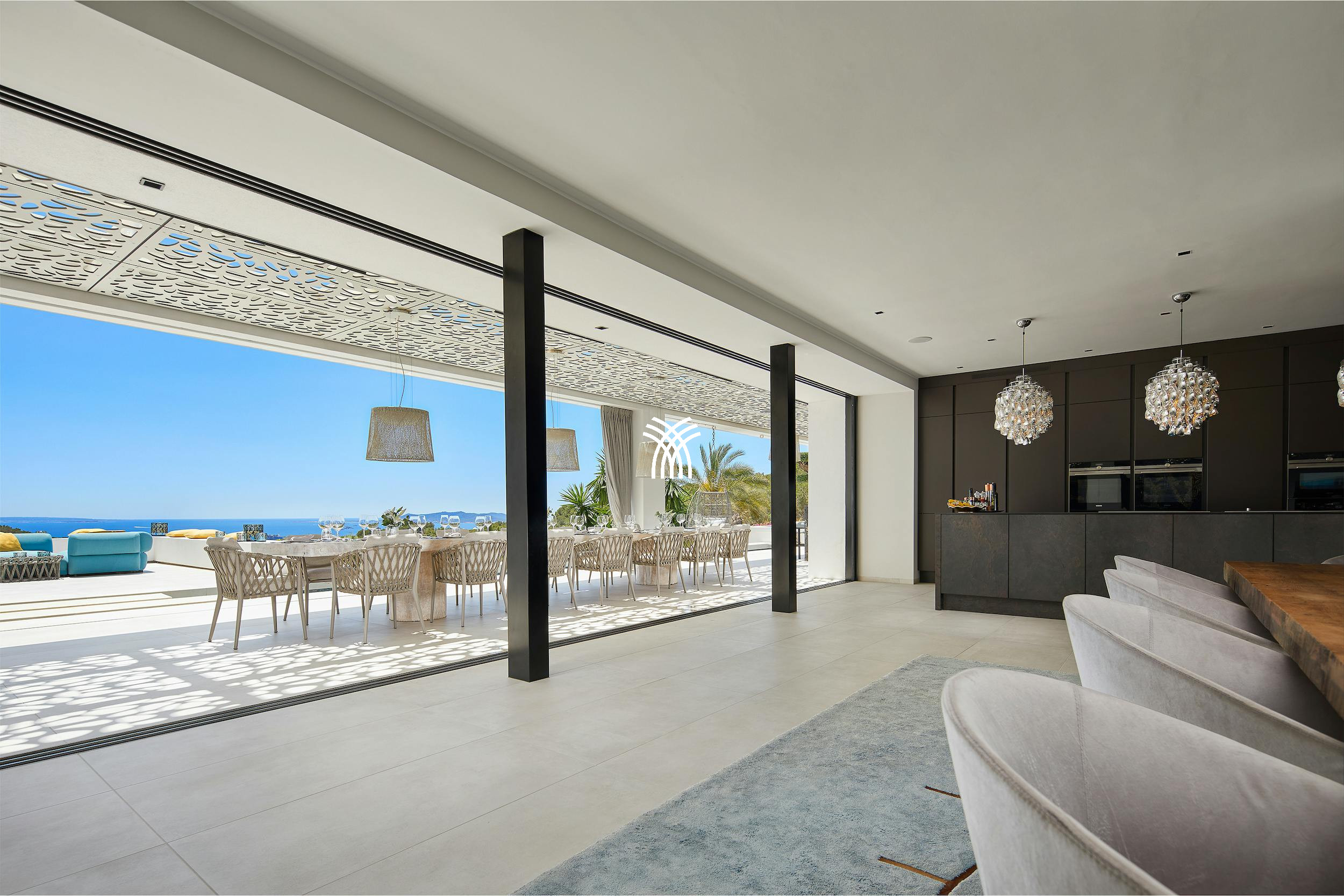 Designed for those who value beauty, comfort, and peace, this elegant villa boasts a spacious open-plan layout with a fully equipped modern kitchen featuring a sleek 4-meter island and dining for ten. The expansive living area flows seamlessly through sliding glass doors onto the sun-drenched terraces and pool deck, all framing uninterrupted views of the Mediterranean Sea.