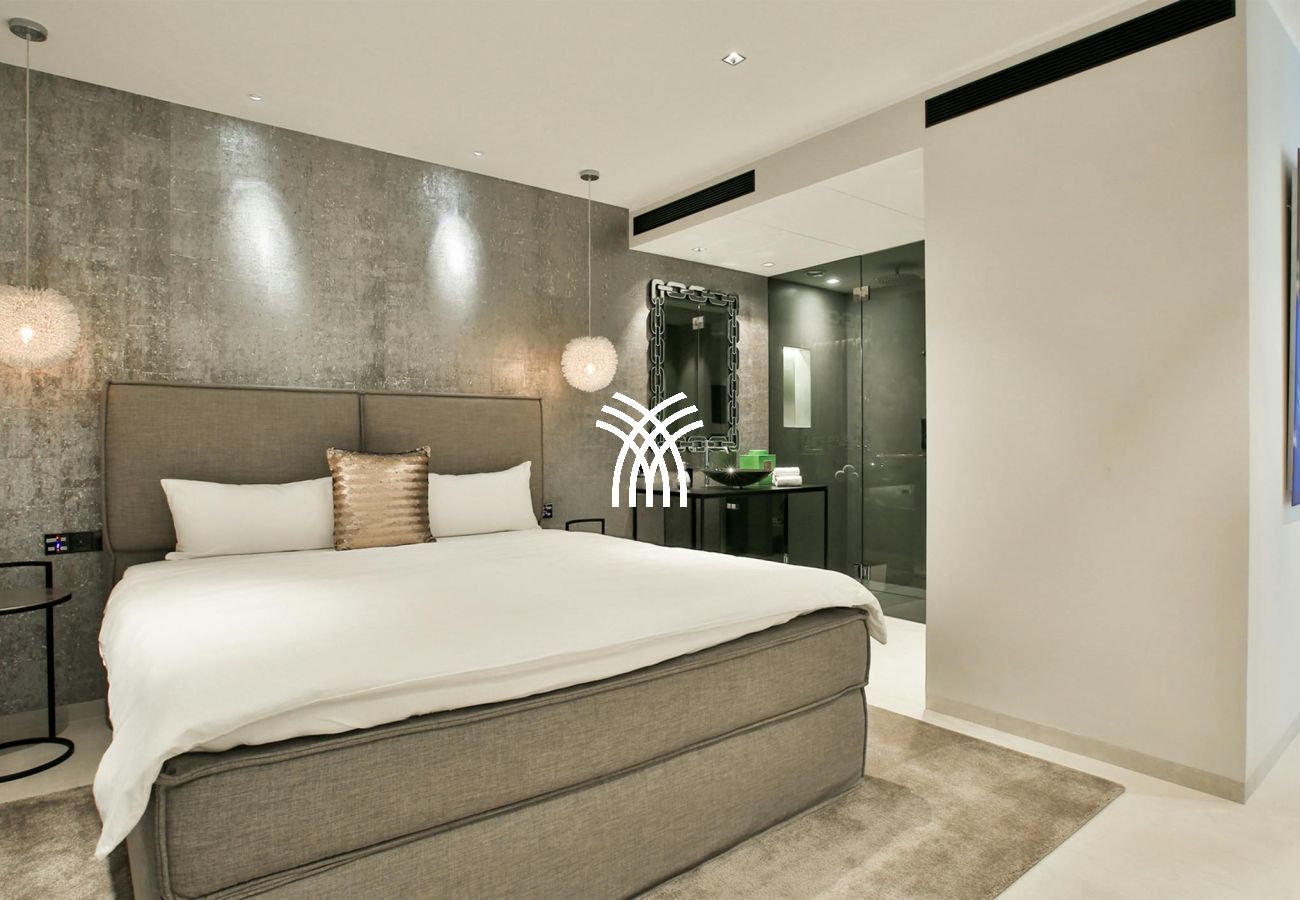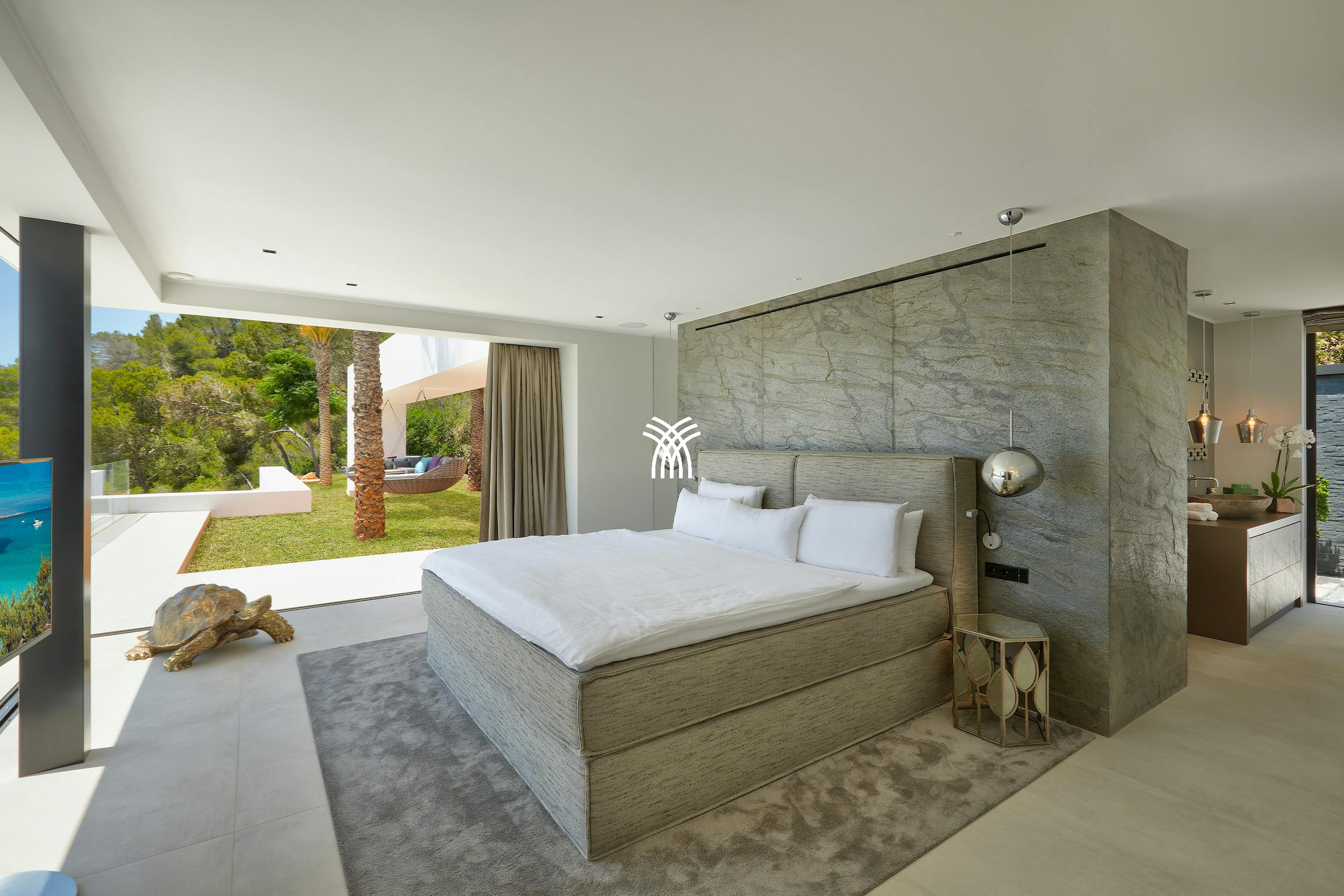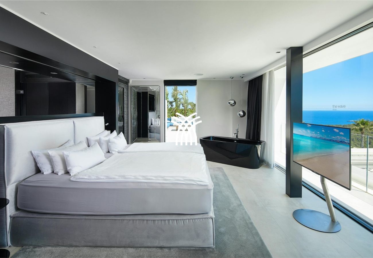 Villa Viviana hosts three stunning double bedrooms with en-suite bathrooms. Two are located in the main house, each with panoramic sea views, air conditioning, and underfloor heating. The top floor suite offers added privacy, a large terrace, and commanding views of Es Vedra and the surrounding coastline.