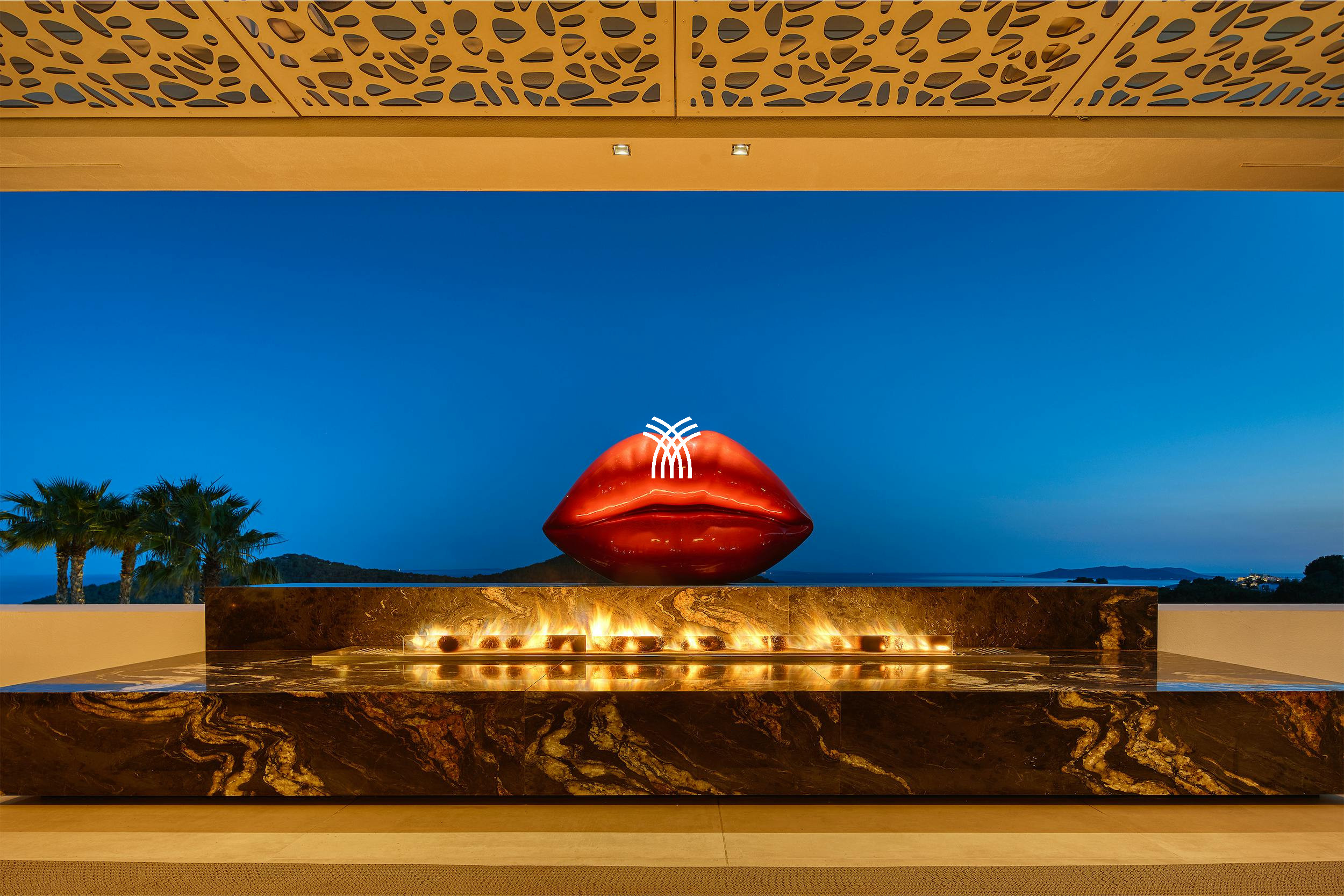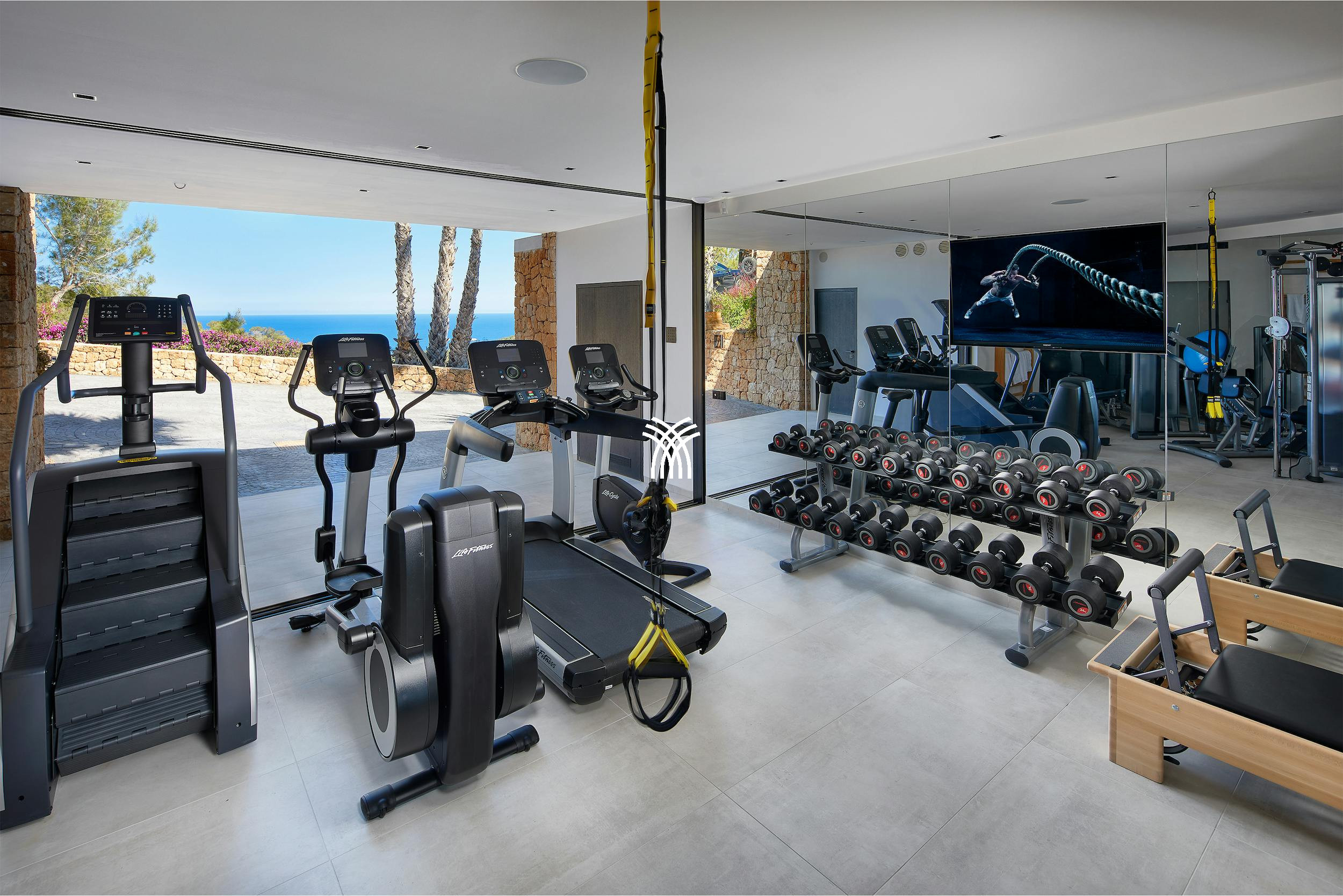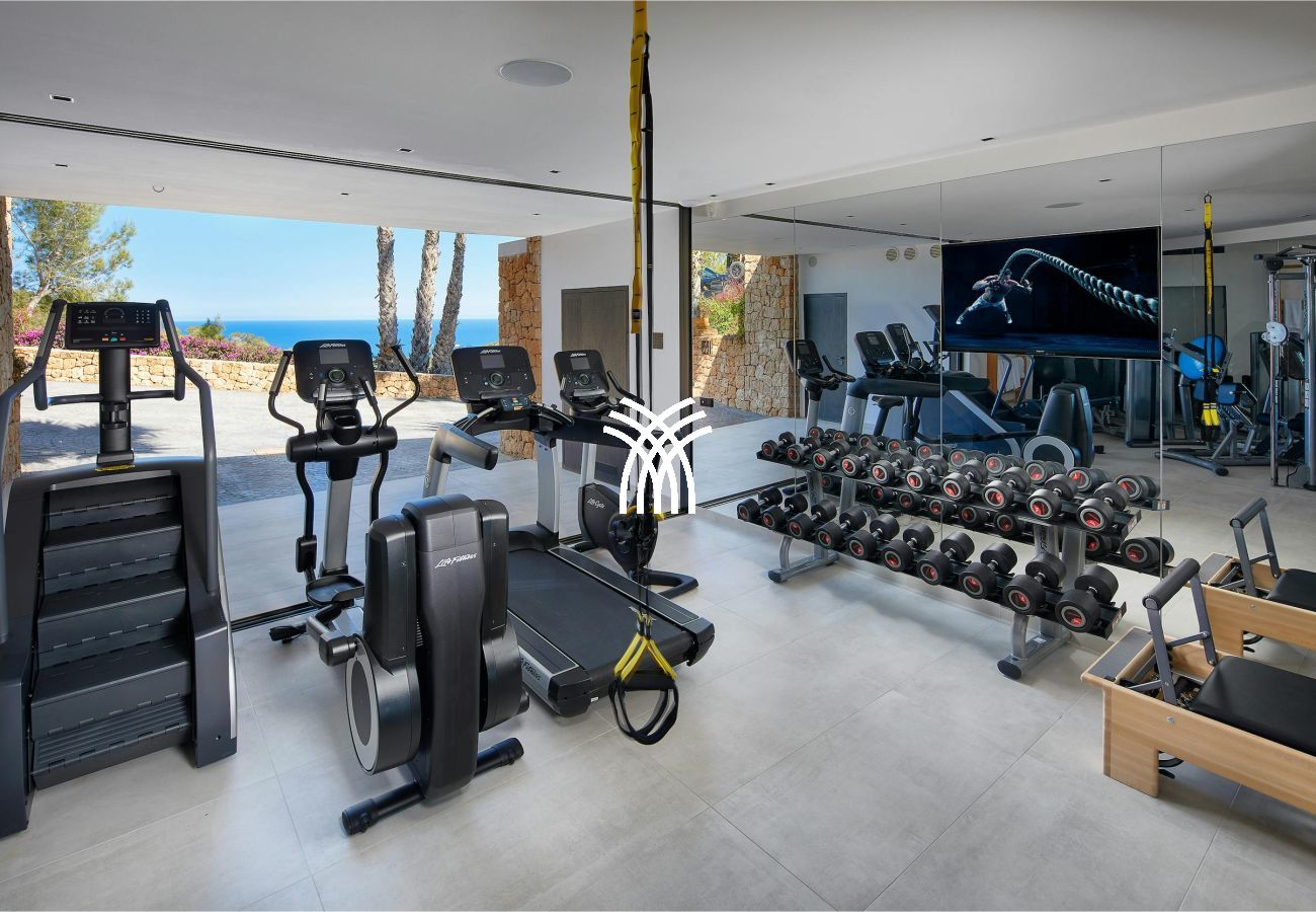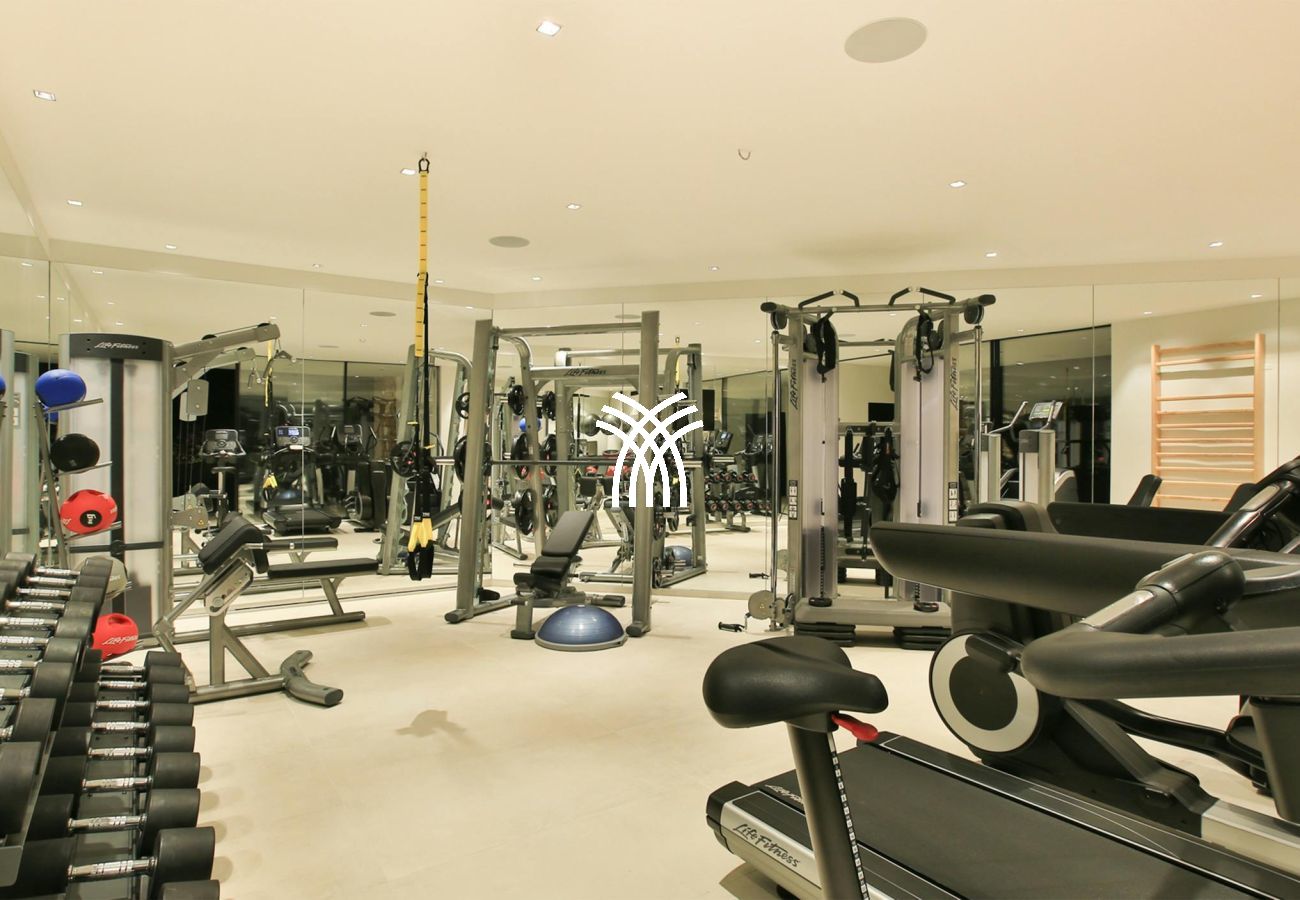 The exterior is designed as a true resort: infinity pool, solarium, outdoor bar, barbecue area, relaxation lounge, tropical garden, children's playground, and campfire to admire sunsets. The villa also features a professional LifeFitness equipped gym, a workspace for working in complete serenity, and a comprehensive security system with cameras.