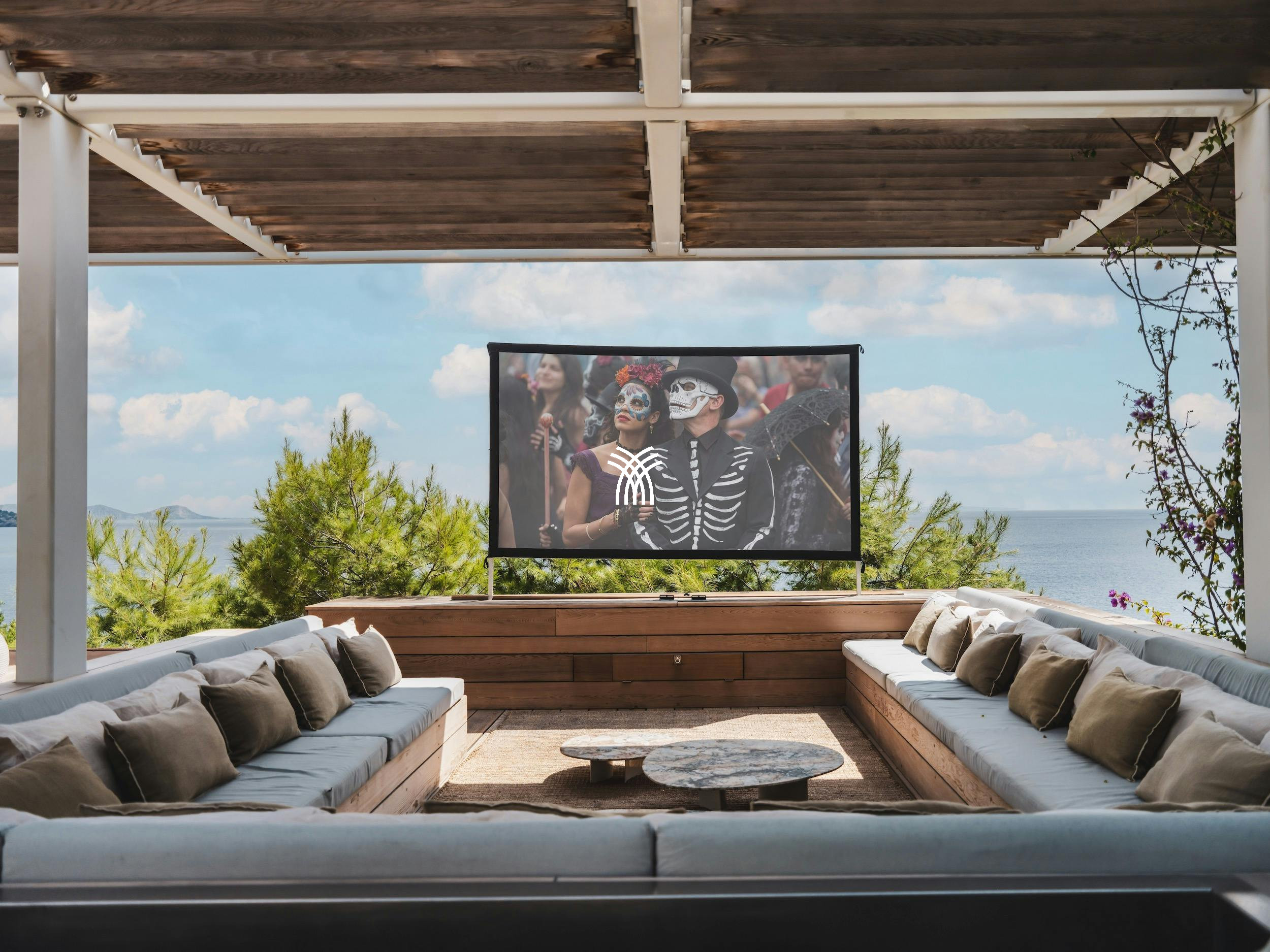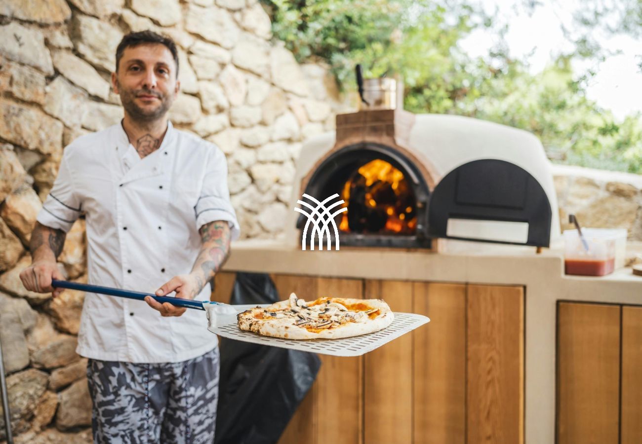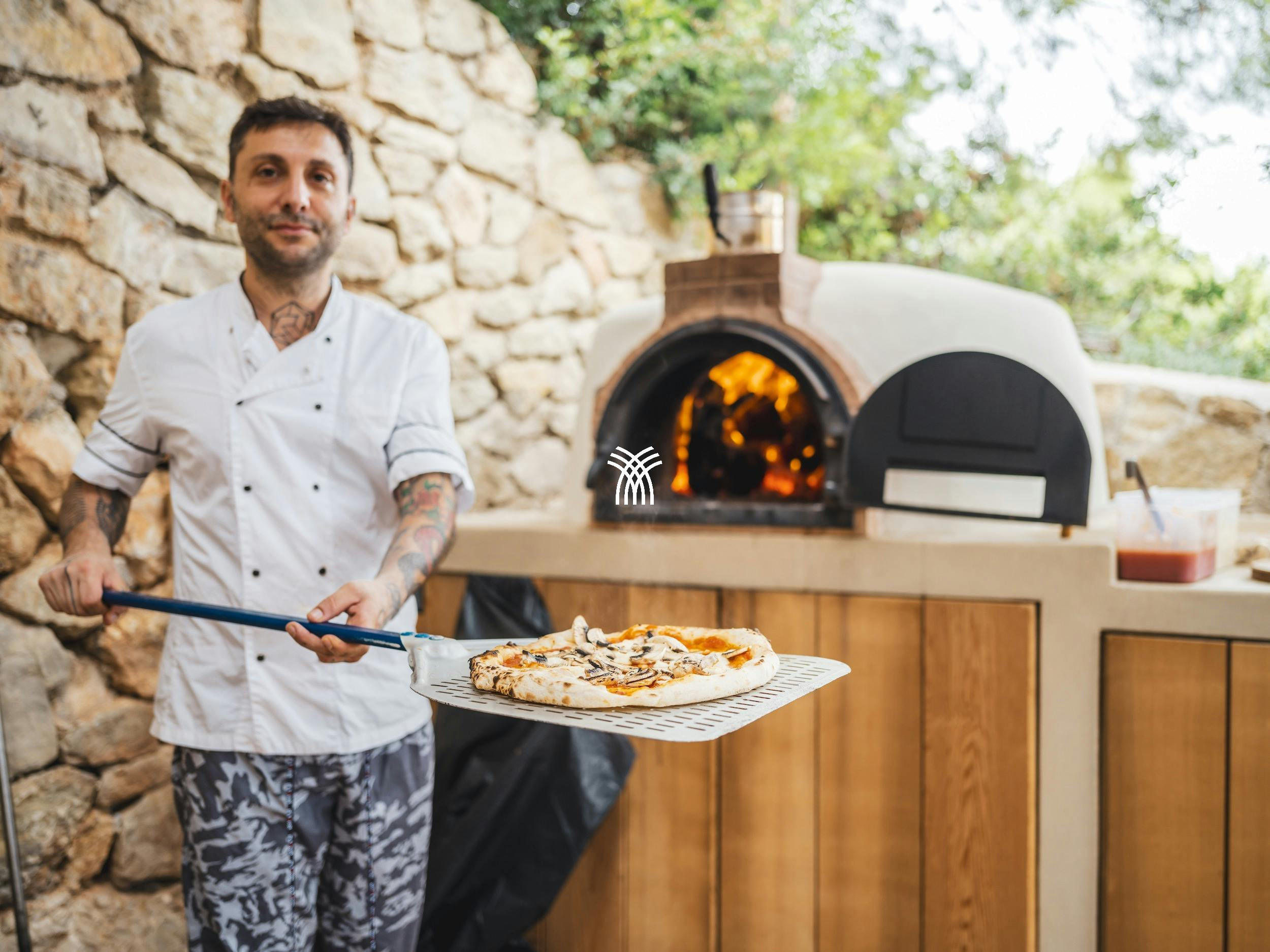 Wander along the wraparound deck and discover serene chill-out zones with panoramic sea views. An upper terrace hosts an elegant al fresco dining space for eighteen, while closer to the beach, a rustic outdoor kitchen with a pizza oven and barbecue is perfect for unforgettable island feasts.