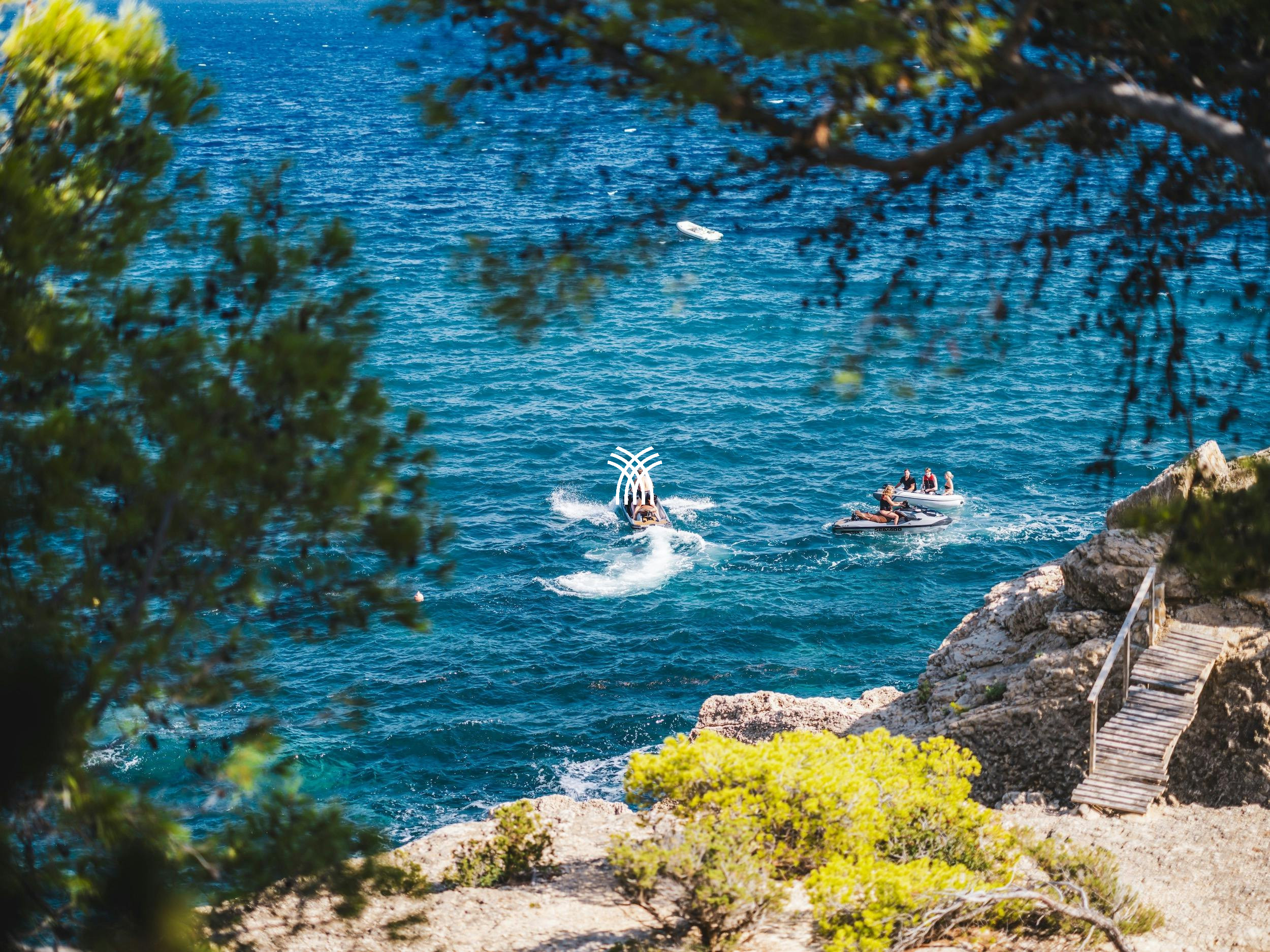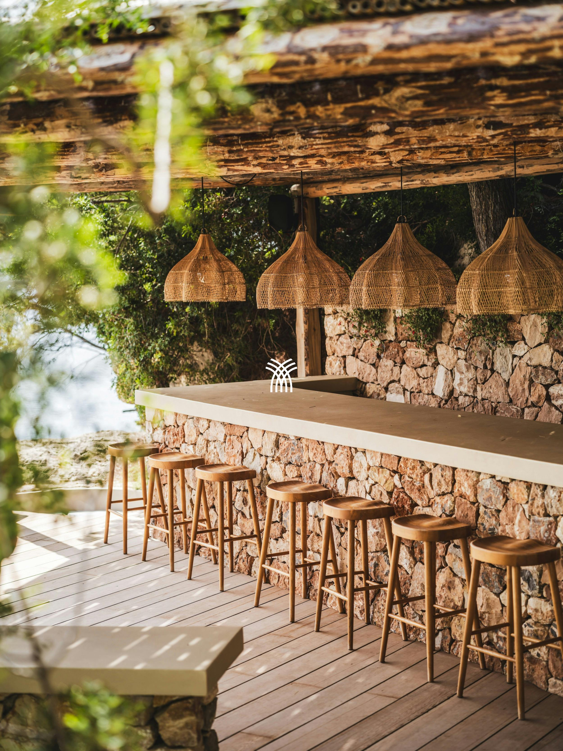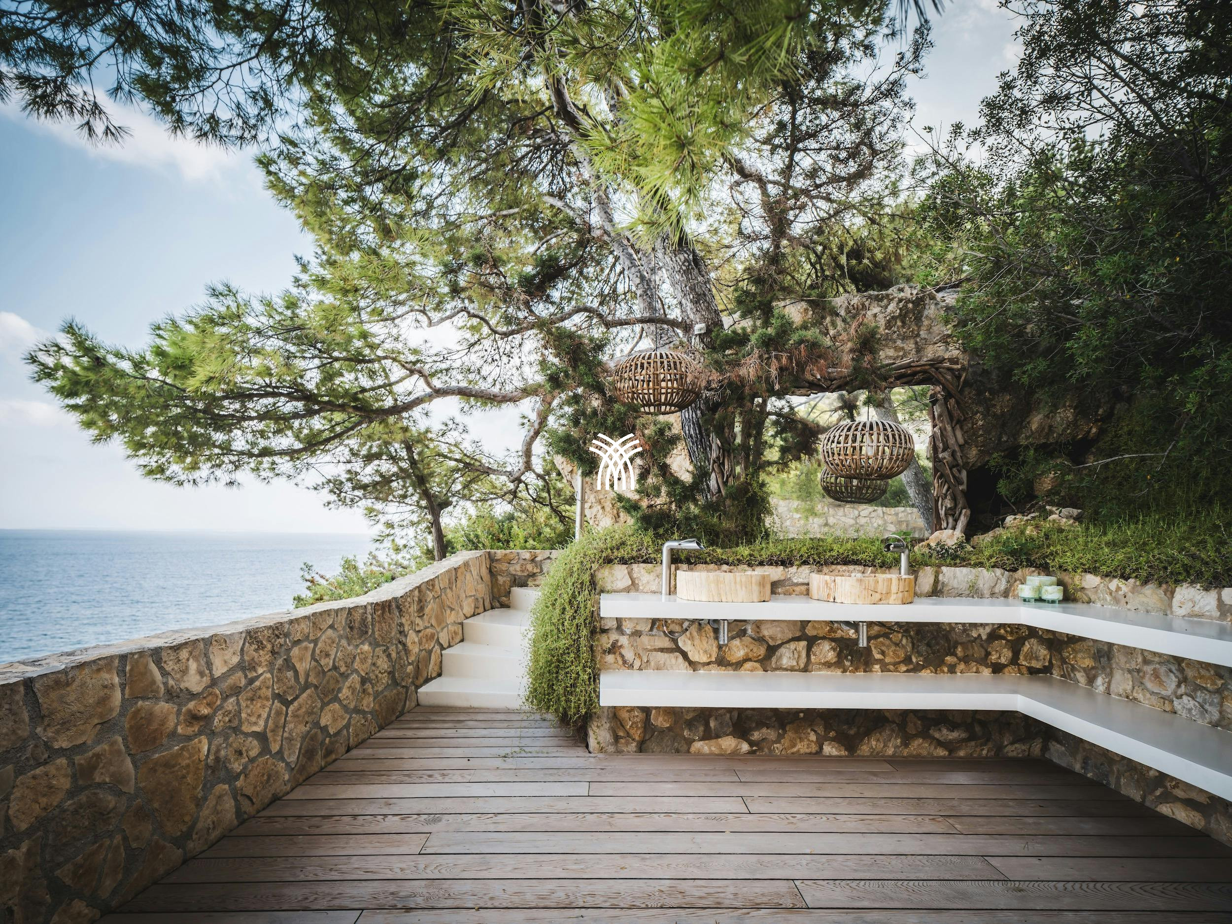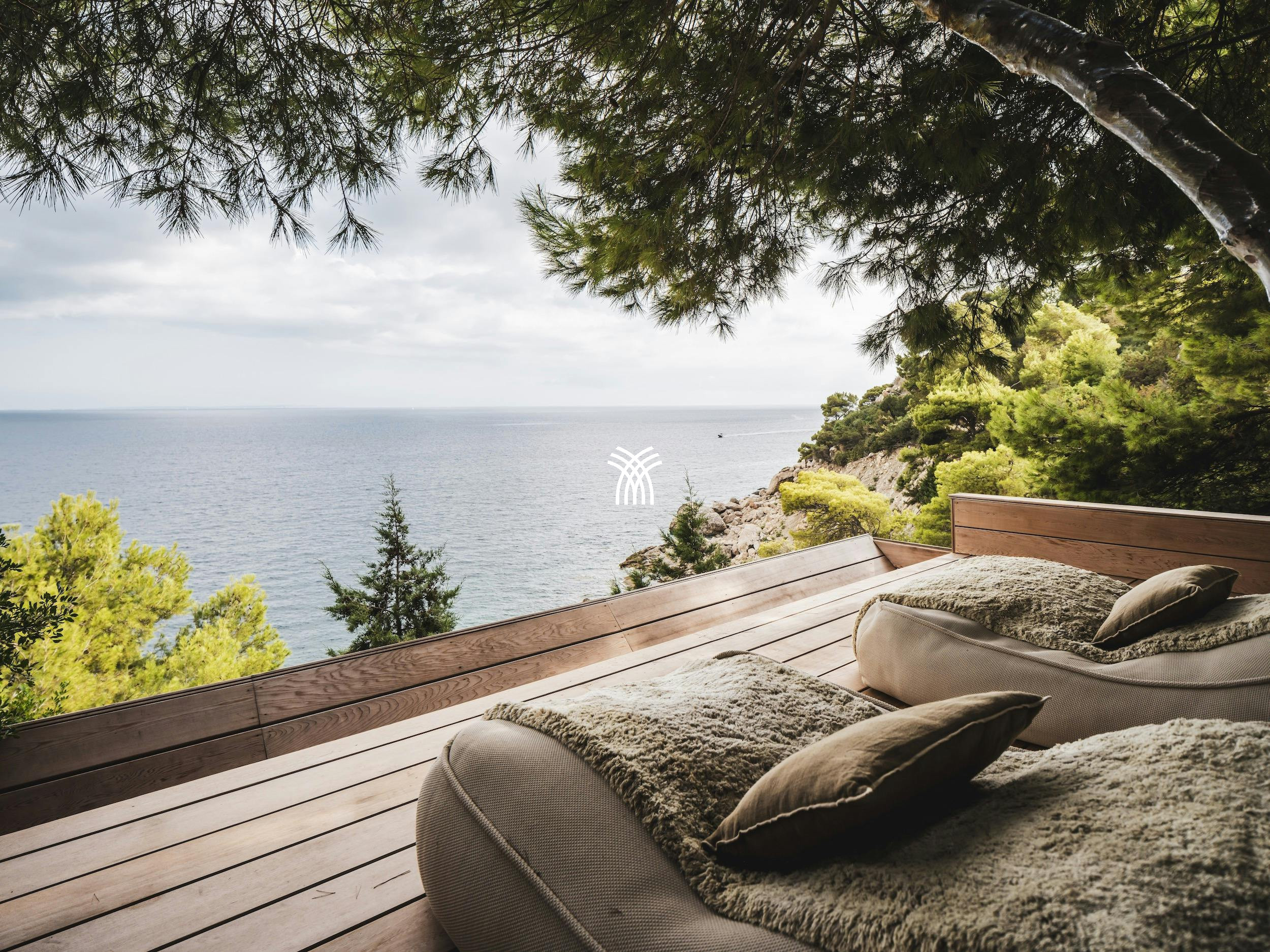 Nestled between towering cliffs and crystal-clear waters, Ocean Paradise offers a privileged front-line position with a private boat jetty for seamless sea exploration. Its expansive outdoor living areas are meticulously designed to celebrate the breathtaking surroundings, featuring a 13-meter pool with a diving board, bleached wood decks lined with plush loungers, and a sunken bench carved into the rock—an idyllic setting to take in the sunset over the Balearic horizon.