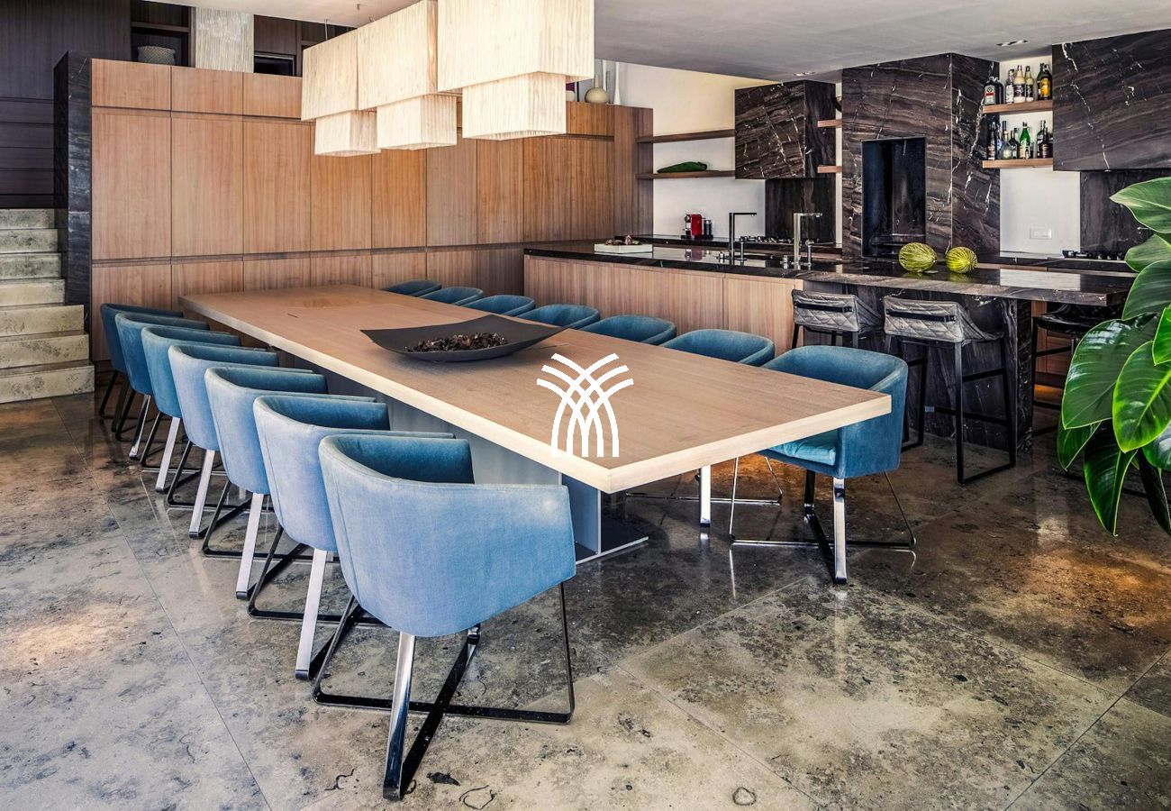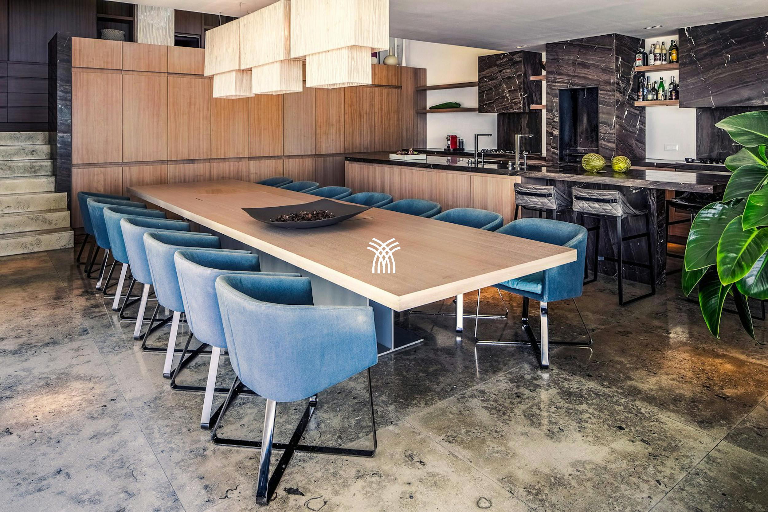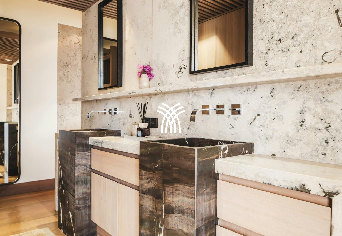 Inside, Ocean Paradise blends organic textures with contemporary elegance. Washed linens, natural wood finishes, and rich stone feature walls in gold and black travertine create a warm, earthy ambiance. The open-plan interior flows from a stylish dining area for sixteen to a cozy lounge with a home cinema, digital projector, and a modern fireplace. A sleek kitchen with a breakfast bar and top-tier appliances completes the space.