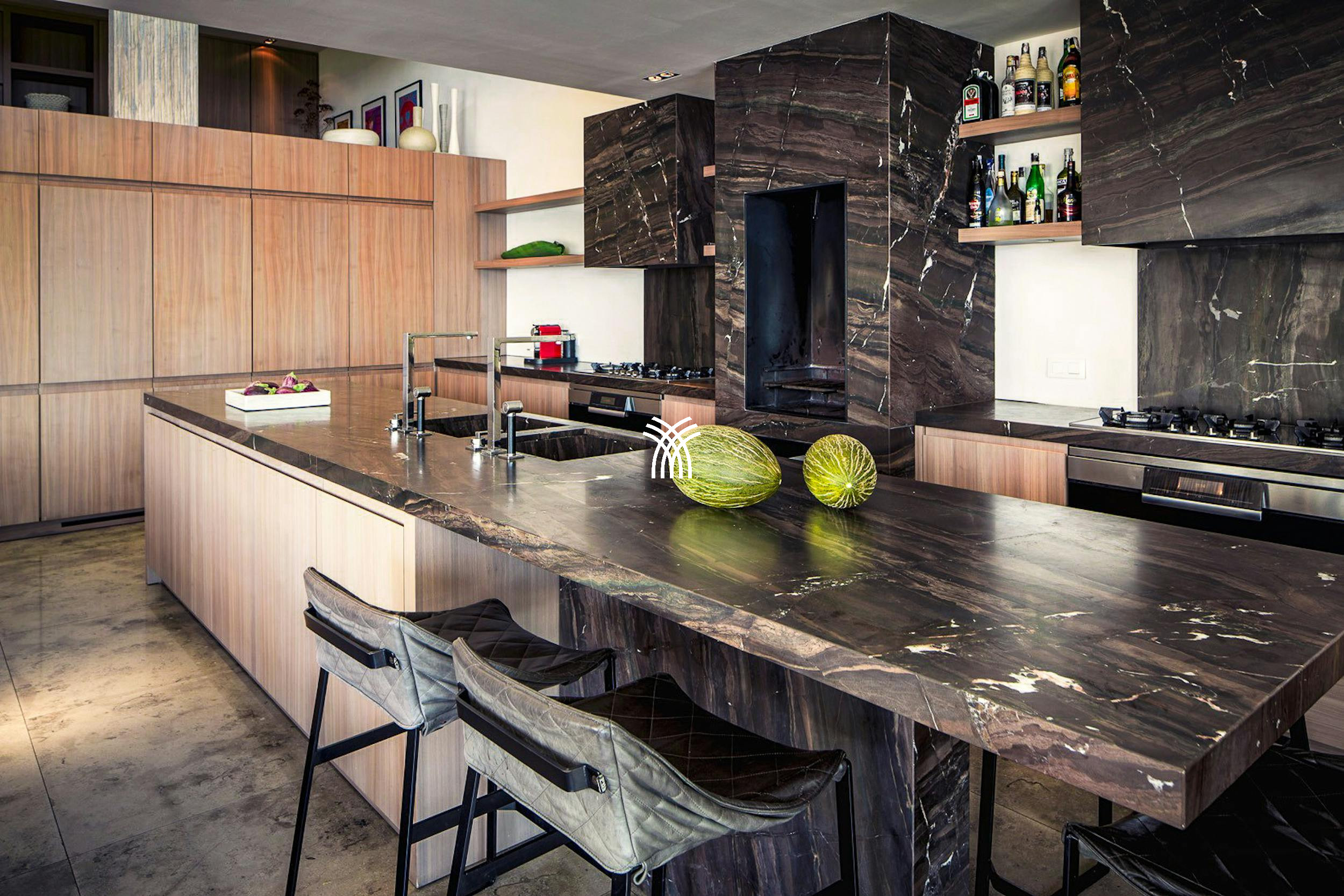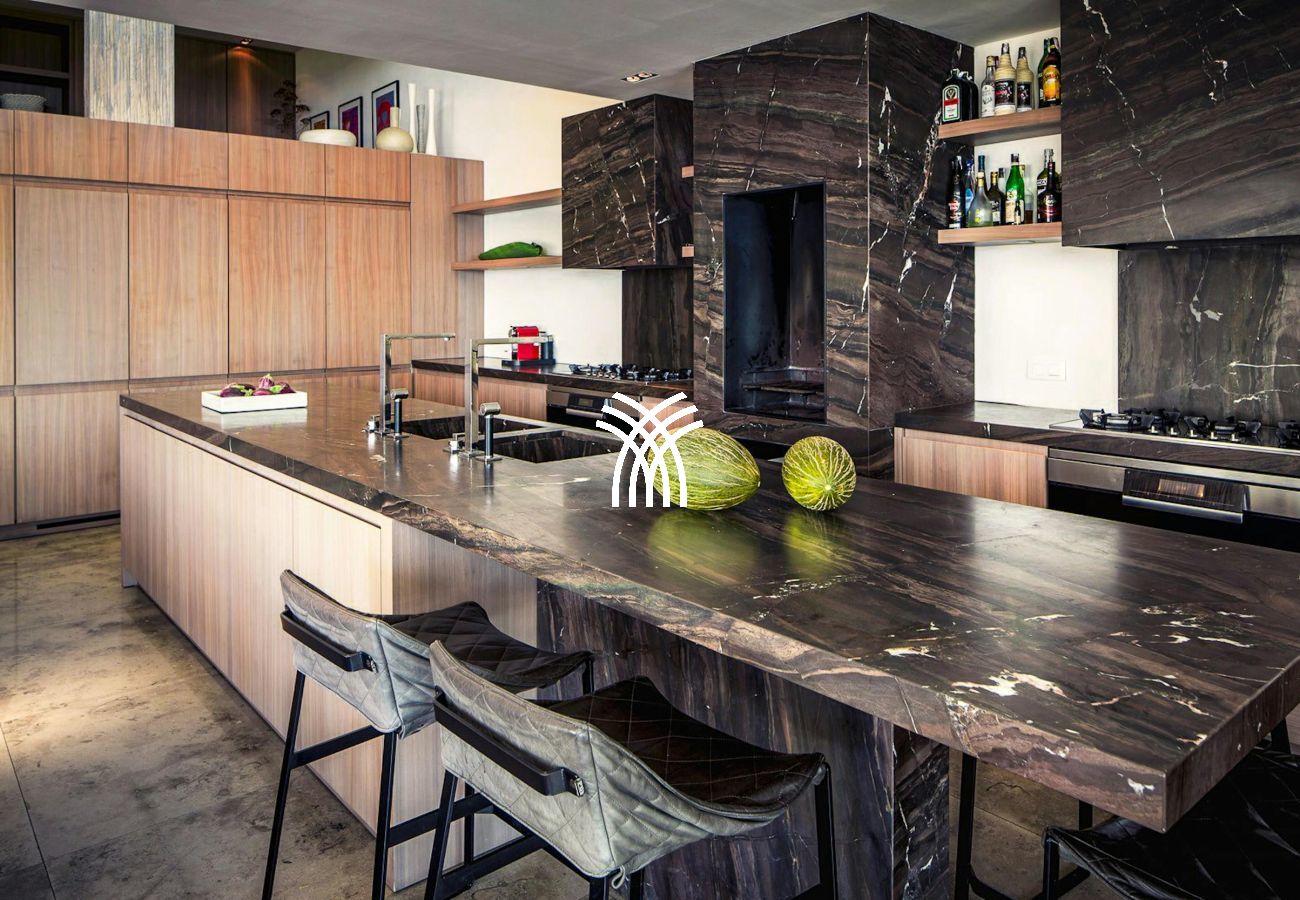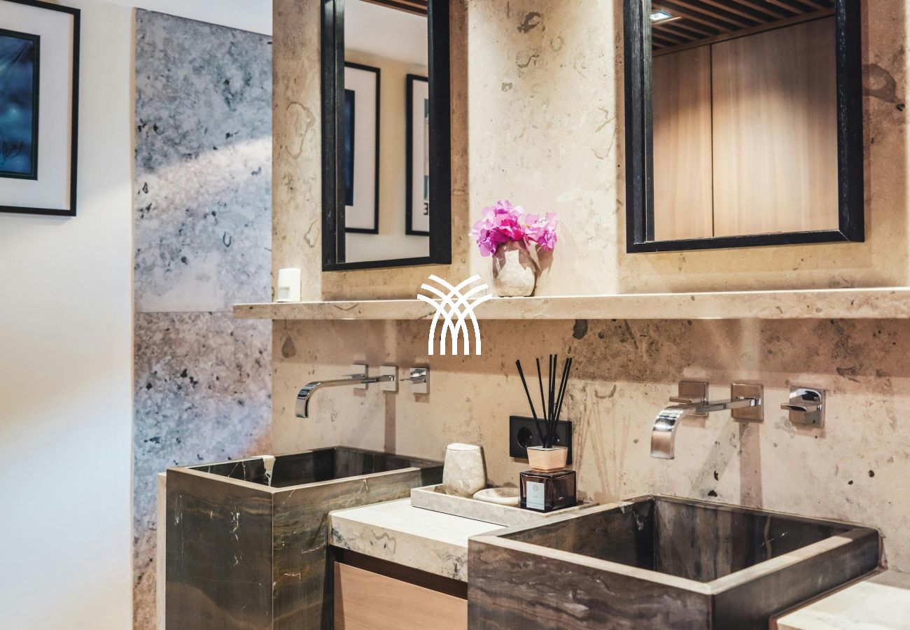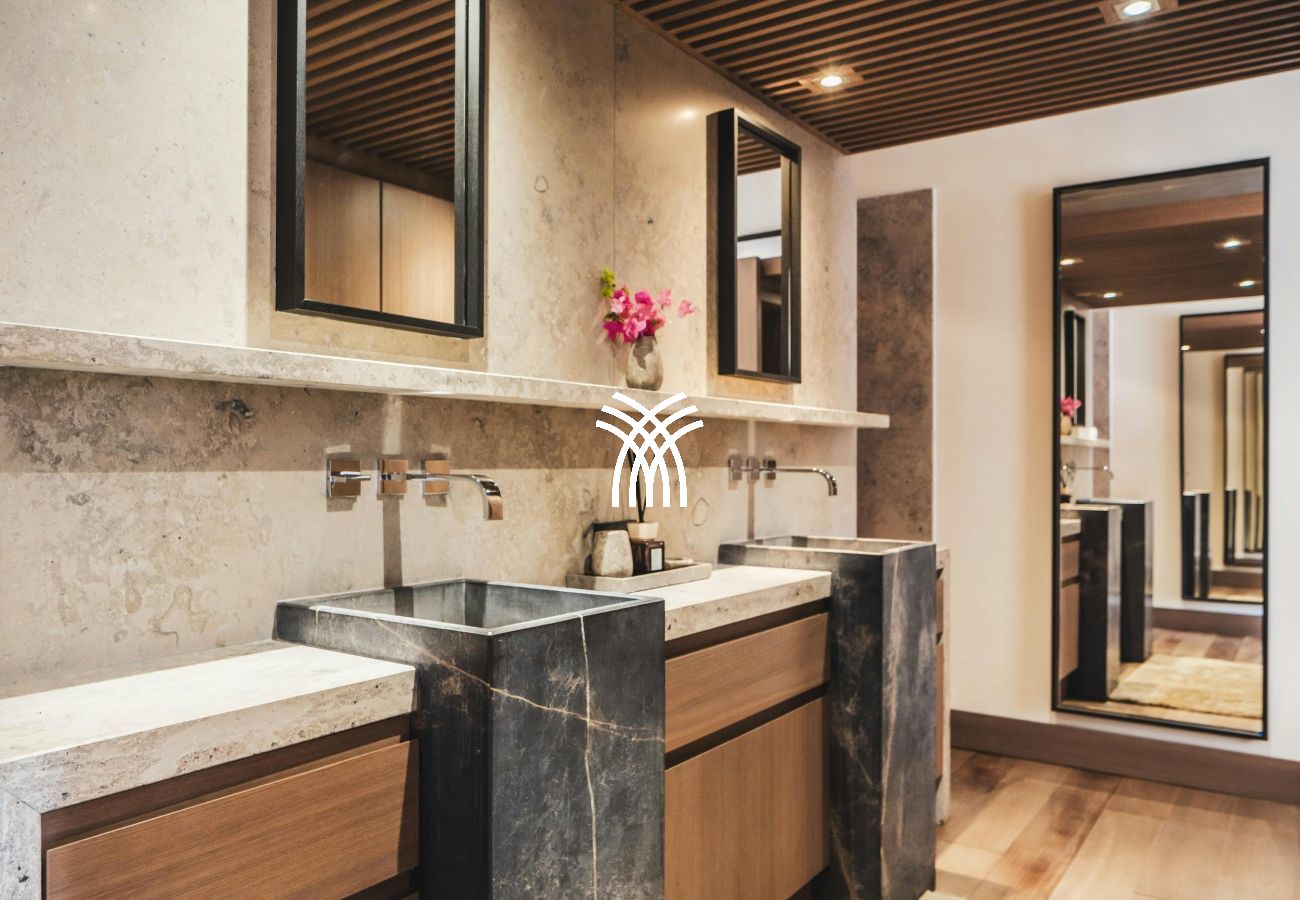 Inside, Ocean Paradise blends organic textures with contemporary elegance. Washed linens, natural wood finishes, and rich stone feature walls in gold and black travertine create a warm, earthy ambiance. The open-plan interior flows from a stylish dining area for sixteen to a cozy lounge with a home cinema, digital projector, and a modern fireplace. A sleek kitchen with a breakfast bar and top-tier appliances completes the space.