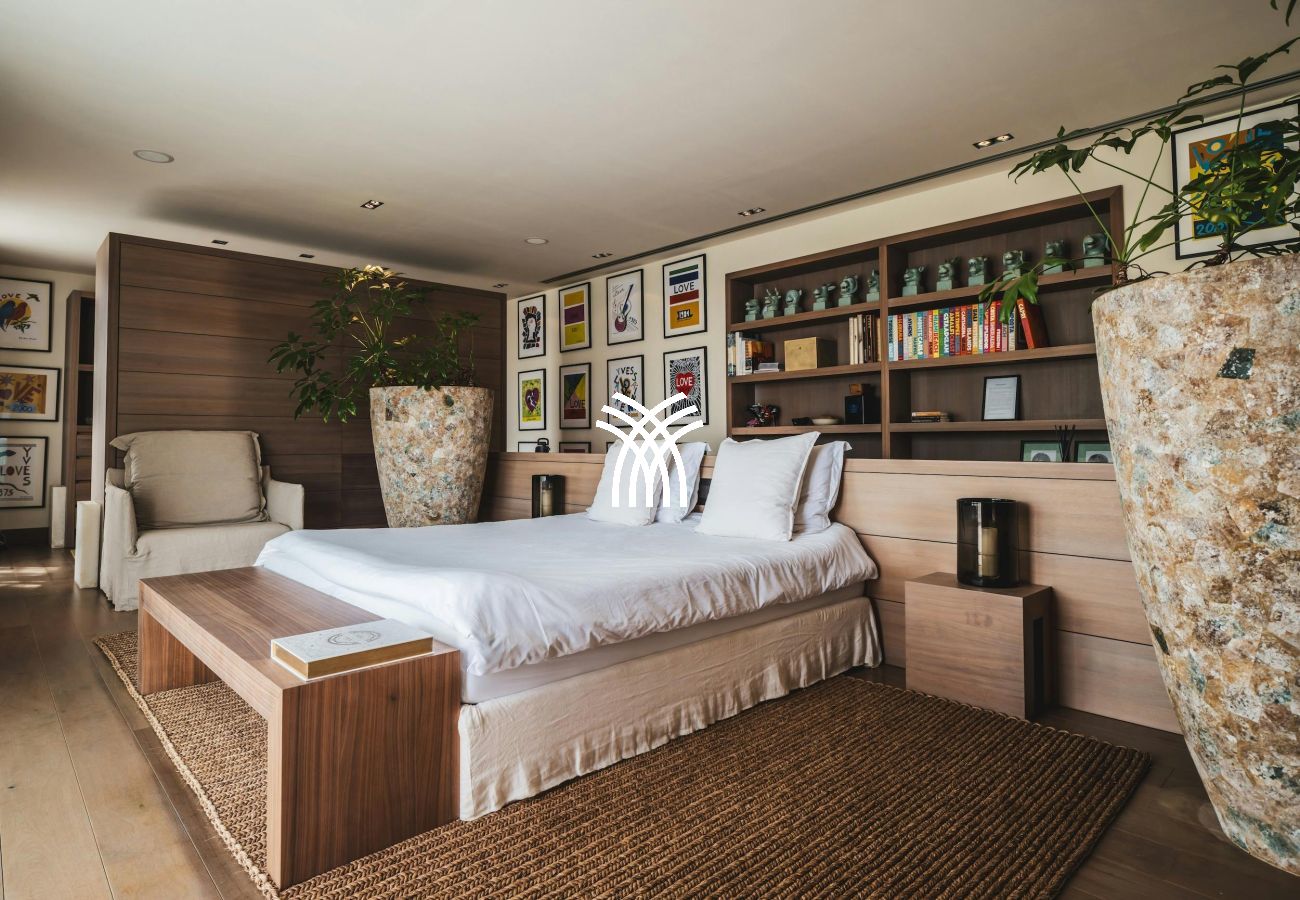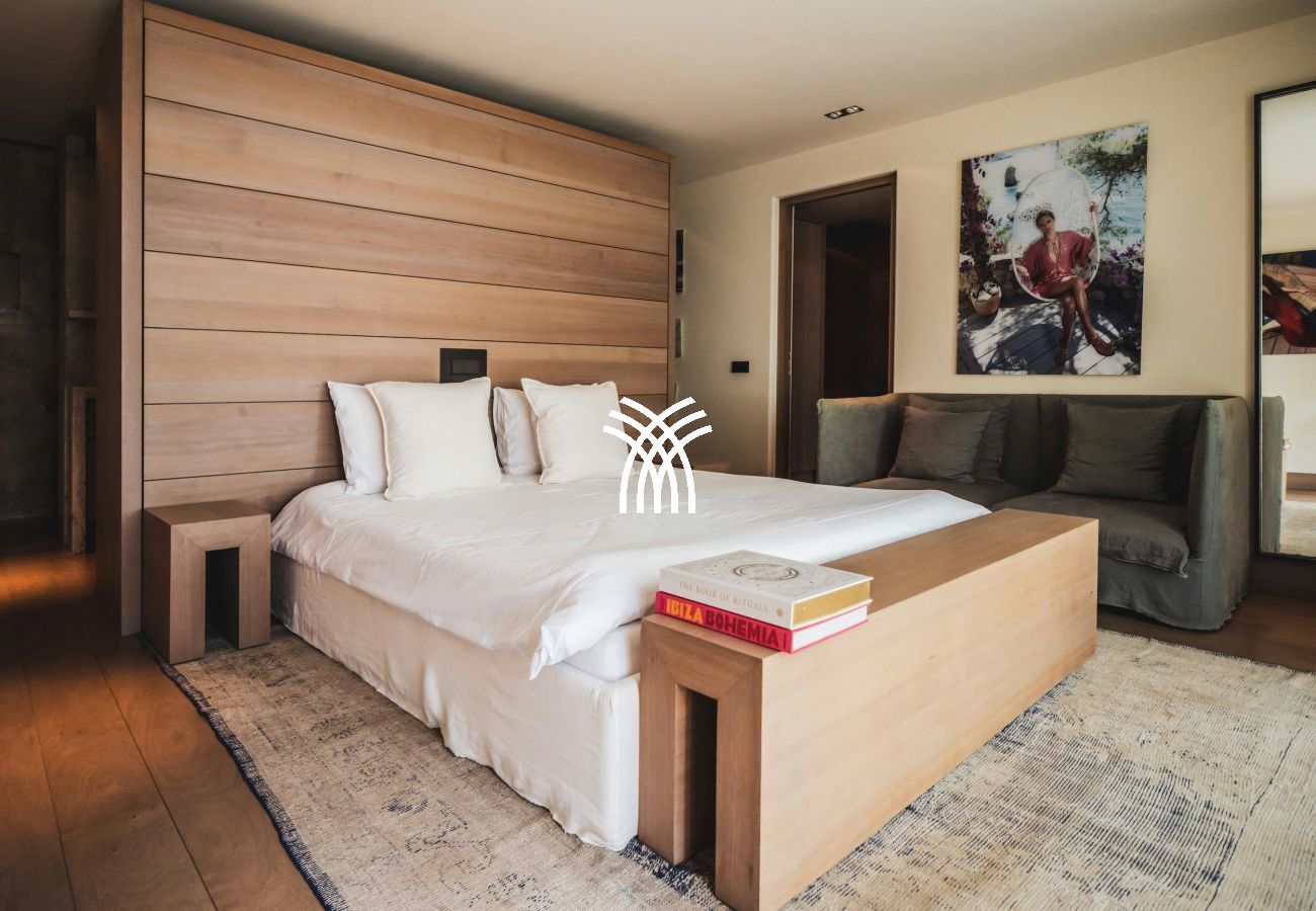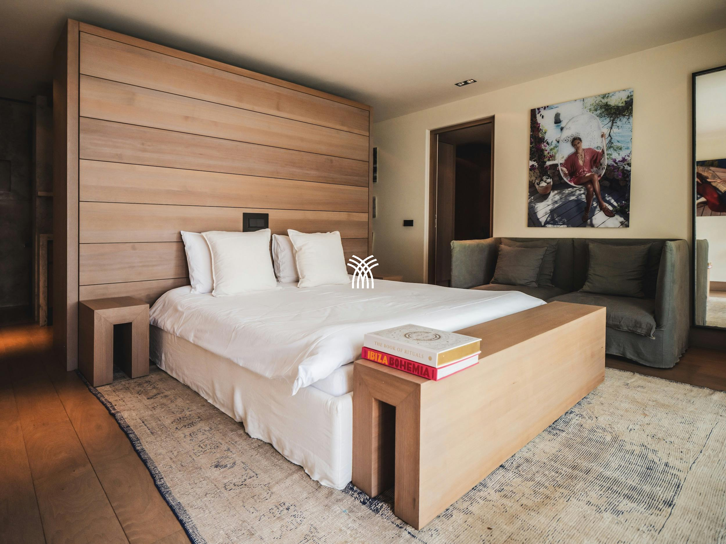 The six serene bedrooms are designed with comfort and versatility in mind, making this Luxury Villa Rental Ibiza ideal for families or groups of couples. Additional amenities include a fleet of vehicles for guest use and a professional staff team led by a dedicated chef, who operates from a separate fully equipped kitchen perfect for daily meals and private events.