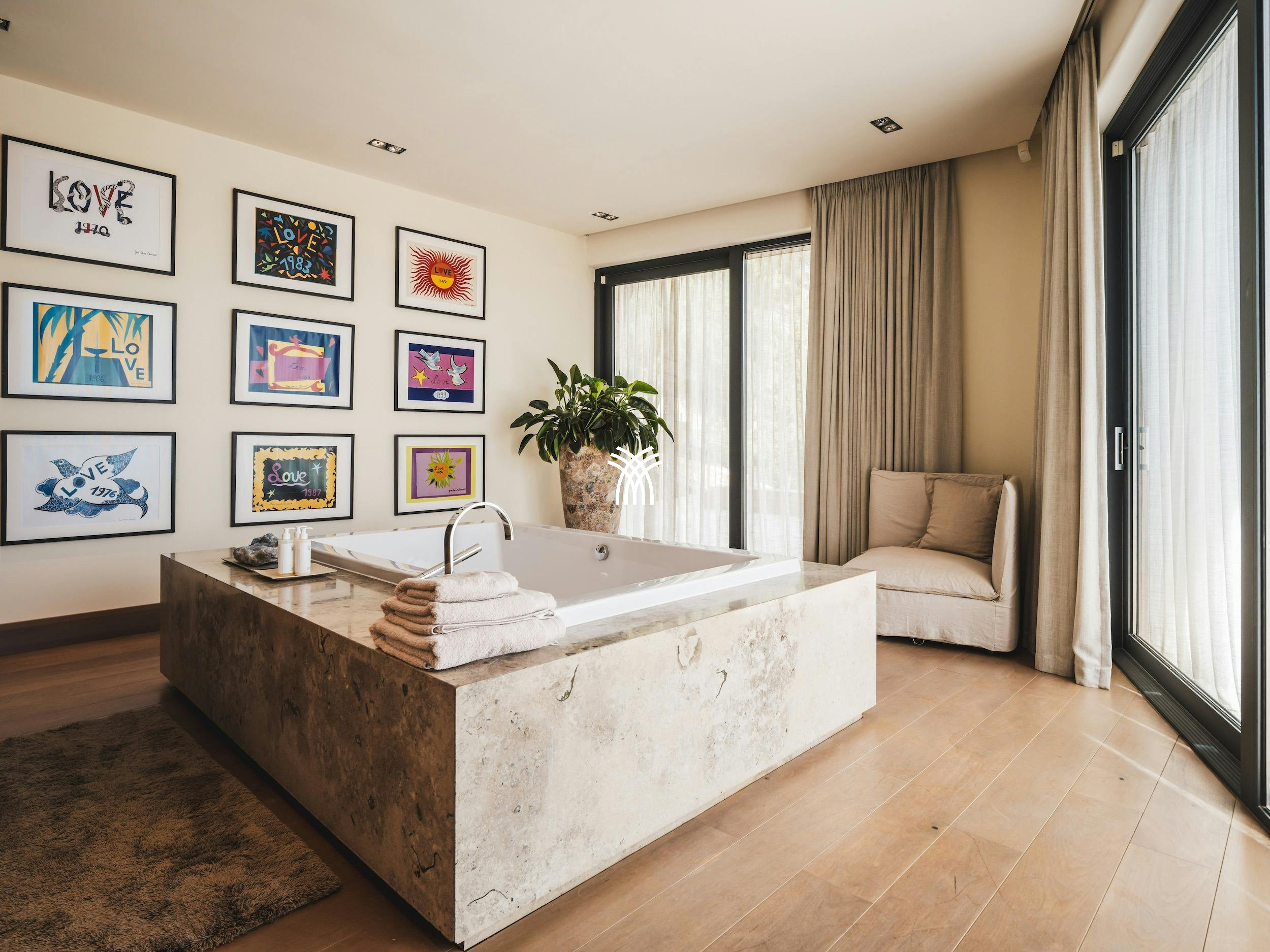 Inside, the villa exudes effortless elegance. Cool white interiors, polished concrete floors, and sumptuous lounge seating define the main living space, which is enhanced by a winter fireplace, Bose surround sound, and international satellite TV. The sleek, fully equipped kitchen includes premium appliances such as a Gaggenau coffee machine and Liebherr wine cooler. Adjacent, the formal dining room provides an intimate atmosphere with views over the peaceful courtyard.