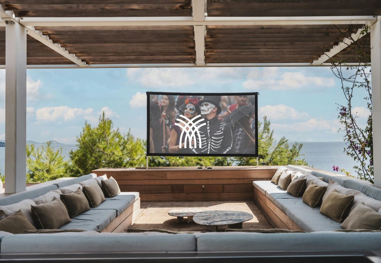 Inside, Villa Sabrina features interiors that blend minimalist elegance with total comfort. Cool white tones, polished floors, and natural textures evoke a calm and serene ambiance. The spacious open-plan lounge and dining area seamlessly connect with the terrace, while a cozy media room provides a cinematic escape. The fully equipped kitchen is ideal for preparing family meals or catering events, complete with charming garden views.