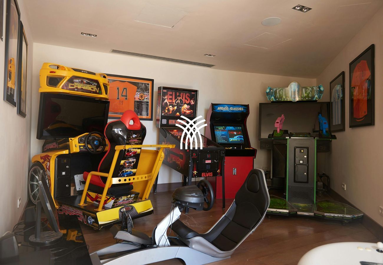For wellness and entertainment, the villa includes a private spa with a steam room, massage tables, and a state-of-the-art gym that opens to sea views. A large games room features ping pong, pool, table football, and vintage arcade games for endless fun.