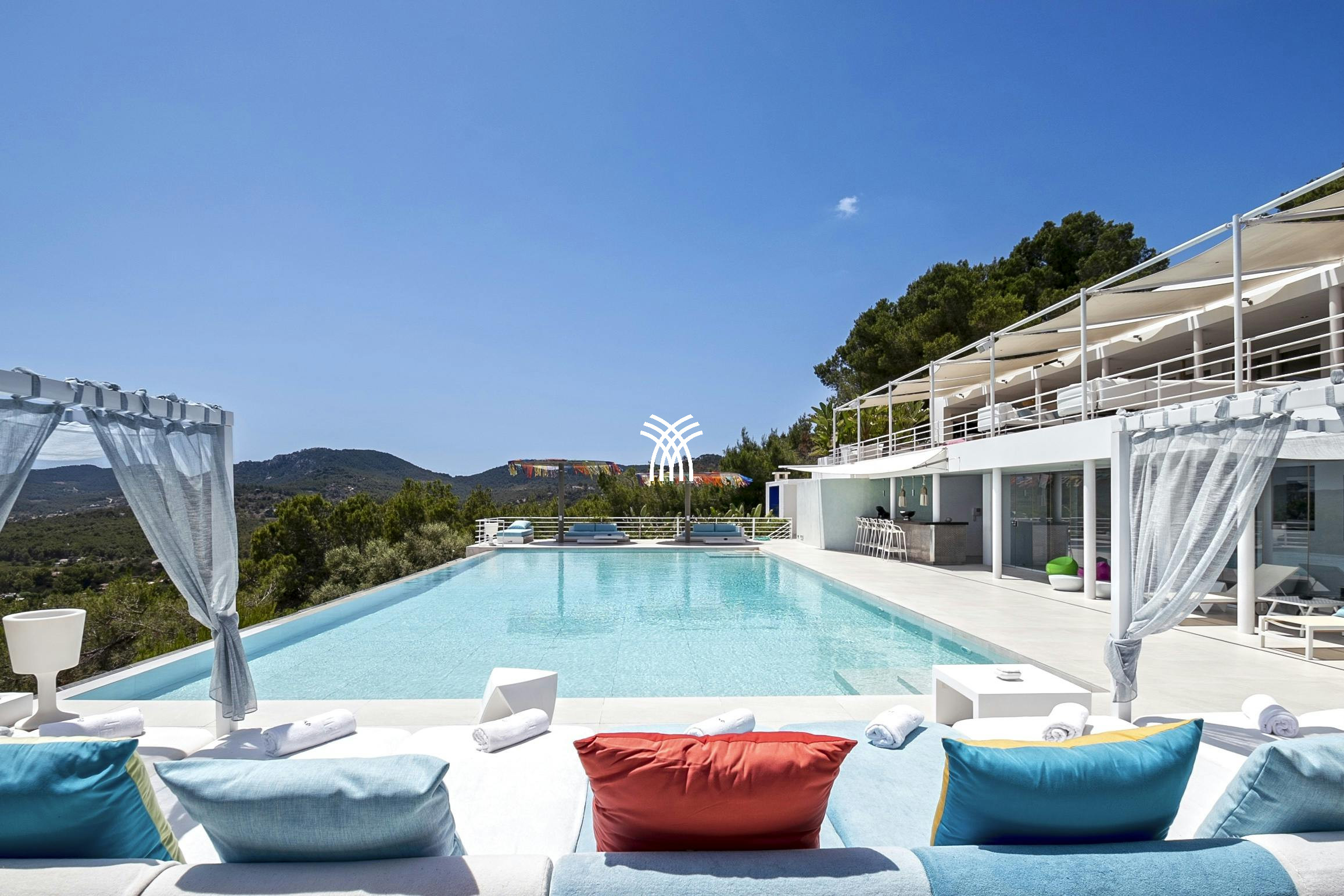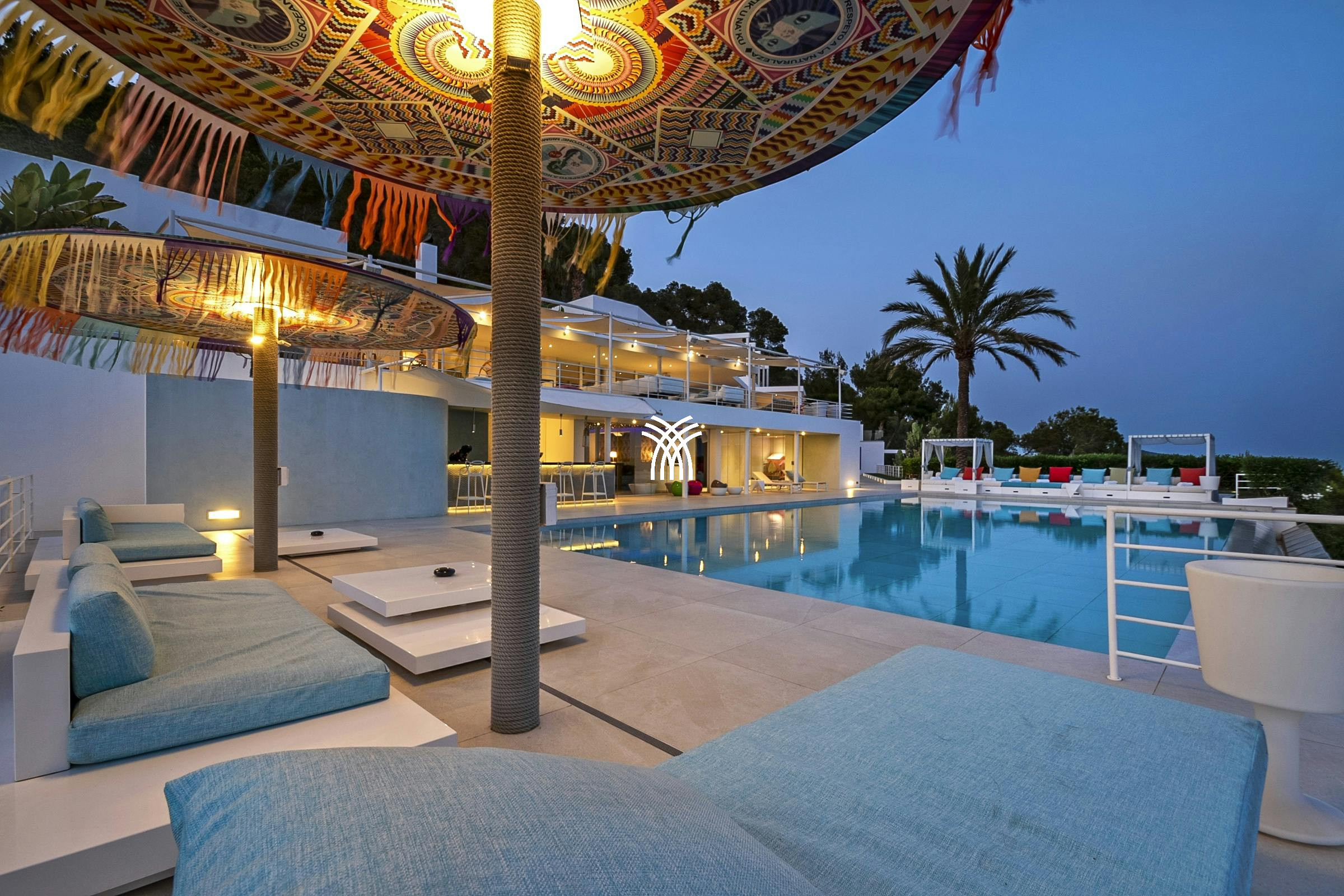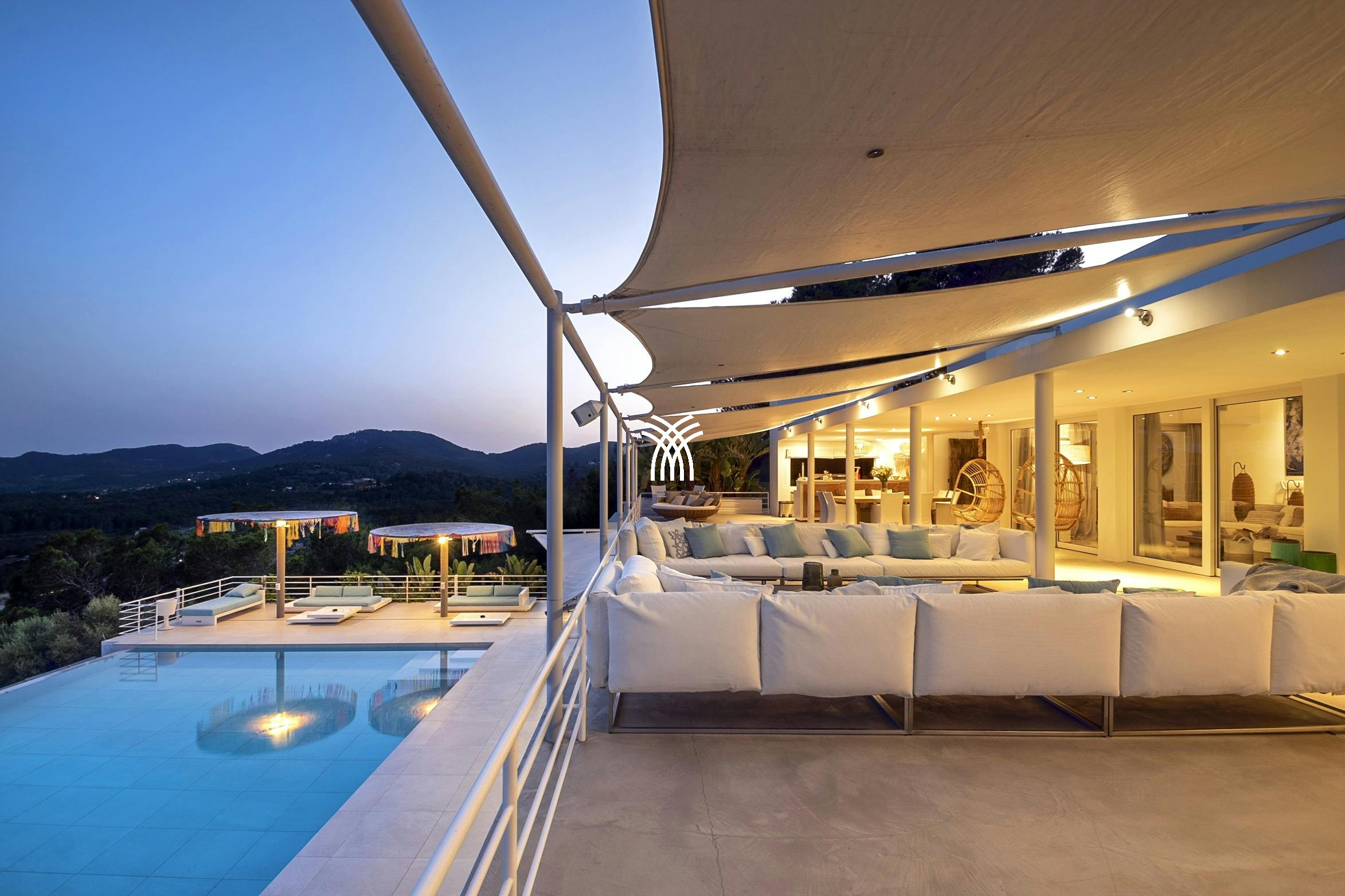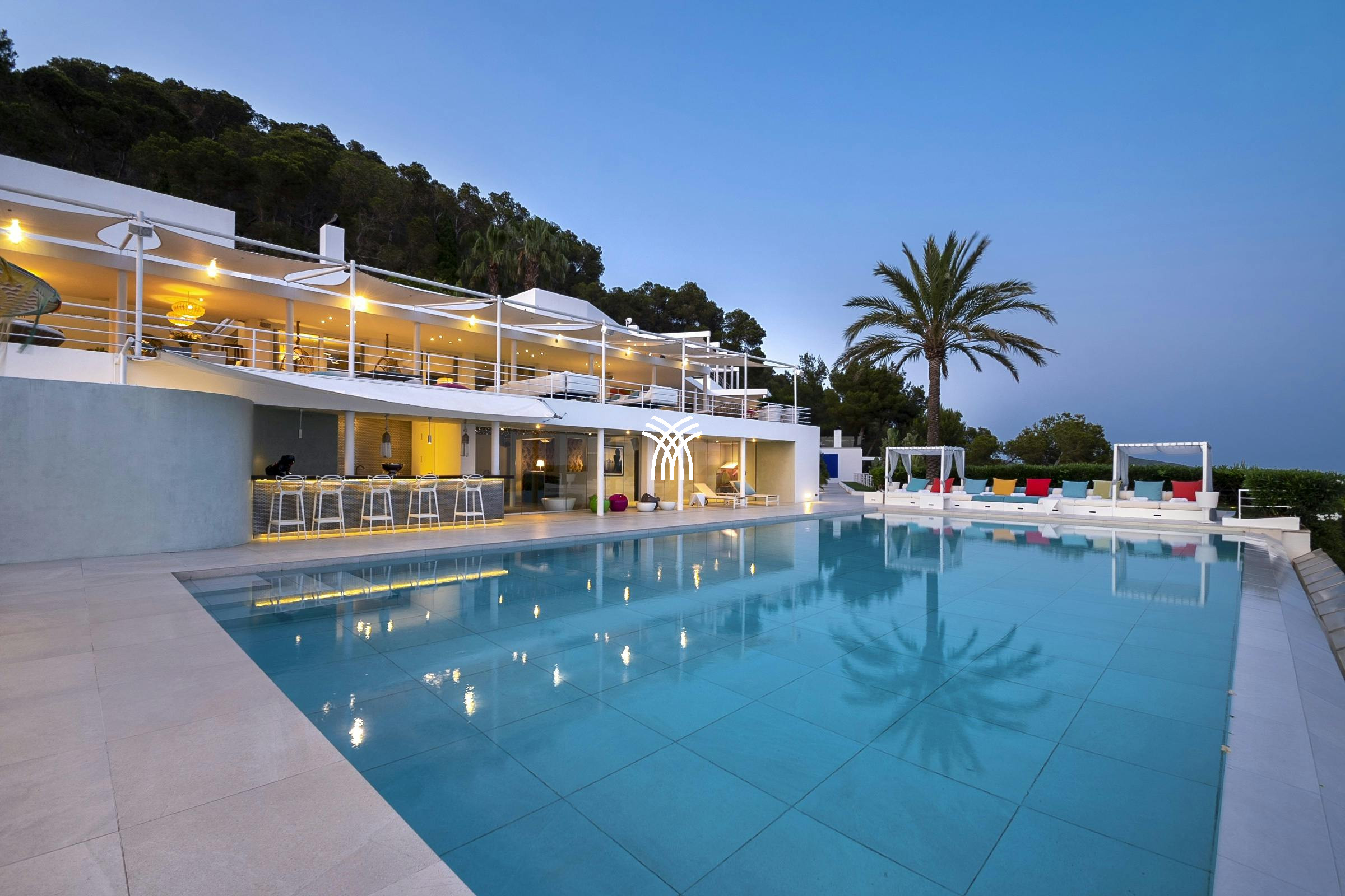 Experience elevated island living with this Luxury Villa Rental Ibiza, an impressive hillside retreat offering breathtaking panoramic views over the Balearic Sea. Just 4km from Ibiza Town, this exclusive property is perfectly positioned to overlook Playa d’en Bossa, Cap des Falco, and the shimmering Las Salinas salt flats, all the way to the island of Formentera.