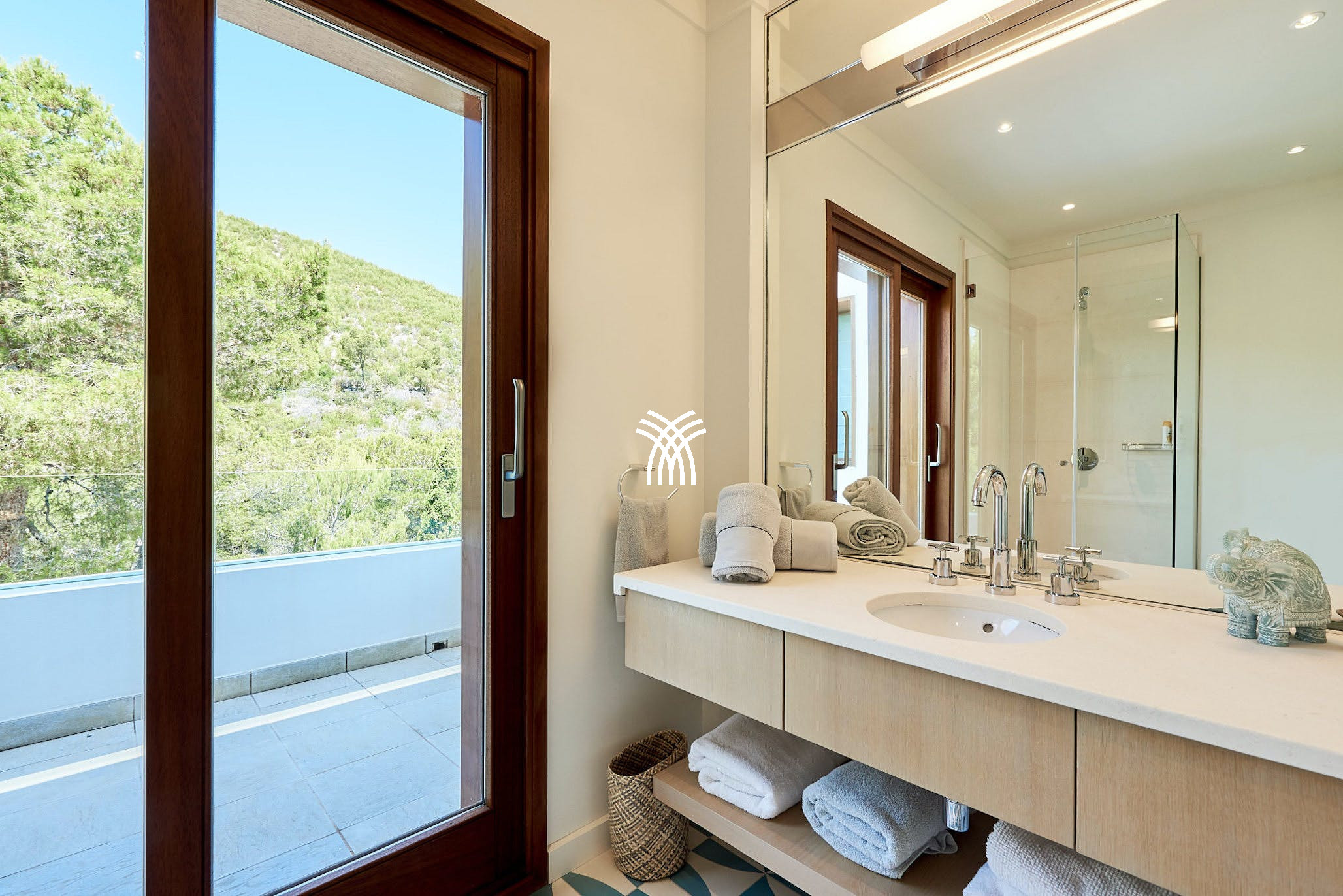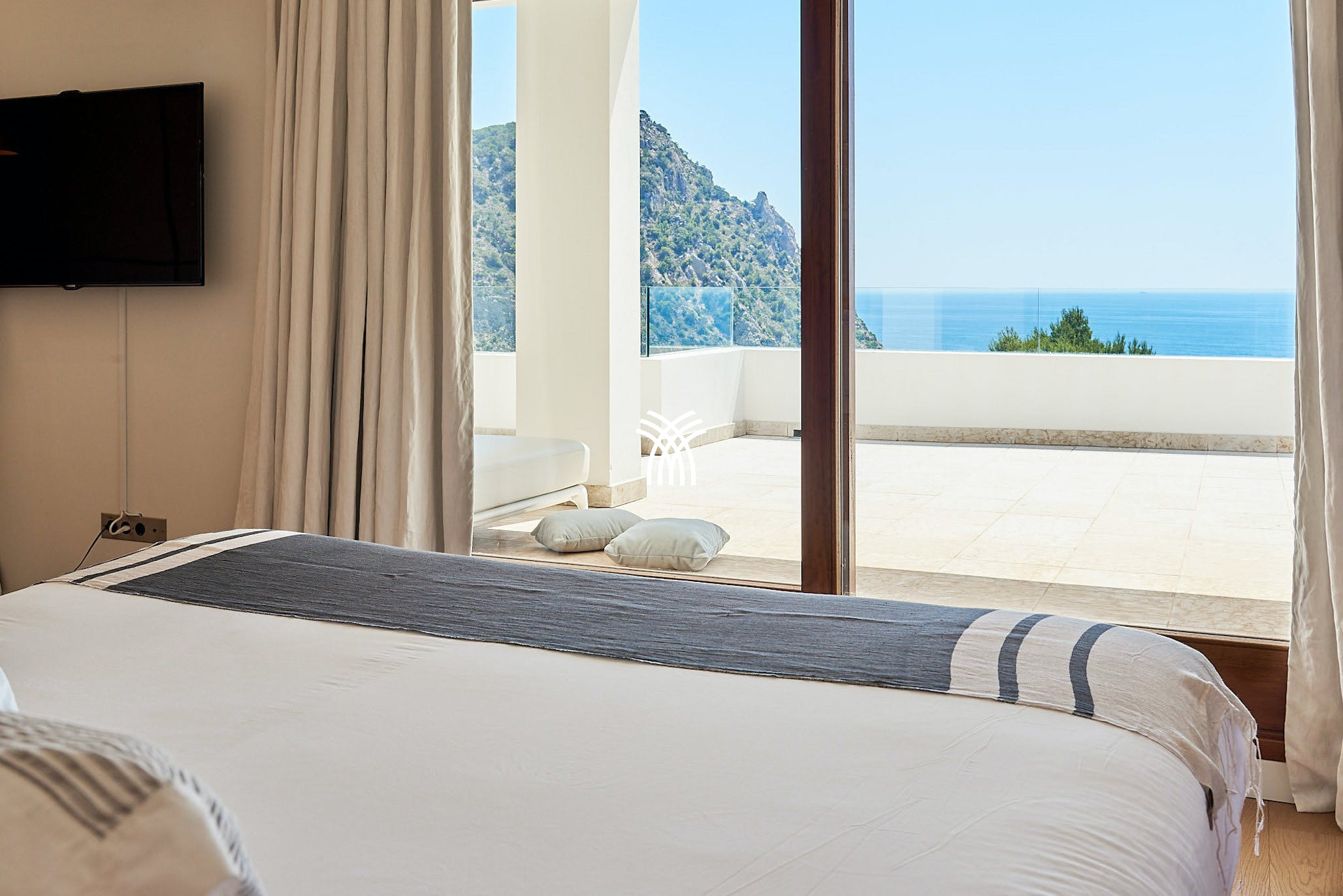 Villa Viviana hosts three stunning double bedrooms with en-suite bathrooms. Two are located in the main house, each with panoramic sea views, air conditioning, and underfloor heating. The top floor suite offers added privacy, a large terrace, and commanding views of Es Vedra and the surrounding coastline.