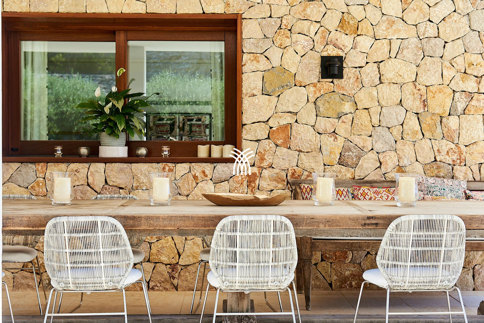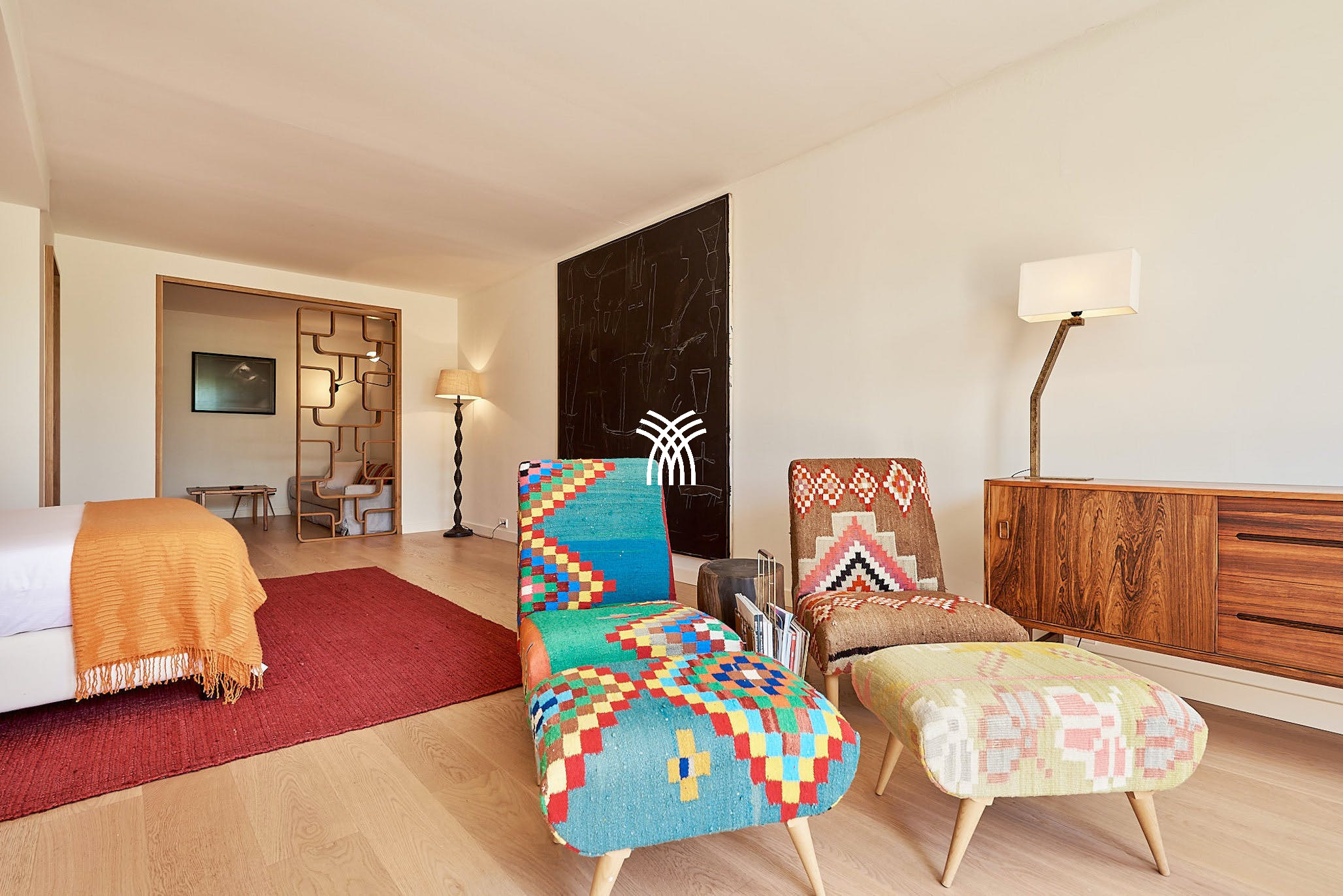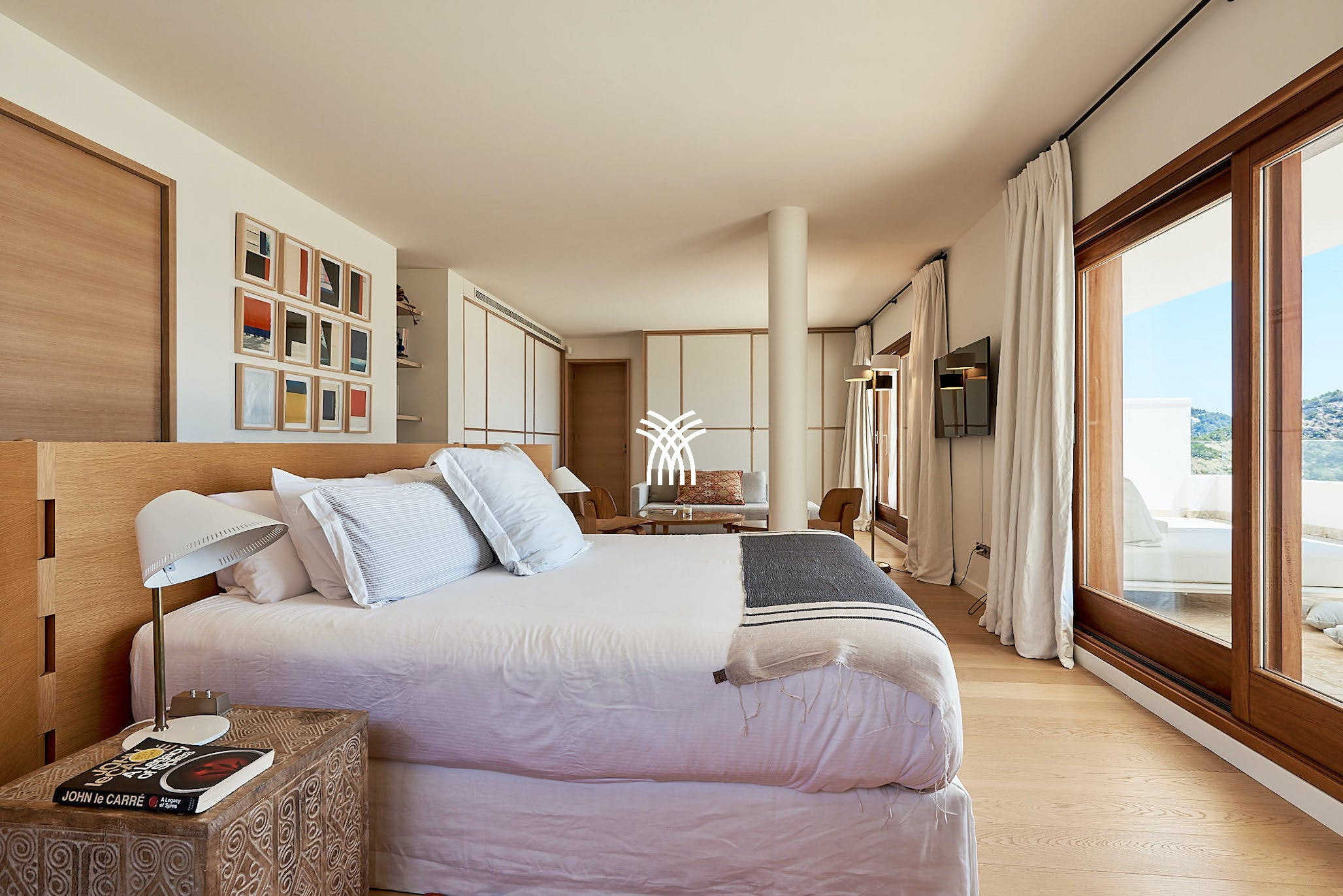 The villa’s shaded terraces feature plush sofa seating, a dining area for ten, and stylish al fresco lounges under sail-like awnings—perfect for both peaceful solitude and vibrant gatherings. Inside, sunlit interiors combine modern Ibizan elegance with mid-century flair. The open-plan living space includes cozy lounges, eclectic artwork, and a dining table that flows seamlessly into the outdoors.
