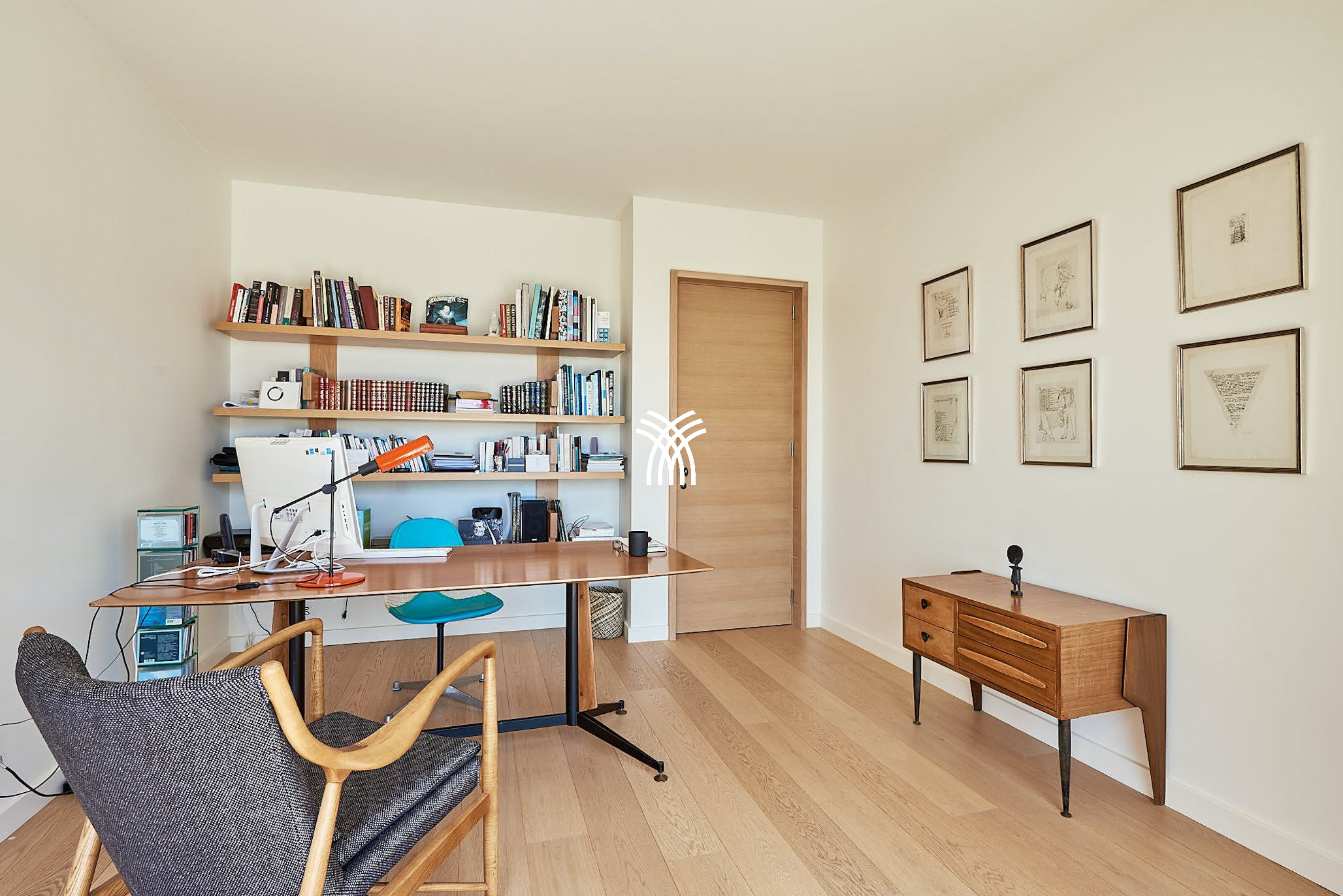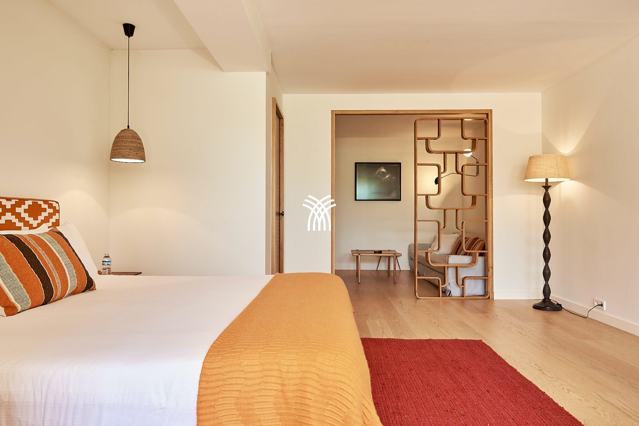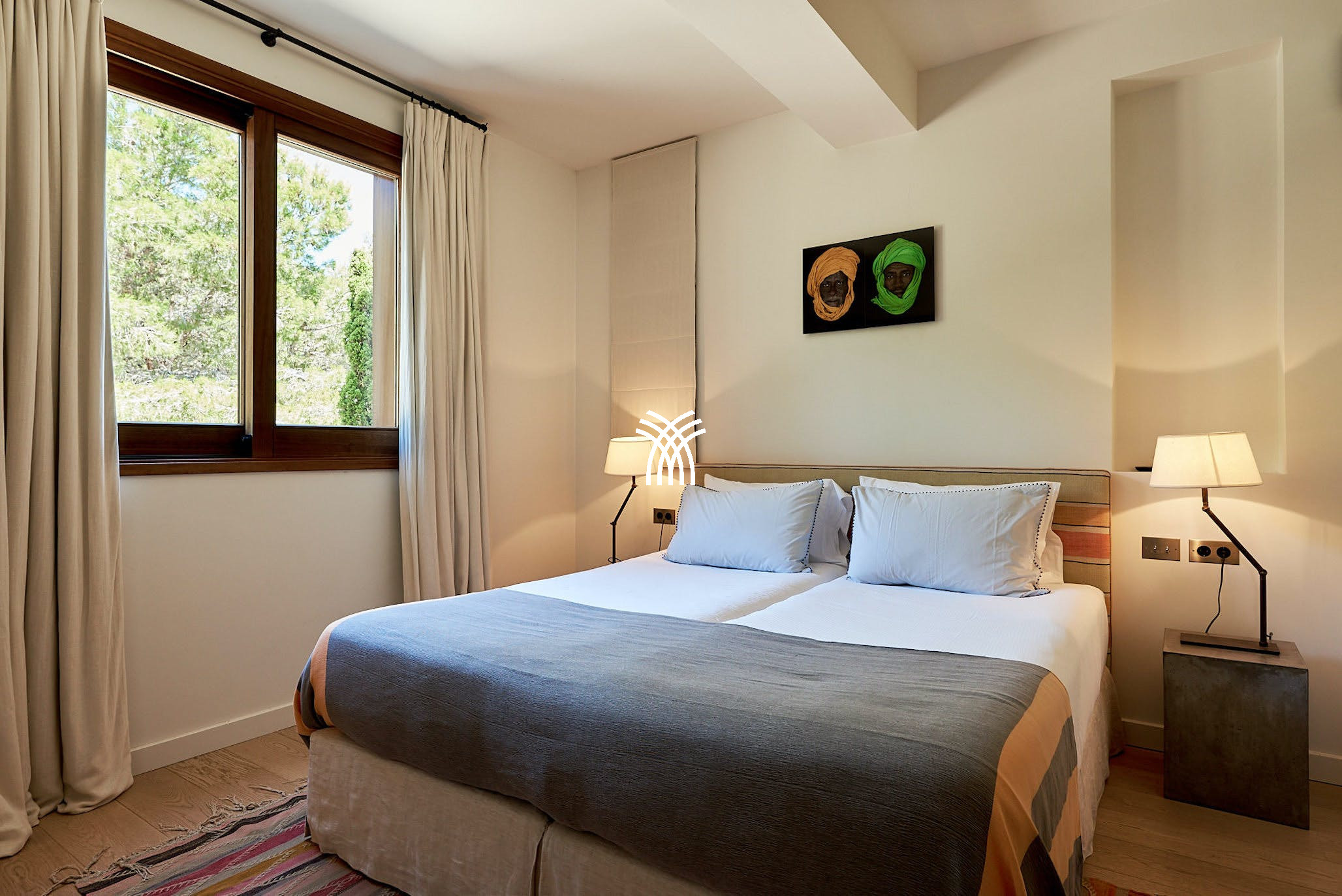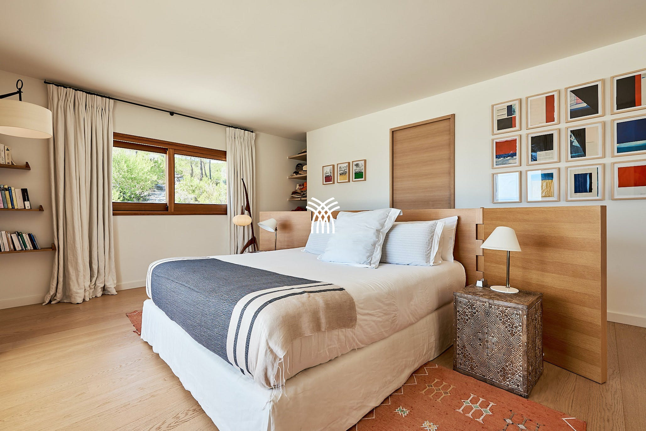 The villa’s shaded terraces feature plush sofa seating, a dining area for ten, and stylish al fresco lounges under sail-like awnings—perfect for both peaceful solitude and vibrant gatherings. Inside, sunlit interiors combine modern Ibizan elegance with mid-century flair. The open-plan living space includes cozy lounges, eclectic artwork, and a dining table that flows seamlessly into the outdoors.