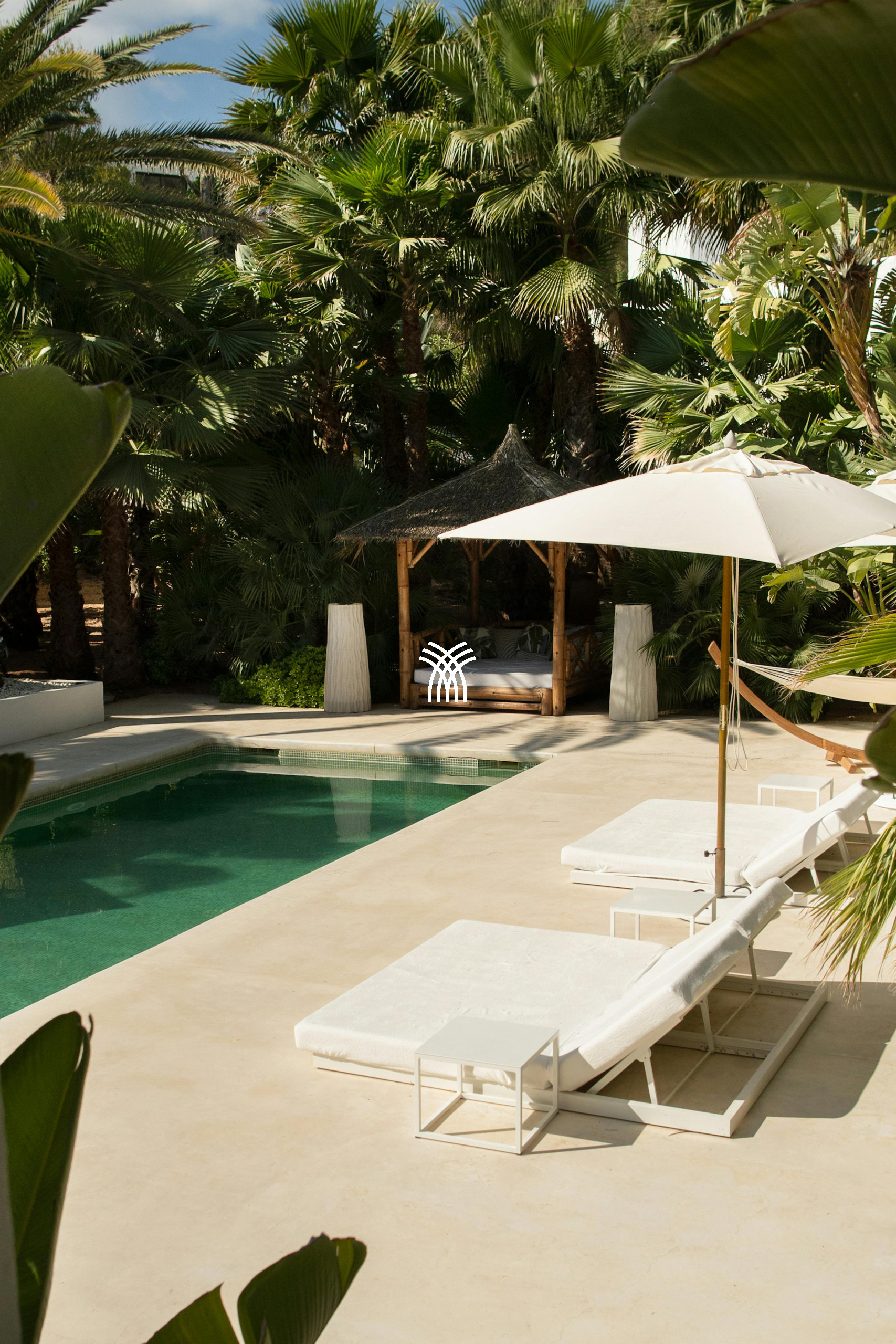 At the heart of the property lies a spectacular 17-meter swimming pool with an immaculate white deck that exudes timeless art deco flair. Surrounding the pool, Balinese-style double loungers, chic sail-style gazebos, and hidden rustic daybeds create multiple serene lounging spots nestled throughout the gardens. Whether you're sunbathing by the water or relaxing in the shade of the trees, the outdoor spaces are perfect for luxurious leisure.