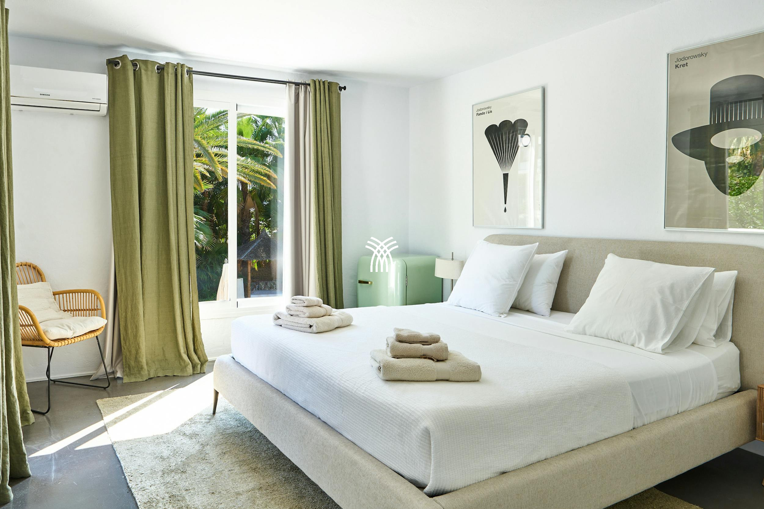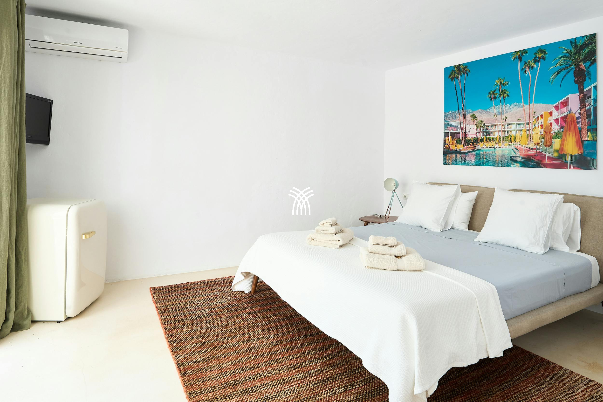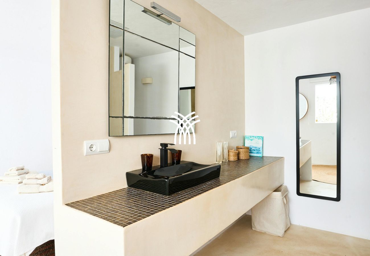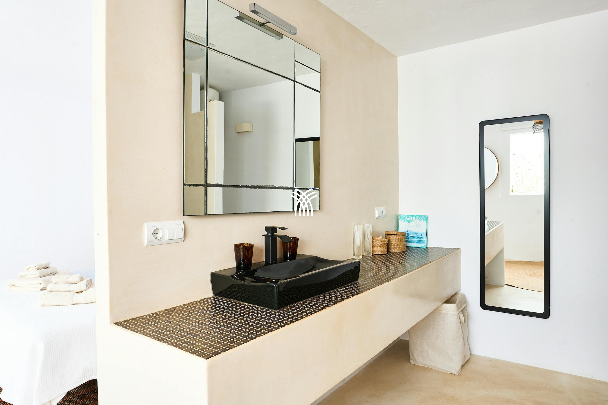 Villa Viviana hosts three stunning double bedrooms with en-suite bathrooms. Two are located in the main house, each with panoramic sea views, air conditioning, and underfloor heating. The top floor suite offers added privacy, a large terrace, and commanding views of Es Vedra and the surrounding coastline.