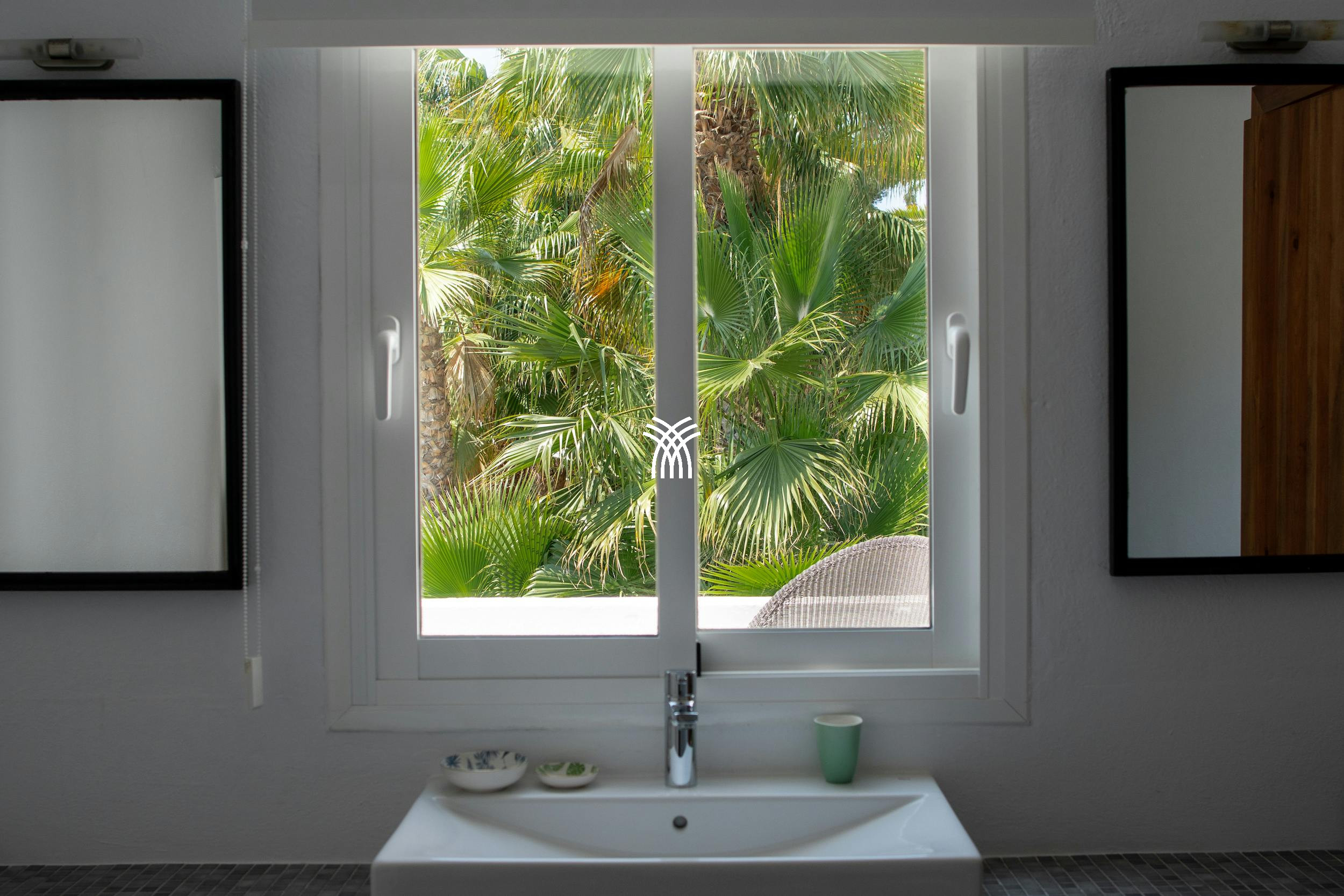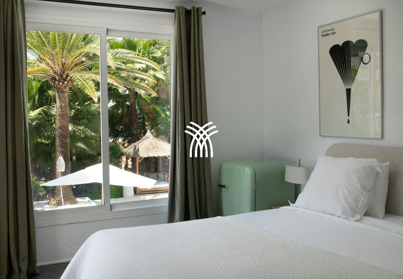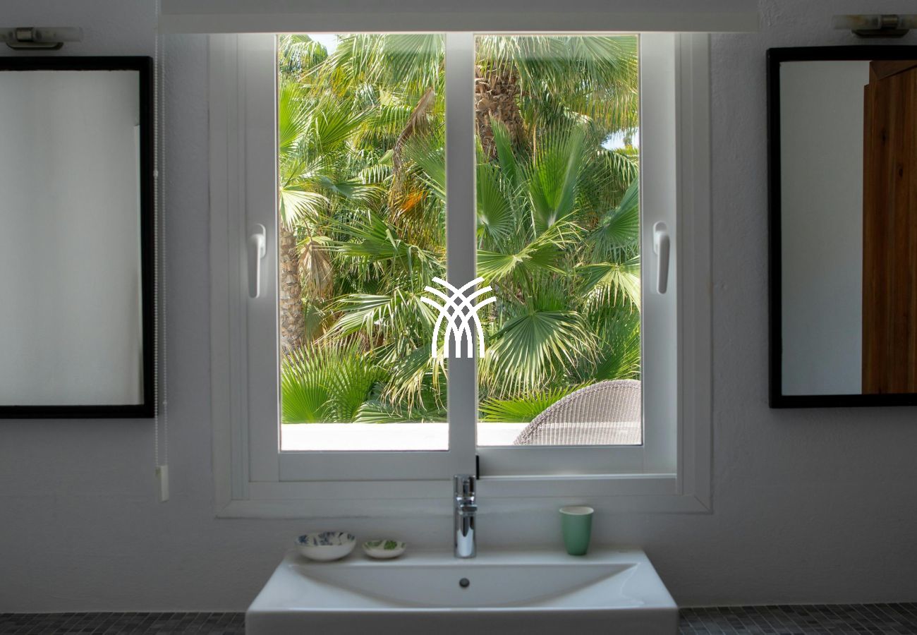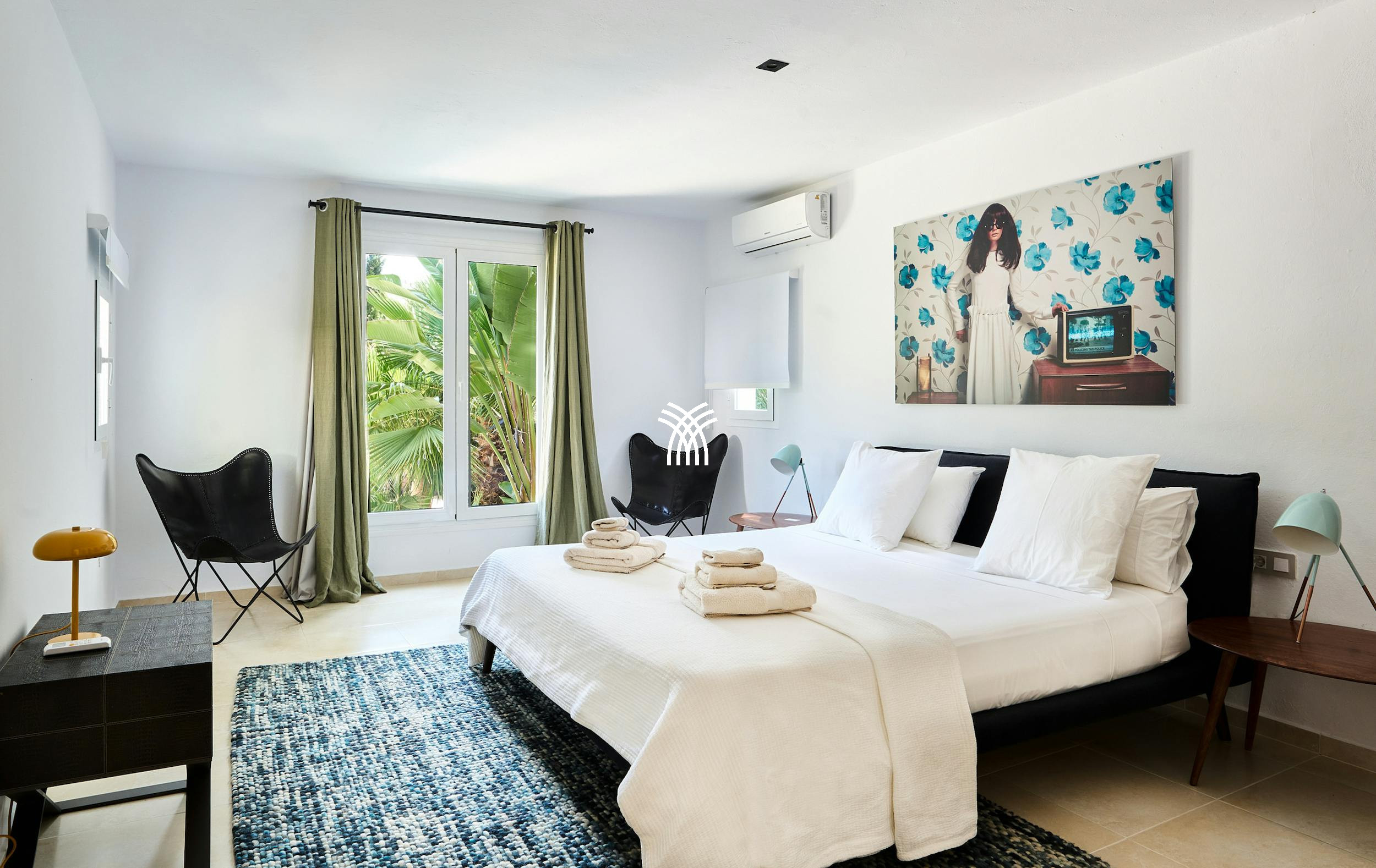 Villa Viviana hosts three stunning double bedrooms with en-suite bathrooms. Two are located in the main house, each with panoramic sea views, air conditioning, and underfloor heating. The top floor suite offers added privacy, a large terrace, and commanding views of Es Vedra and the surrounding coastline.
