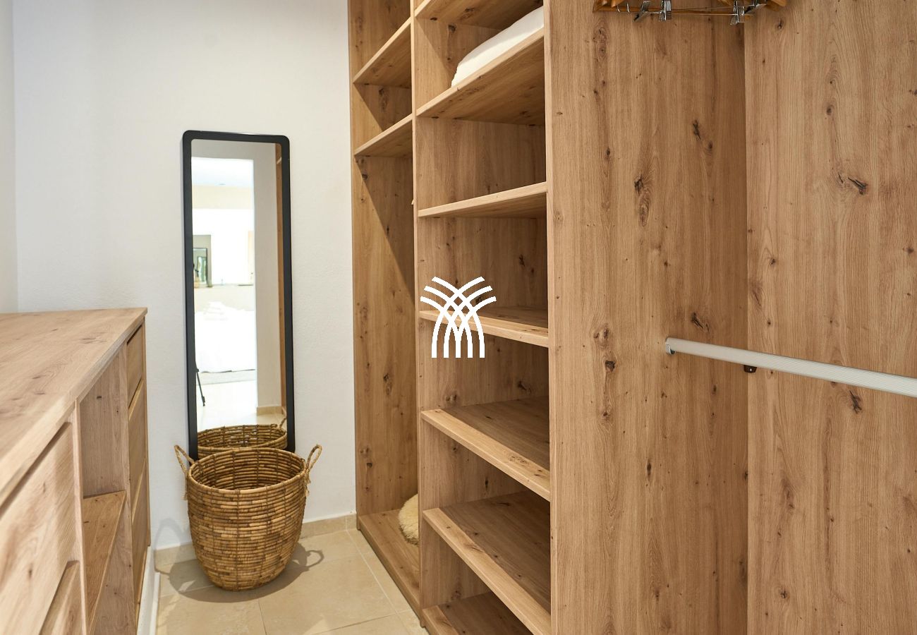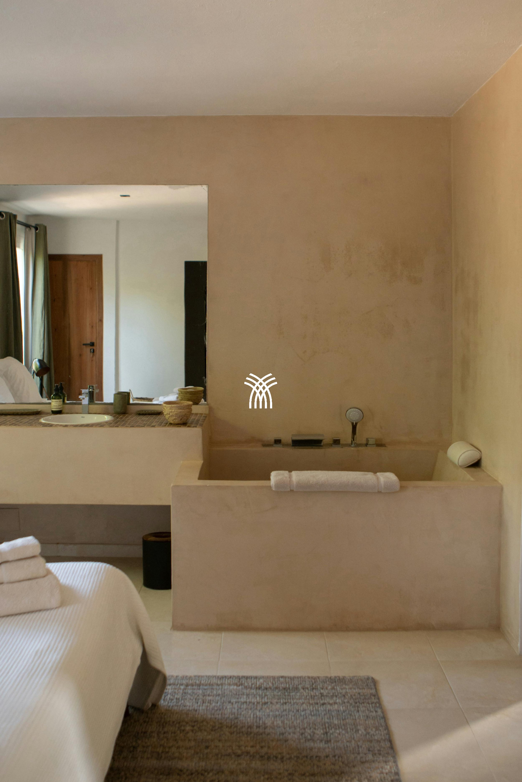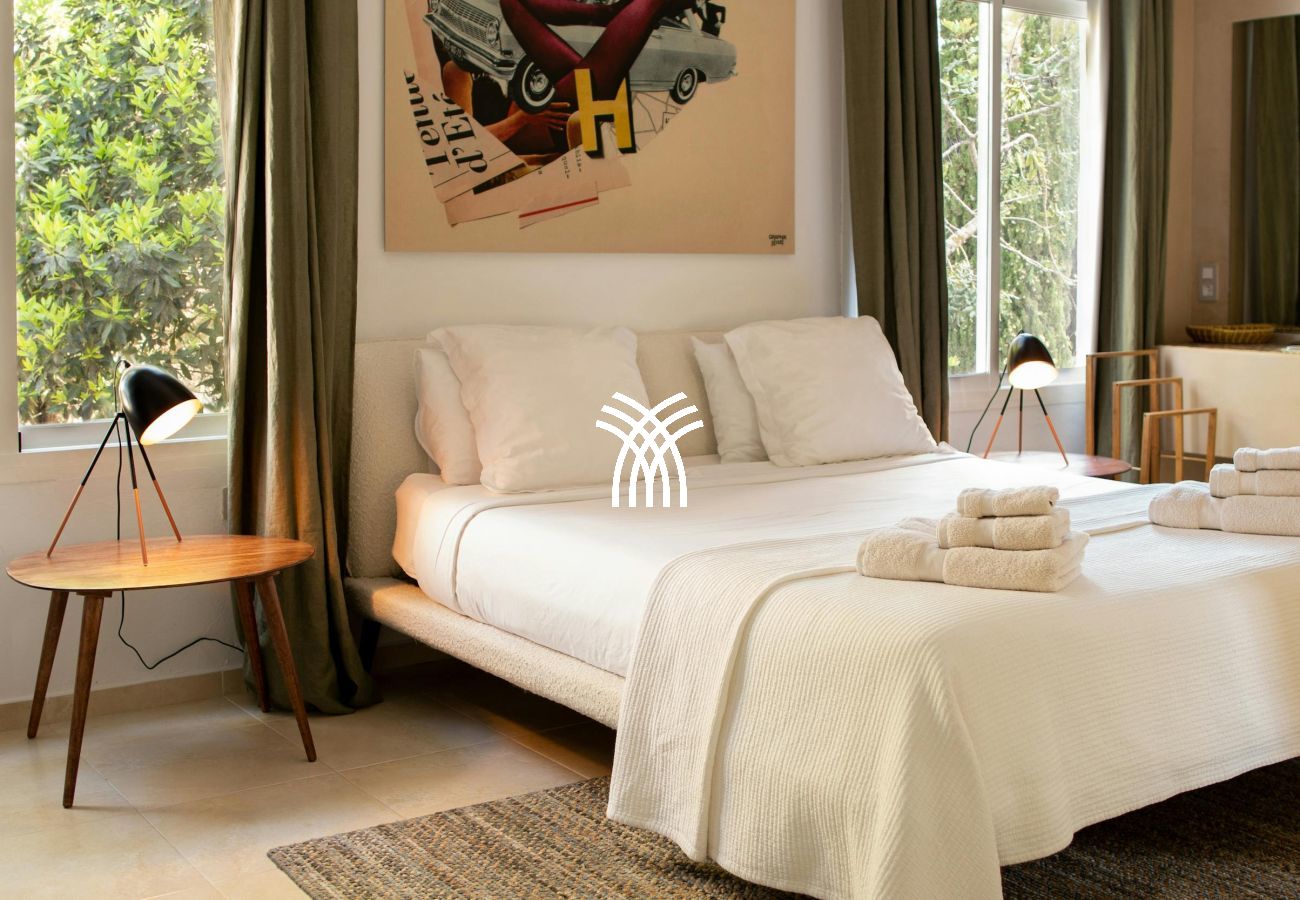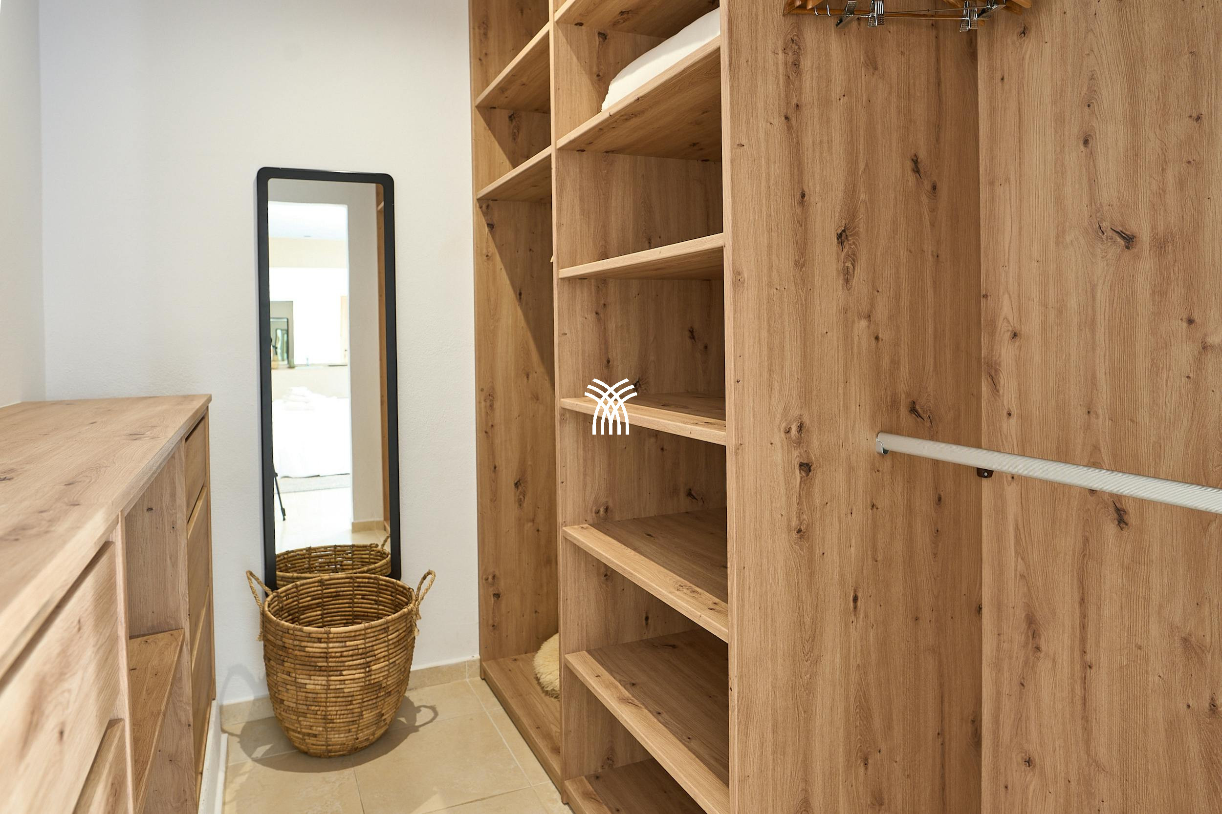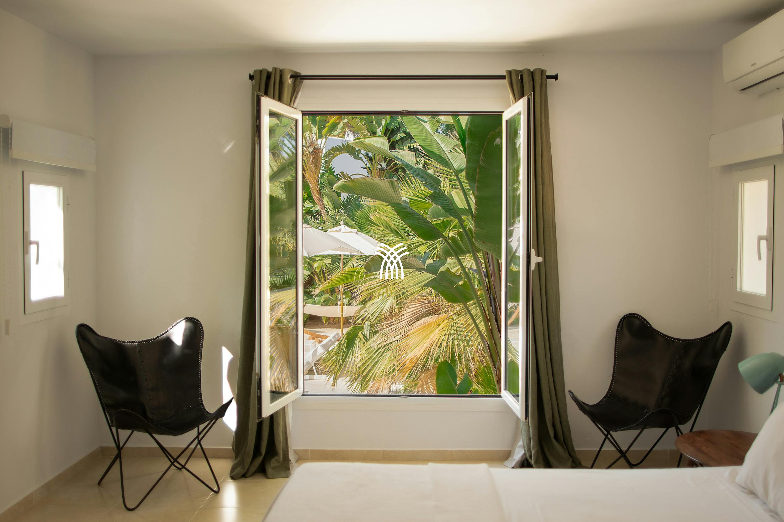 Villa Viviana hosts three stunning double bedrooms with en-suite bathrooms. Two are located in the main house, each with panoramic sea views, air conditioning, and underfloor heating. The top floor suite offers added privacy, a large terrace, and commanding views of Es Vedra and the surrounding coastline.