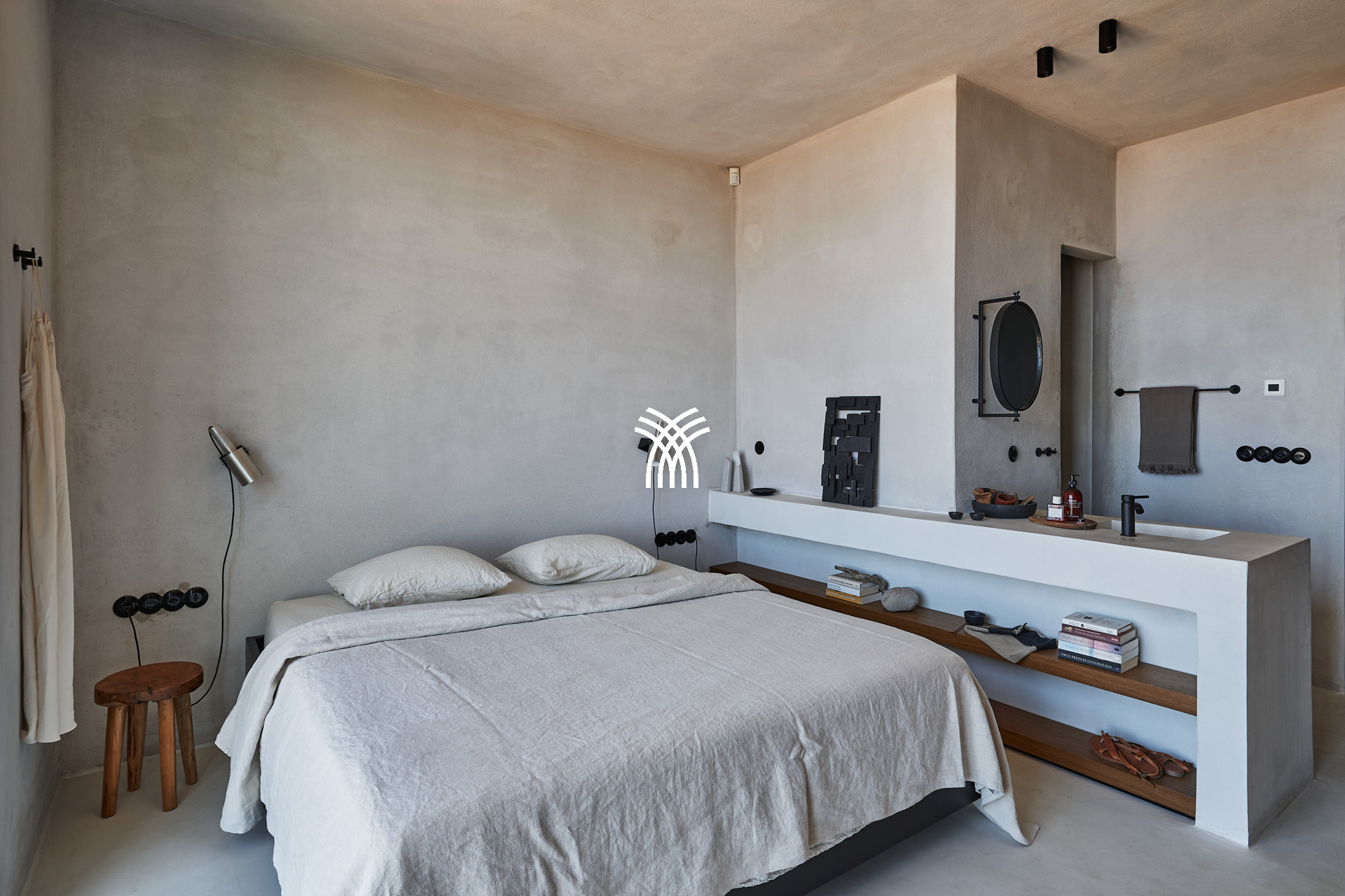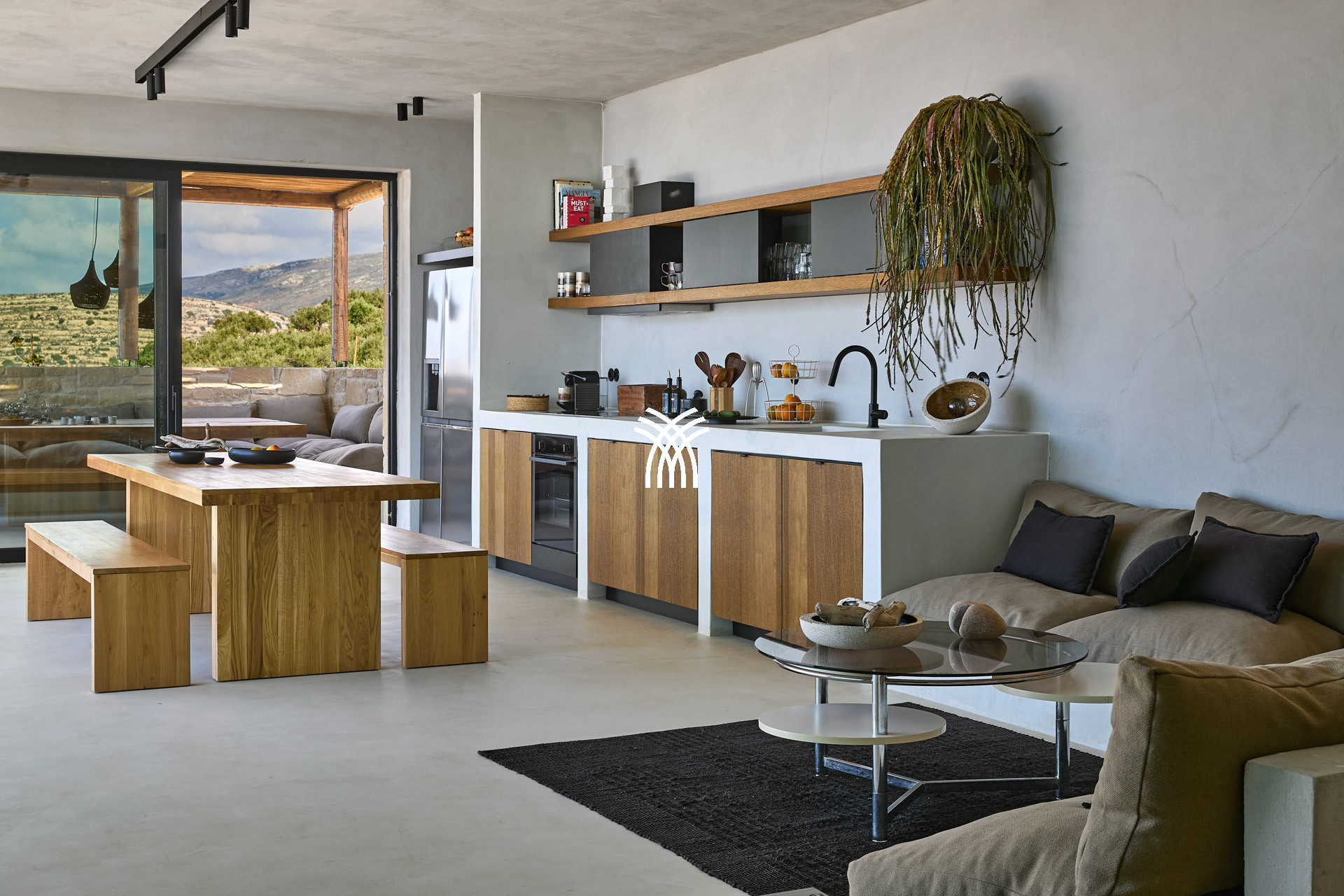 The living room, bathed in light, revolves around a fully equipped open kitchen: oven, large stovetop, American refrigerator with filtered water and ice dispenser, citrus press, Nespresso machine... The space is decorated with vintage furniture, smooth cement finishes and natural textiles, creating a warm and refined atmosphere.