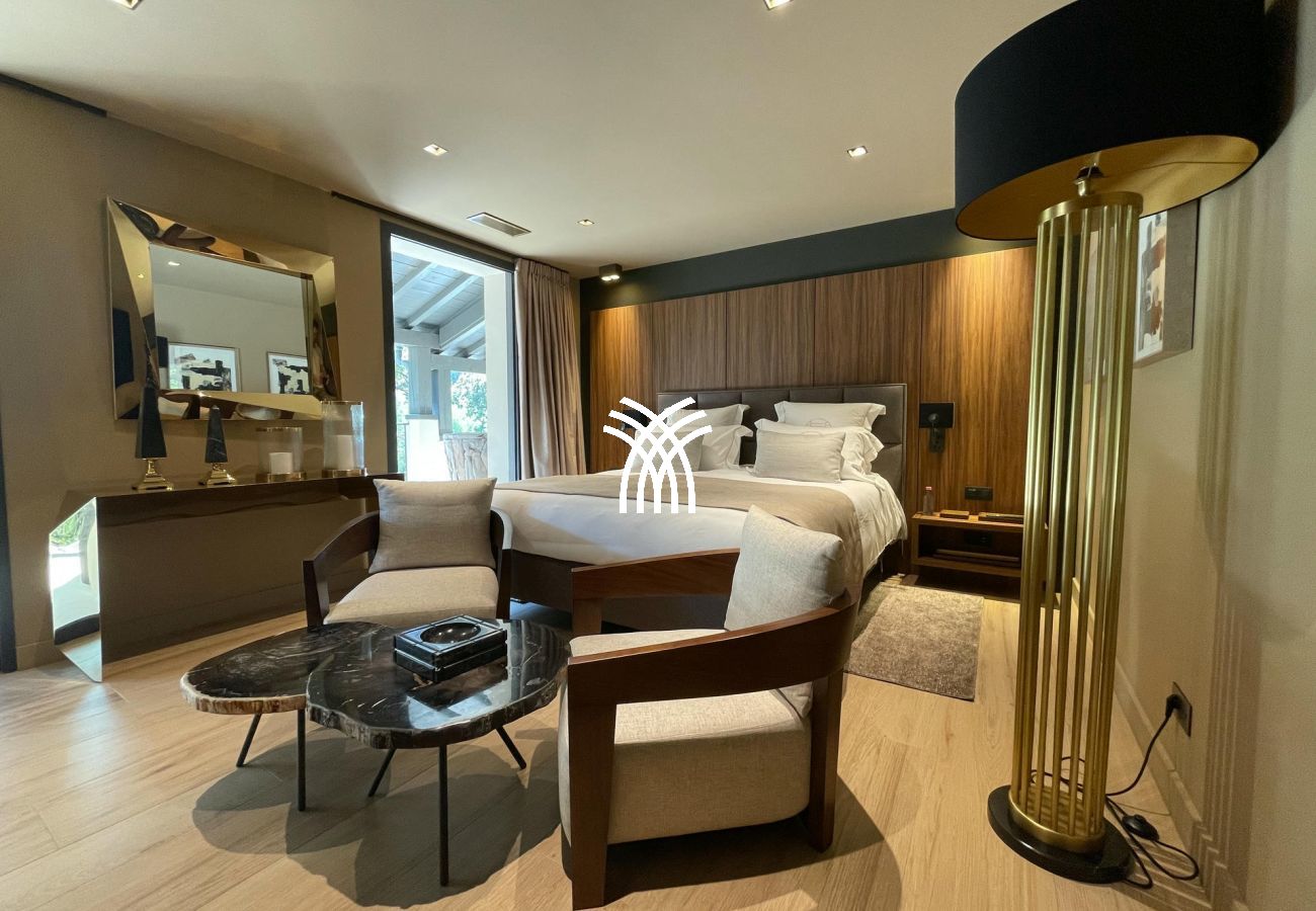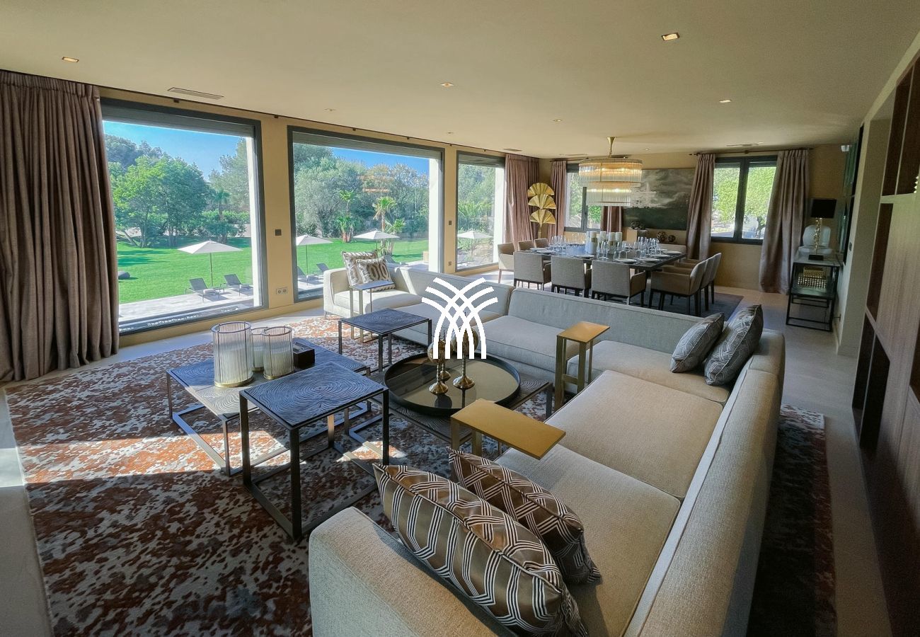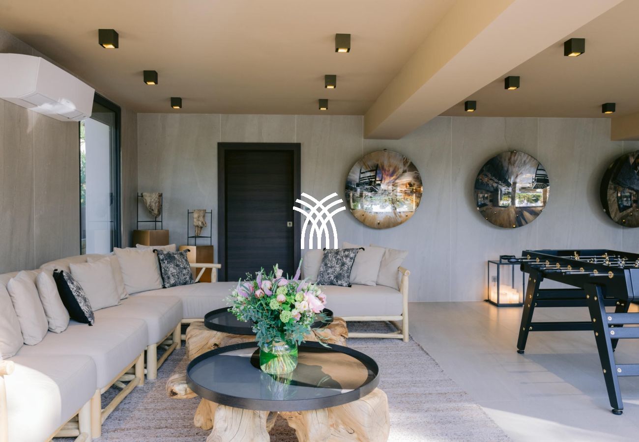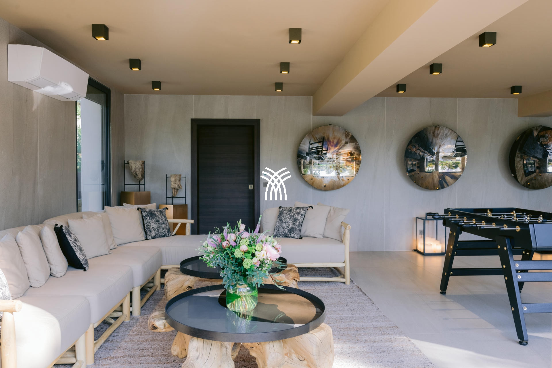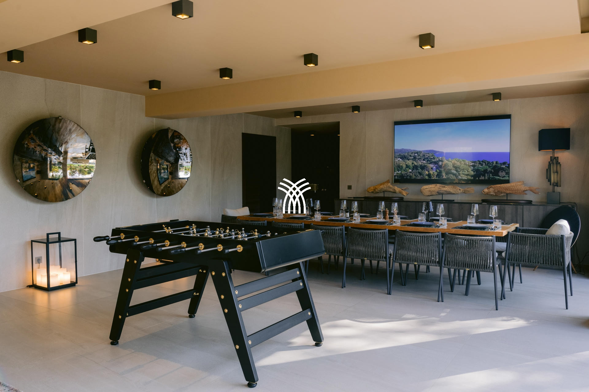 Inside, the villa boasts seven elegant suites, including two with independent access, ensuring absolute comfort and privacy. The spacious living room and sunlit dining area invite relaxation, while a gym and a massage room enhance the well-being experience in this exceptional residence.
