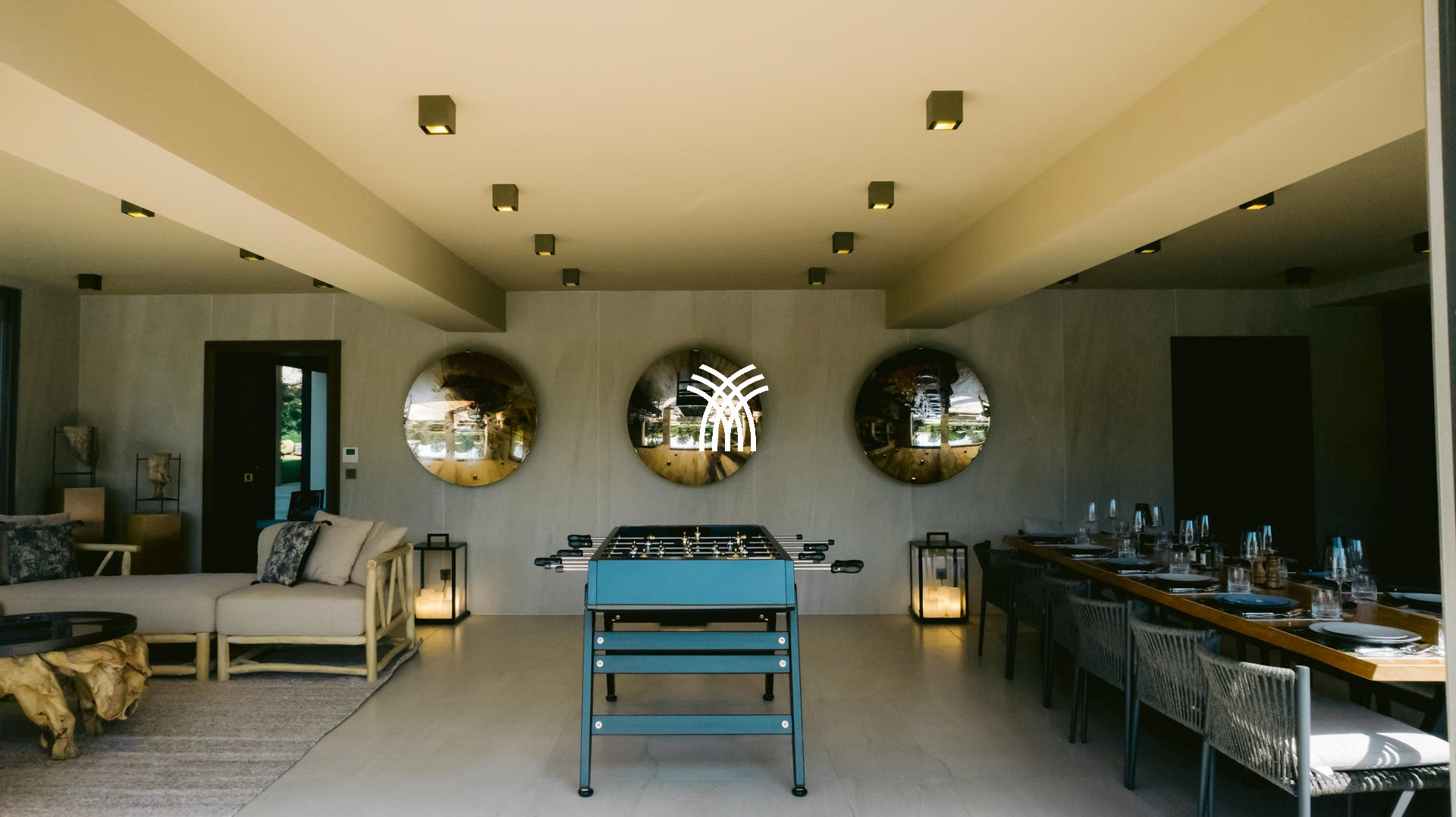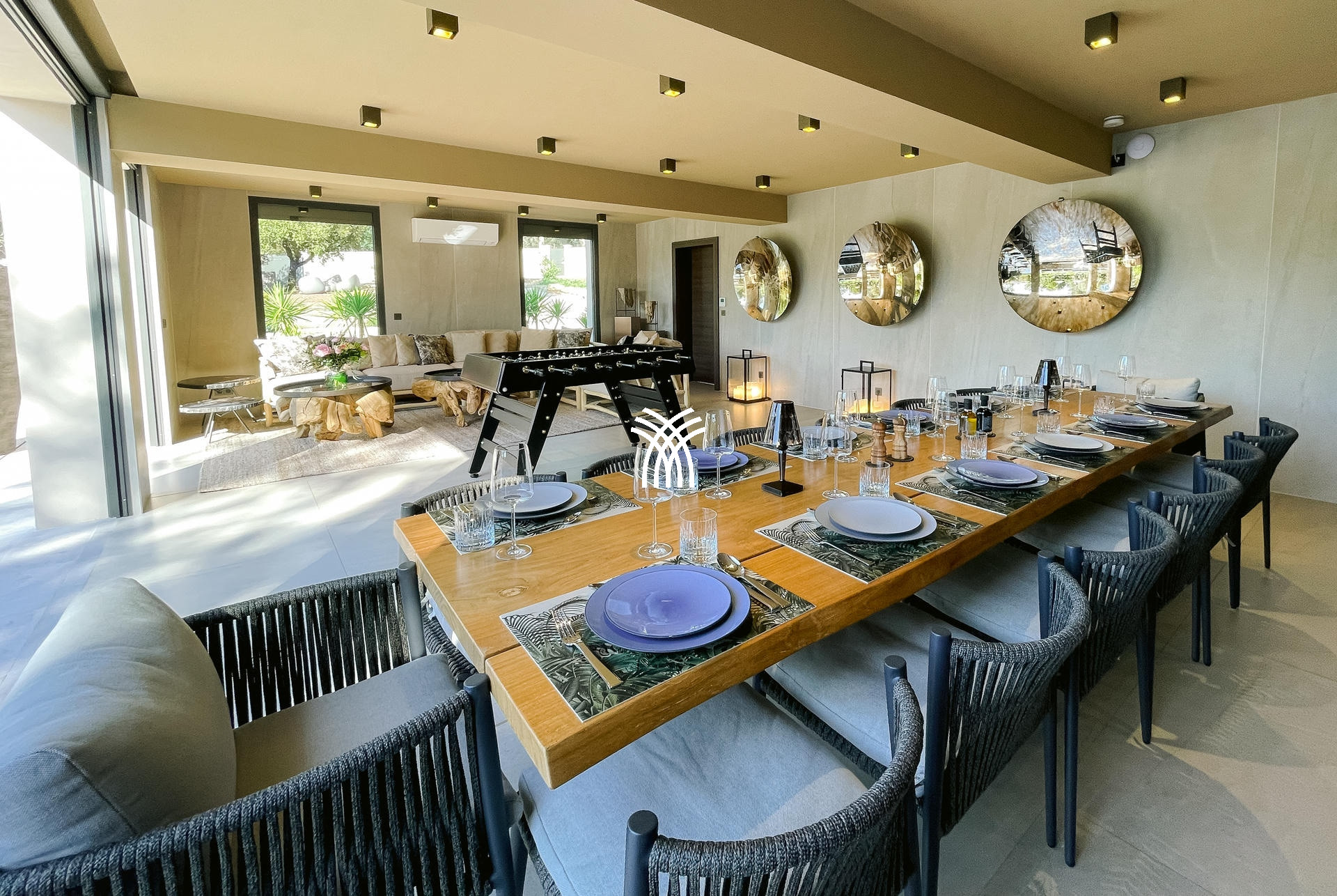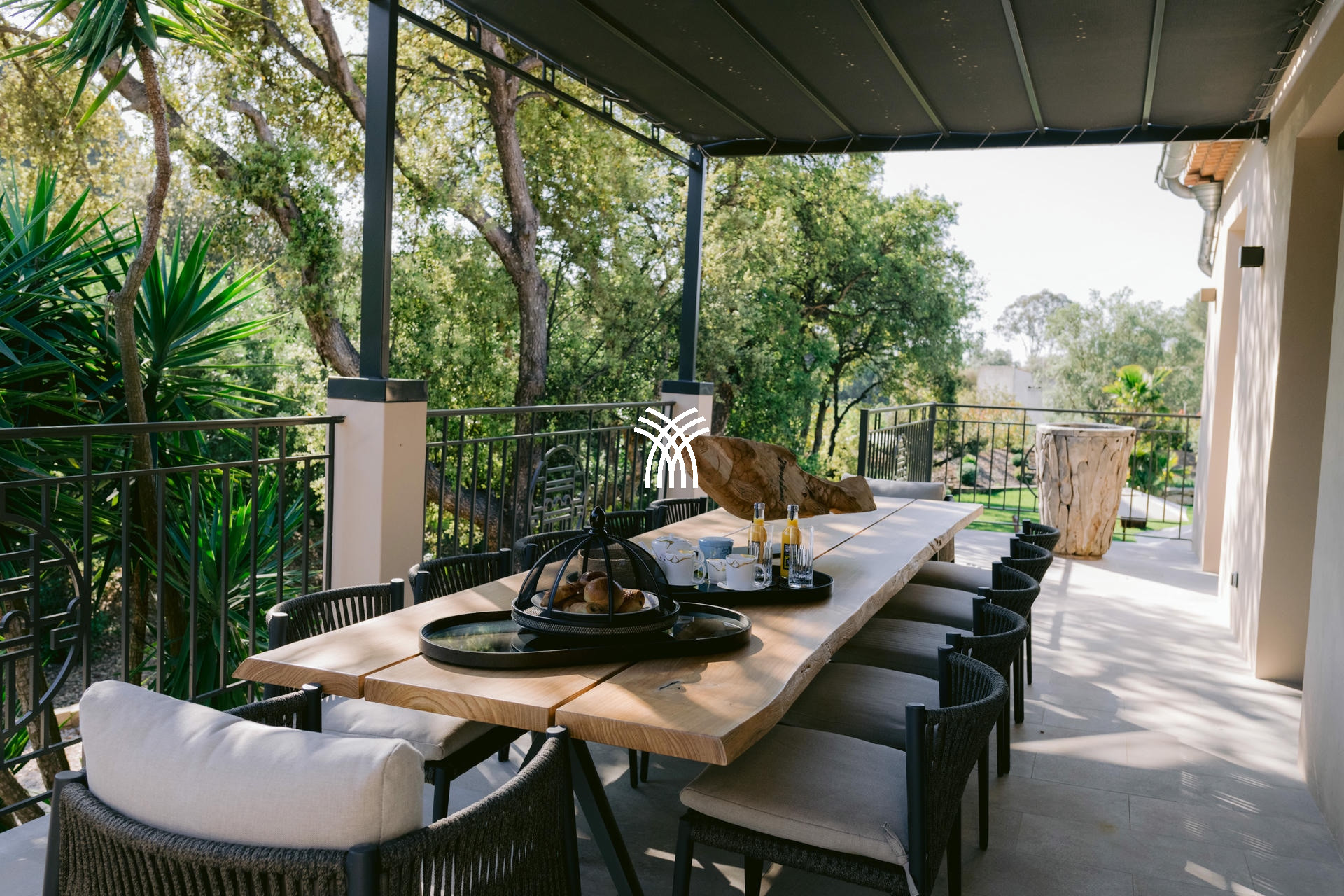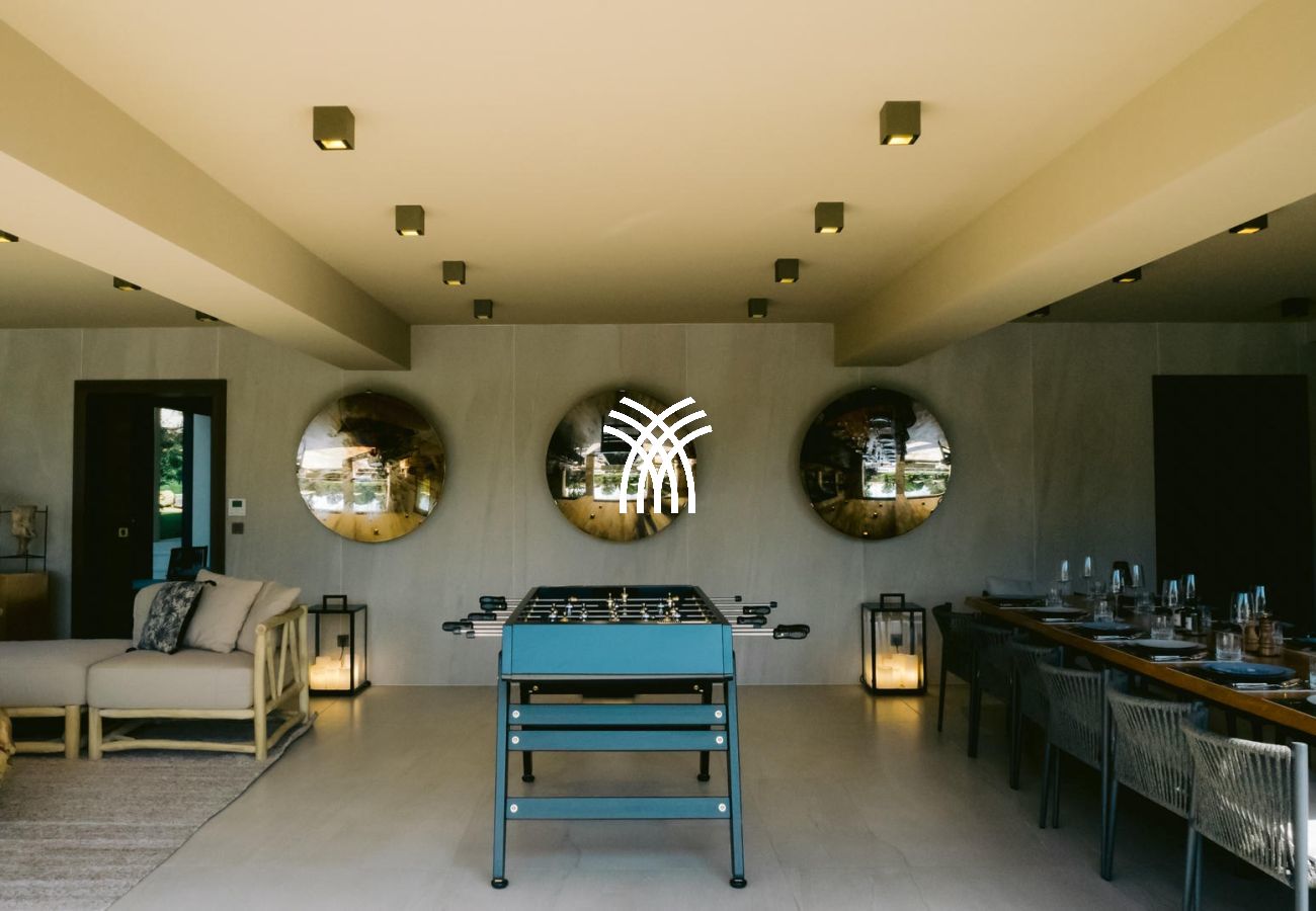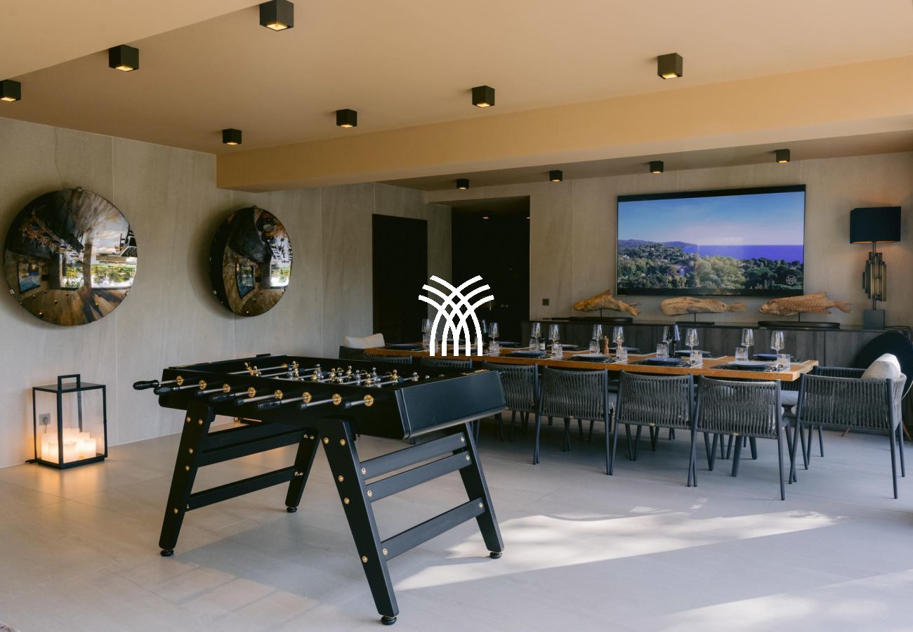 Inside, the villa boasts seven elegant suites, including two with independent access, ensuring absolute comfort and privacy. The spacious living room and sunlit dining area invite relaxation, while a gym and a massage room enhance the well-being experience in this exceptional residence.