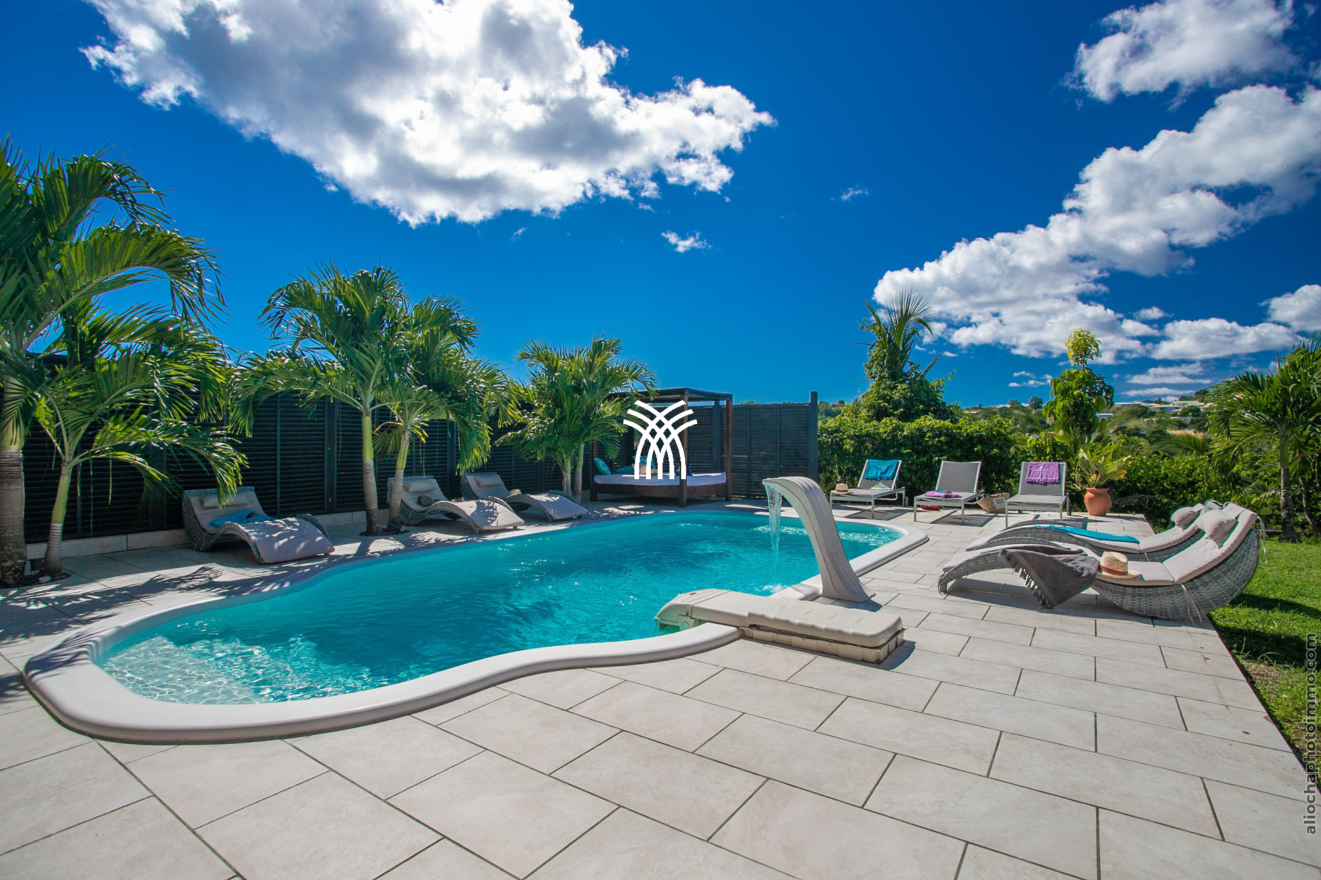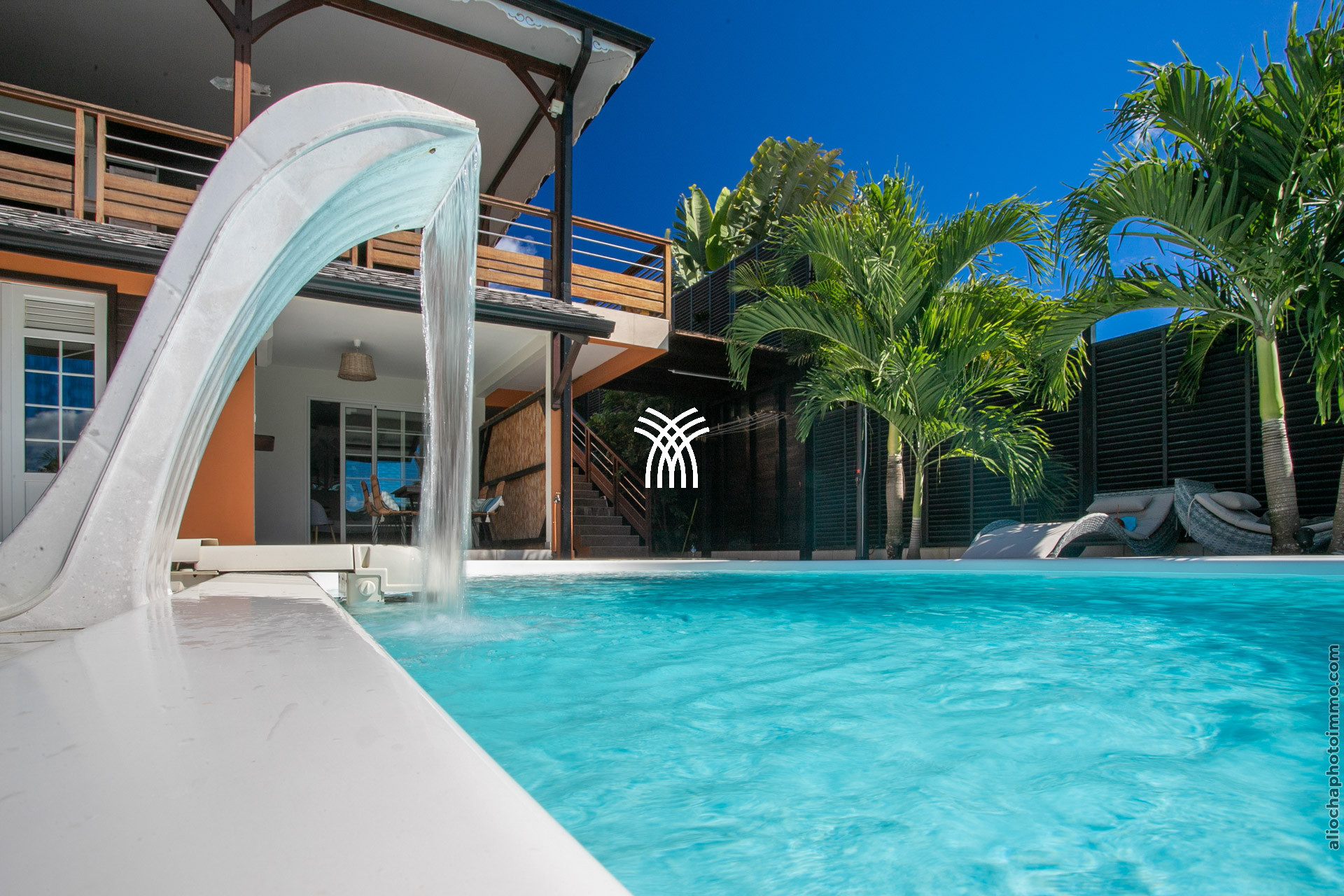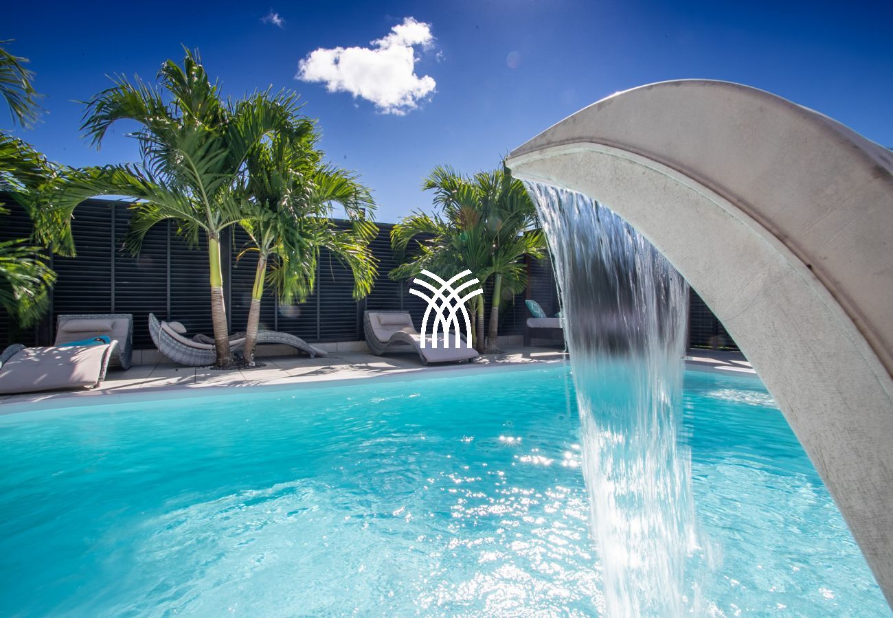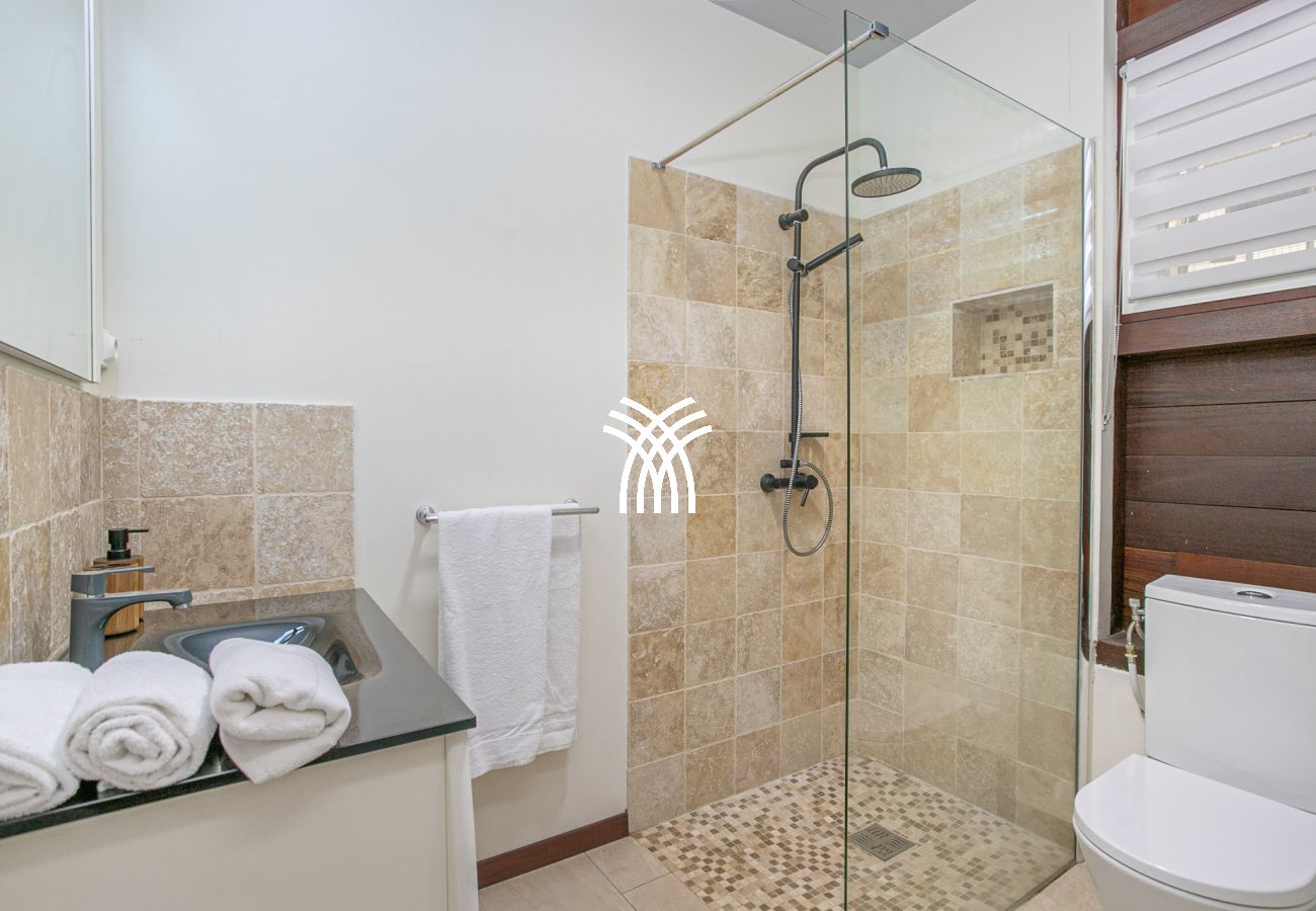 The villa's 60 m² terrace is a true living space, sometimes a lounge, sometimes a dining room, where you can enjoy the softness of the tropical climate. From the terrace, admire the green shades of the surrounding vegetation, a setting conducive to relaxation and daydreaming. Below, a pool beautifully integrated into the tropical garden invites relaxation. With its sun loungers and day bed, this space is designed for you to fully enjoy the surrounding nature.