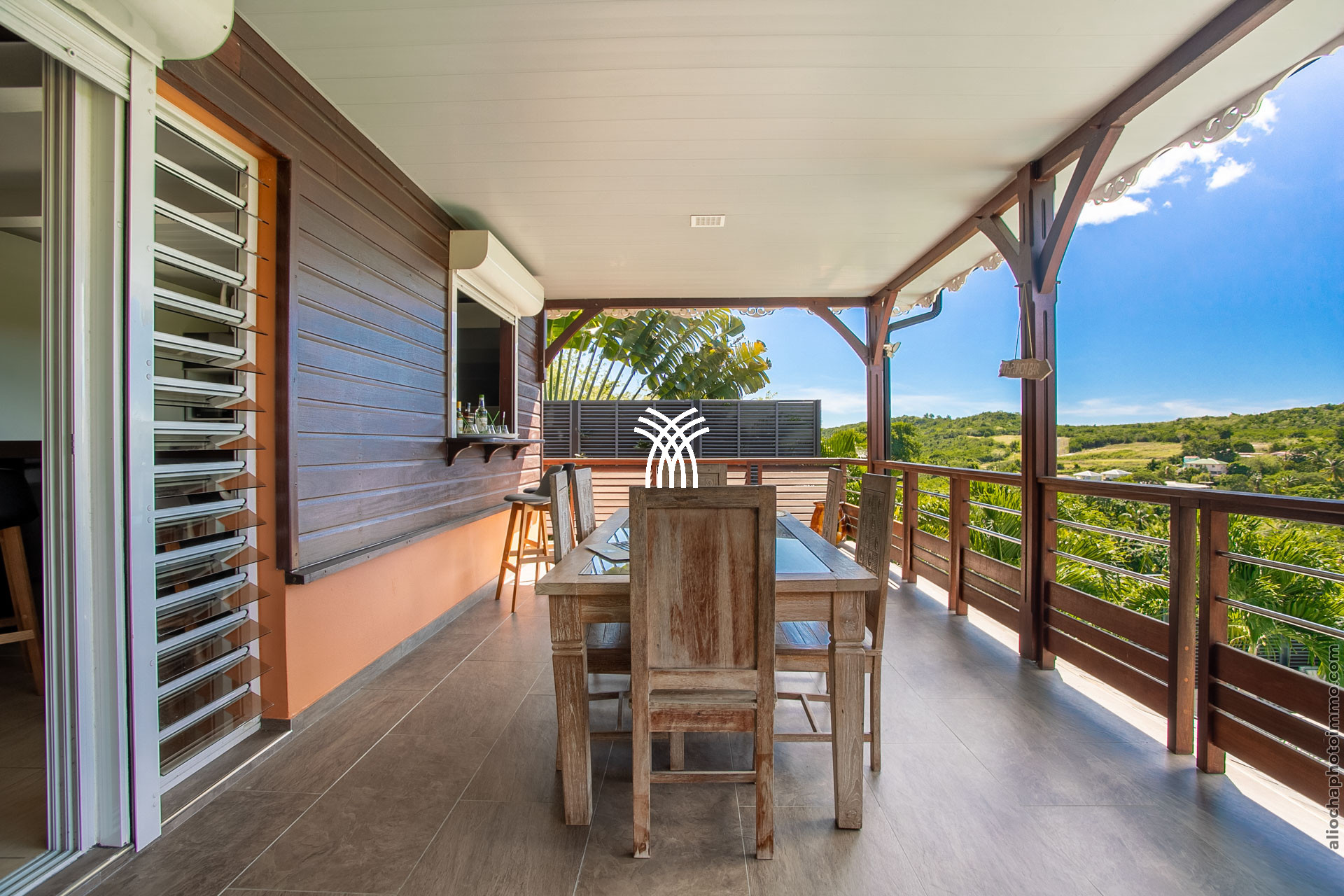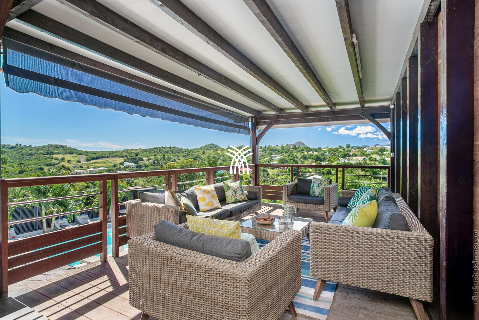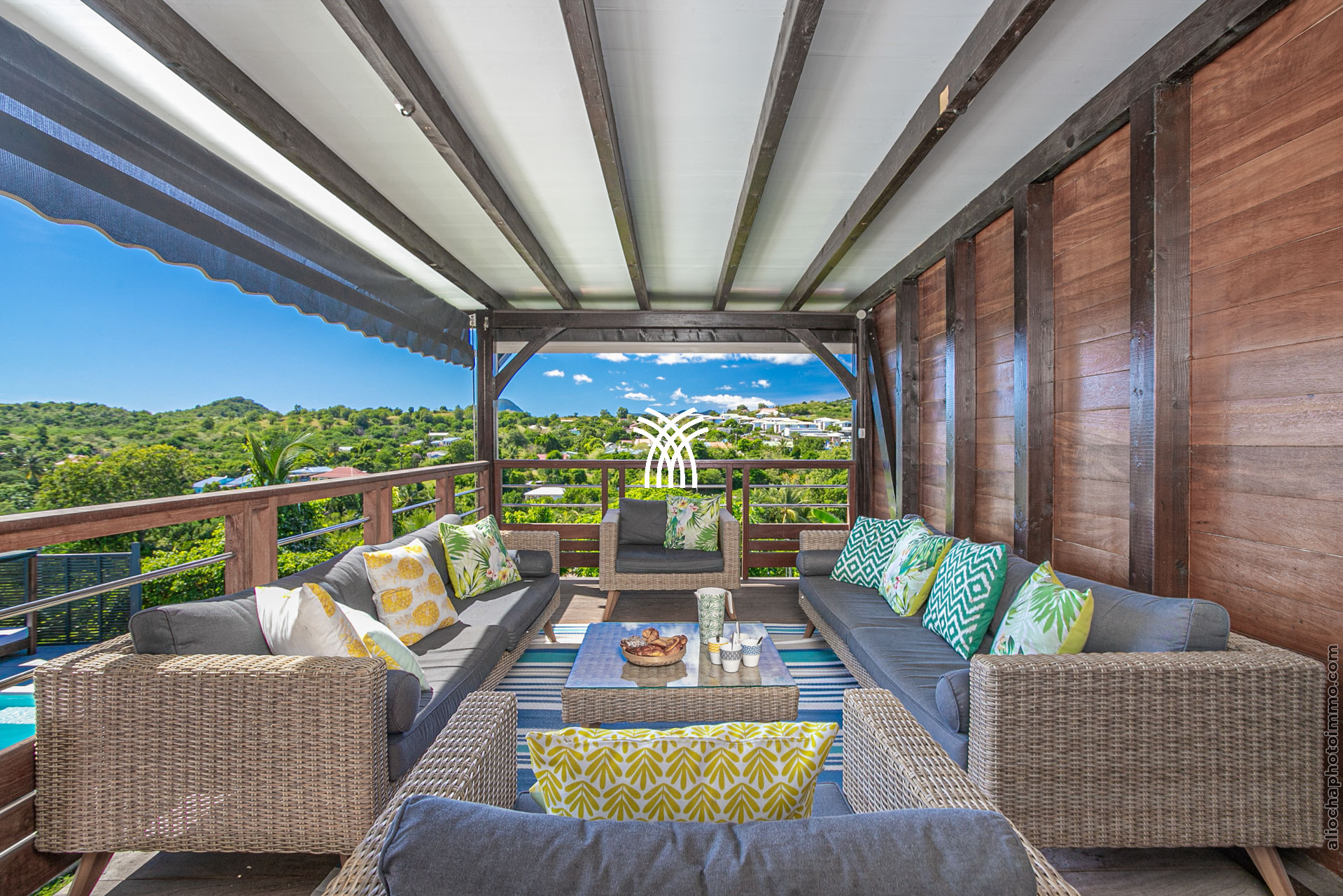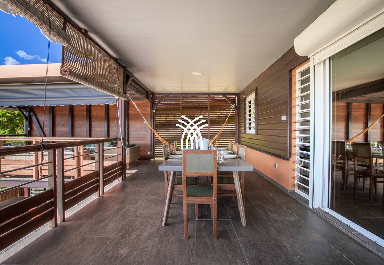 The villa's 60 m² terrace is a true living space, sometimes a lounge, sometimes a dining room, where you can enjoy the softness of the tropical climate. From the terrace, admire the green shades of the surrounding vegetation, a setting conducive to relaxation and daydreaming. Below, a pool beautifully integrated into the tropical garden invites relaxation. With its sun loungers and day bed, this space is designed for you to fully enjoy the surrounding nature.