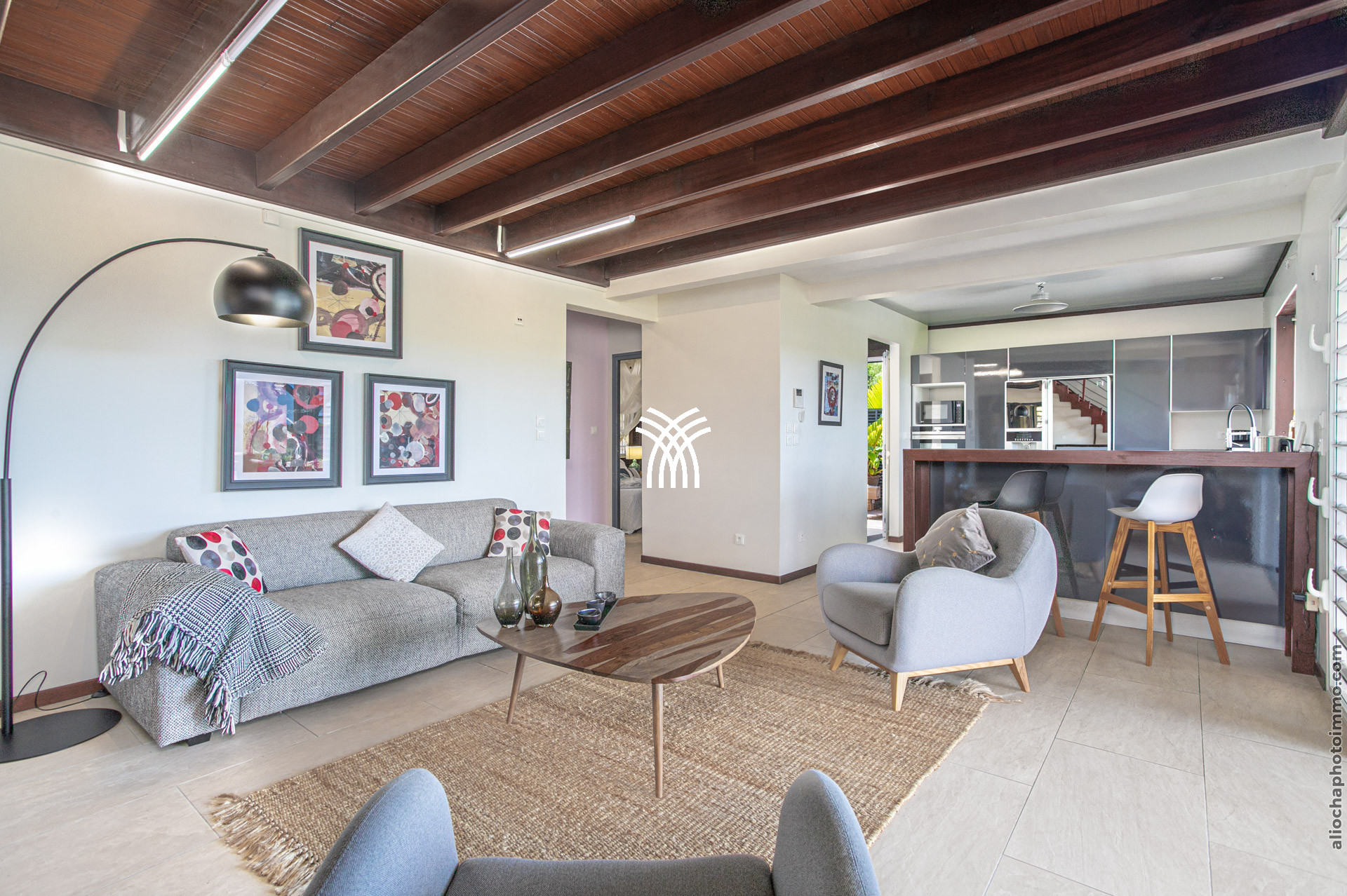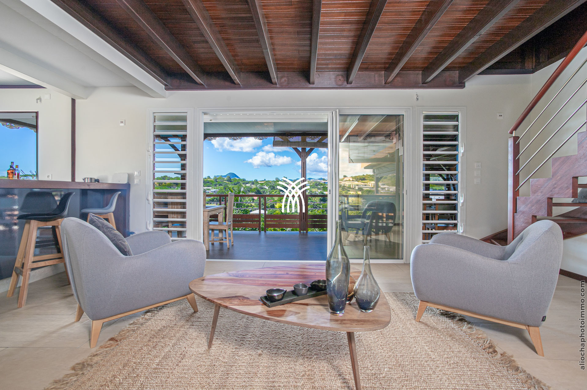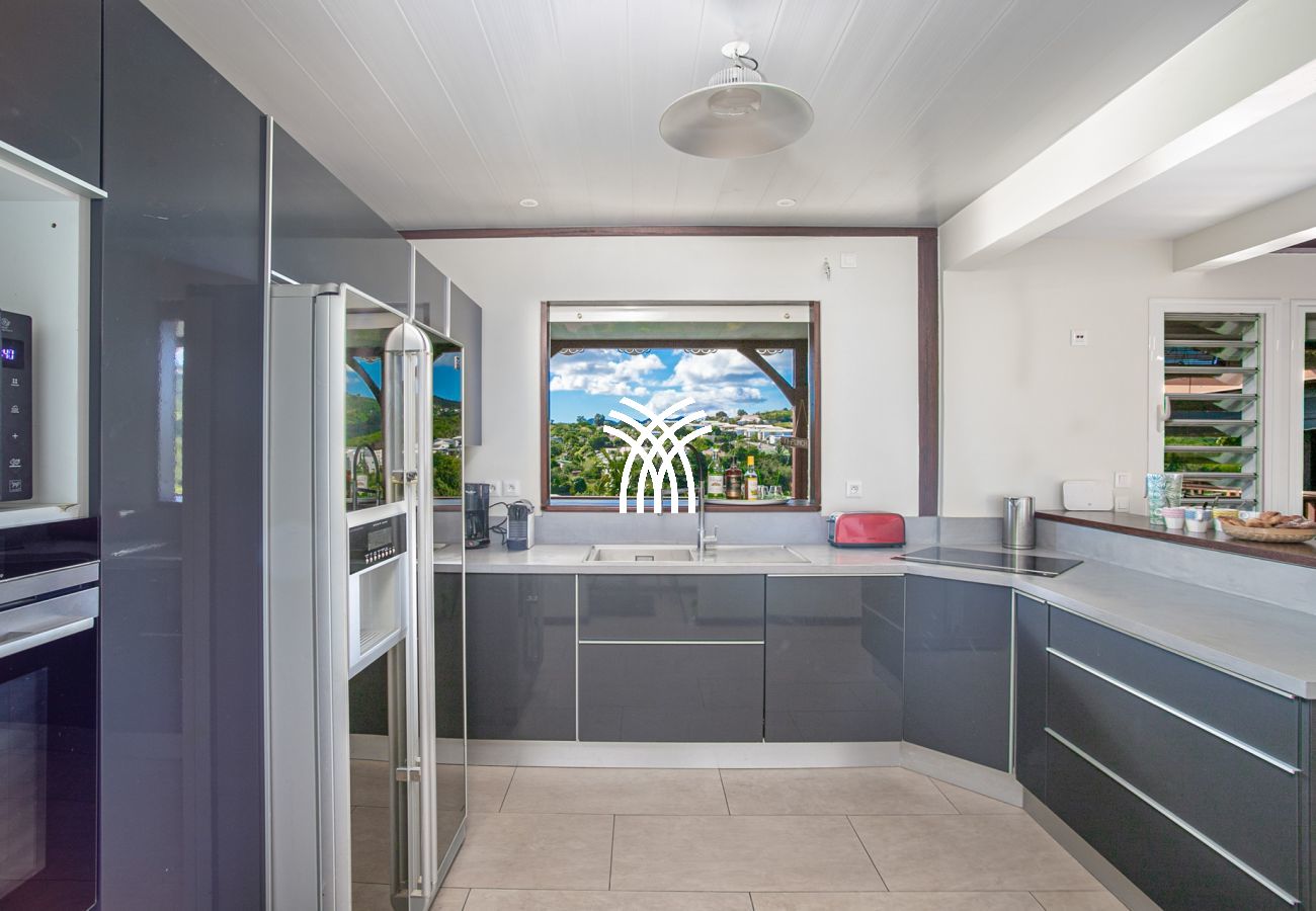 The living room and kitchen merge to create a friendly living space open to the outside. This space allows you to enjoy a relaxing view of the tropical garden and the famous Diamond Rock, also known as the "Lying Woman". In the living room, you'll find a plush sofa, comfortable armchairs, a coconut rug, a wooden coffee table, and a television, creating a place conducive to relaxation. The modern kitchen is fully equipped to meet all your culinary needs, with a bar and stools for convivial moments.