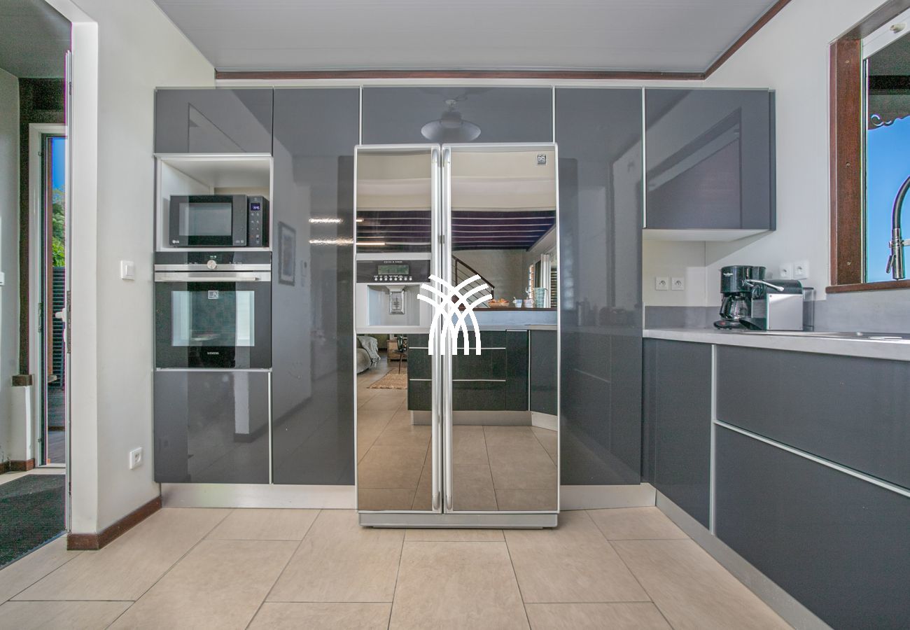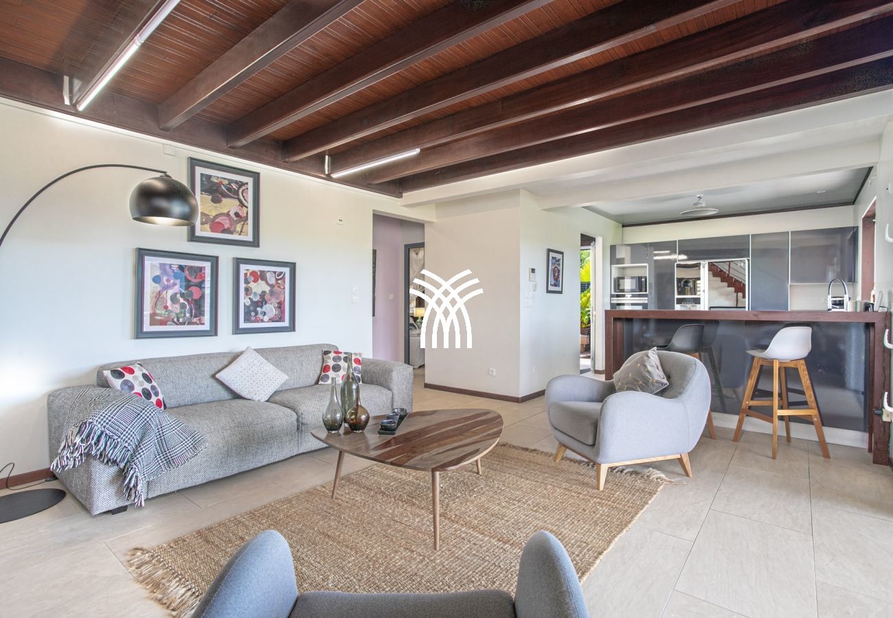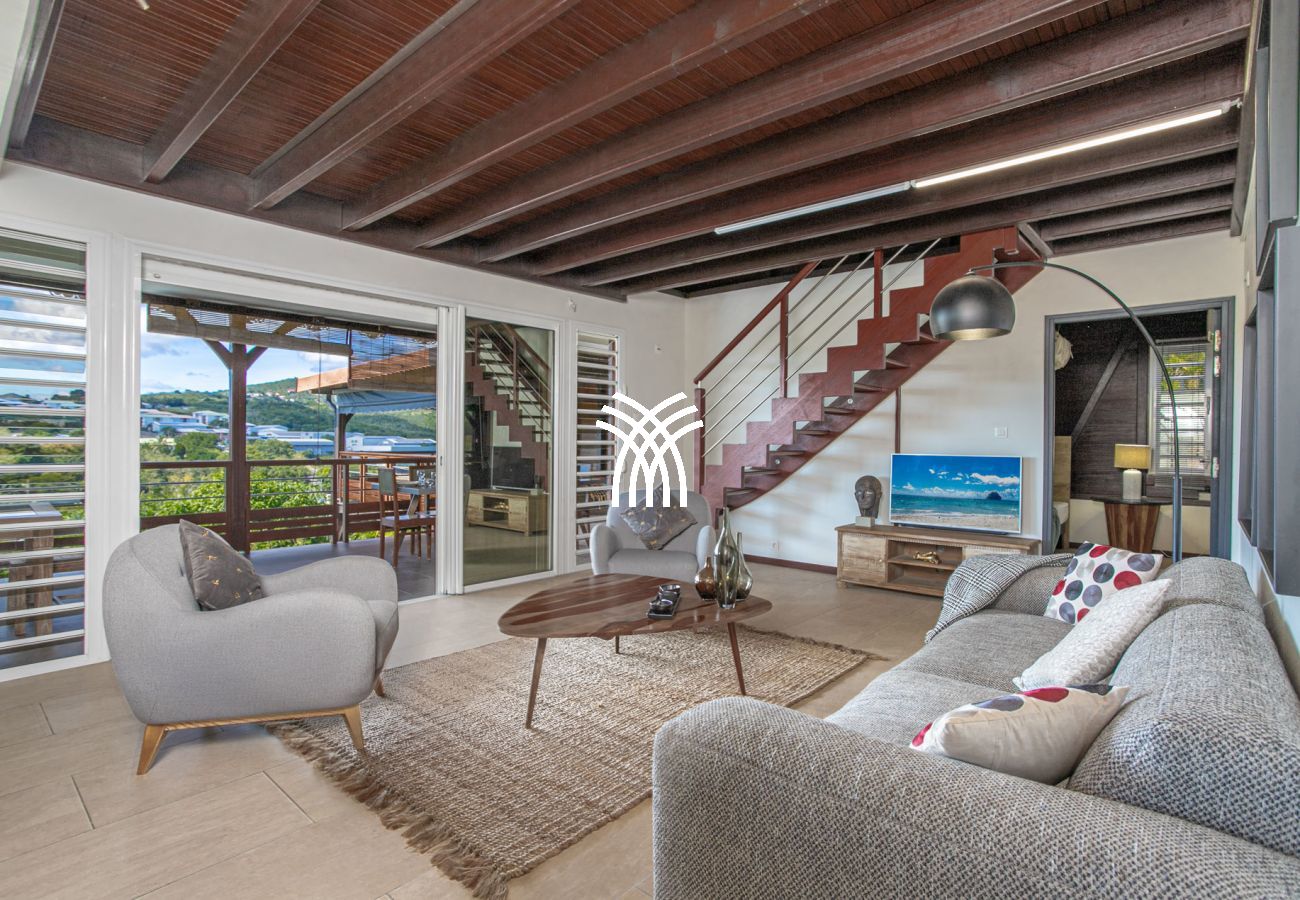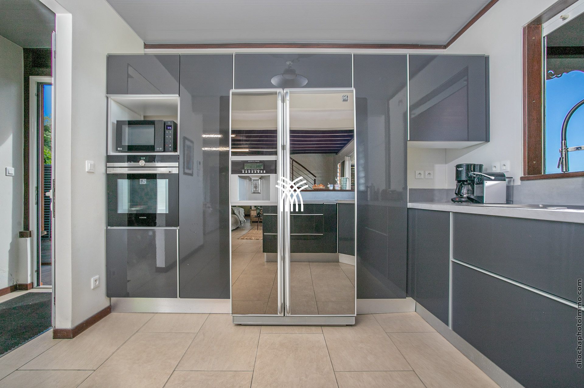 The living room and kitchen merge to create a friendly living space open to the outside. This space allows you to enjoy a relaxing view of the tropical garden and the famous Diamond Rock, also known as the "Lying Woman". In the living room, you'll find a plush sofa, comfortable armchairs, a coconut rug, a wooden coffee table, and a television, creating a place conducive to relaxation. The modern kitchen is fully equipped to meet all your culinary needs, with a bar and stools for convivial moments.