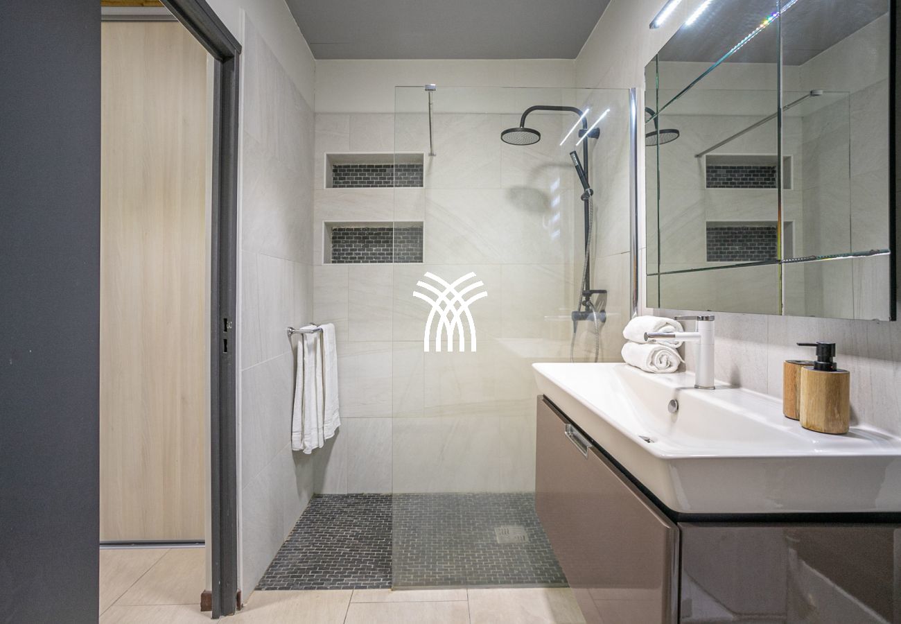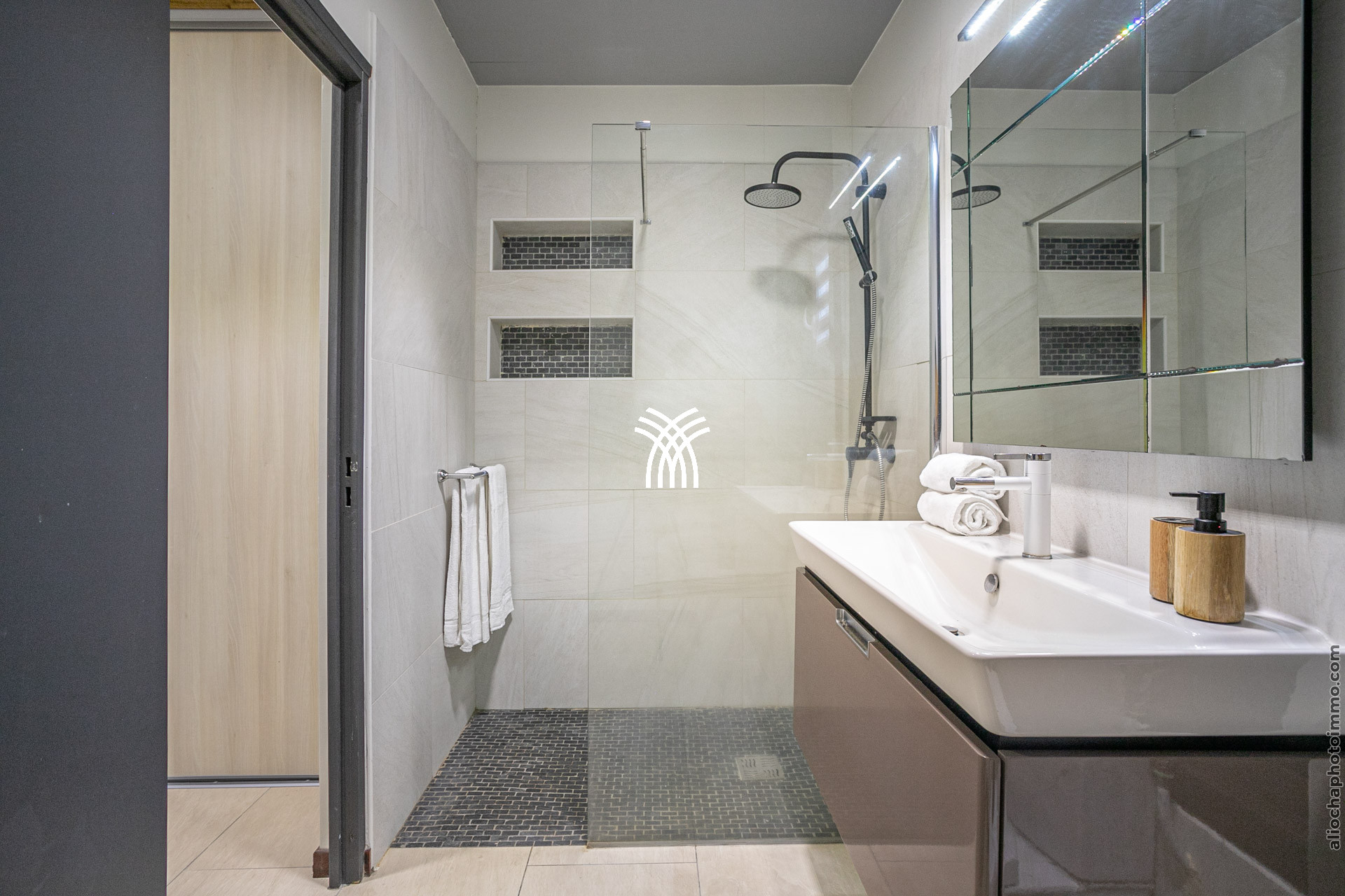 Three bedrooms are located on the terrace level, including two double rooms and one twin room. The master suite, located on the first floor, is spacious and refined. The two other bedrooms are in independent T2 apartments, each with its own living area, a shower room, and a terrace overlooking the pool.